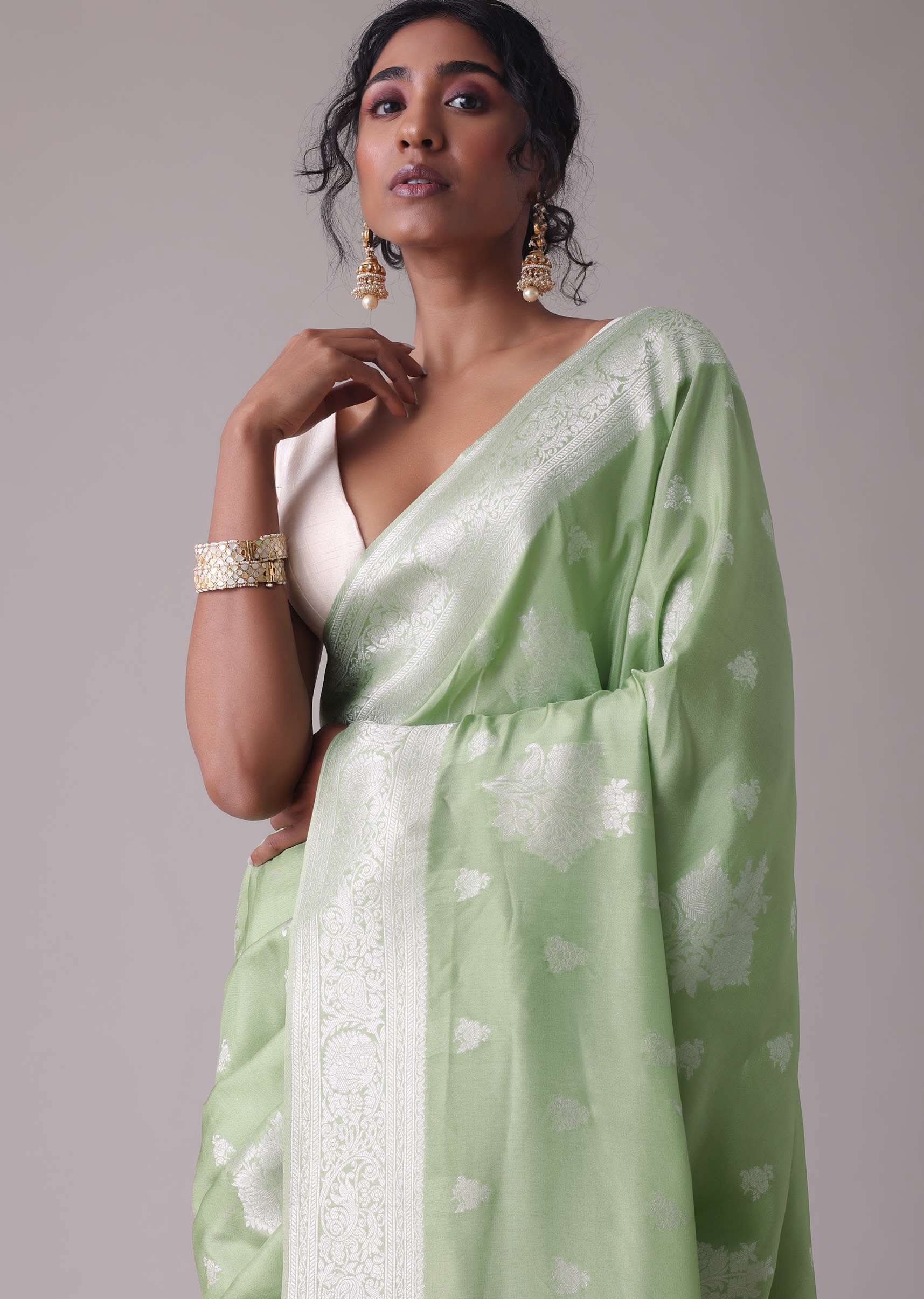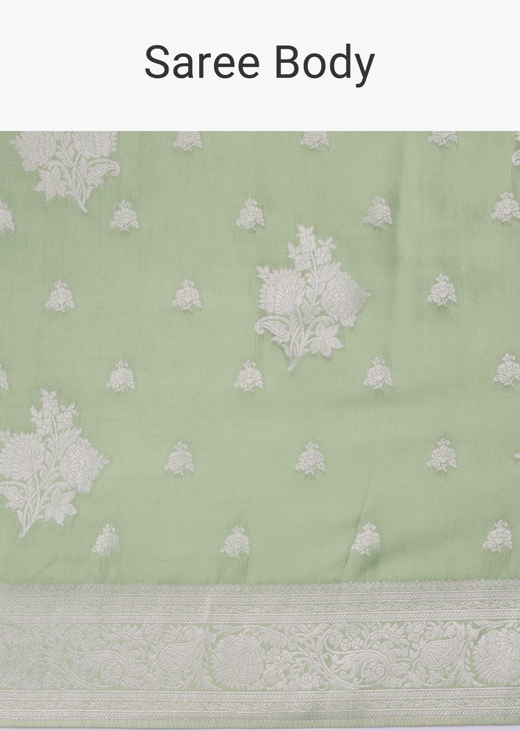 - Forest shade green saree in dola silk with silver floral weave on the border, an intricately crafted woven pallu with green tassels, and small woven buttis all over the saree.