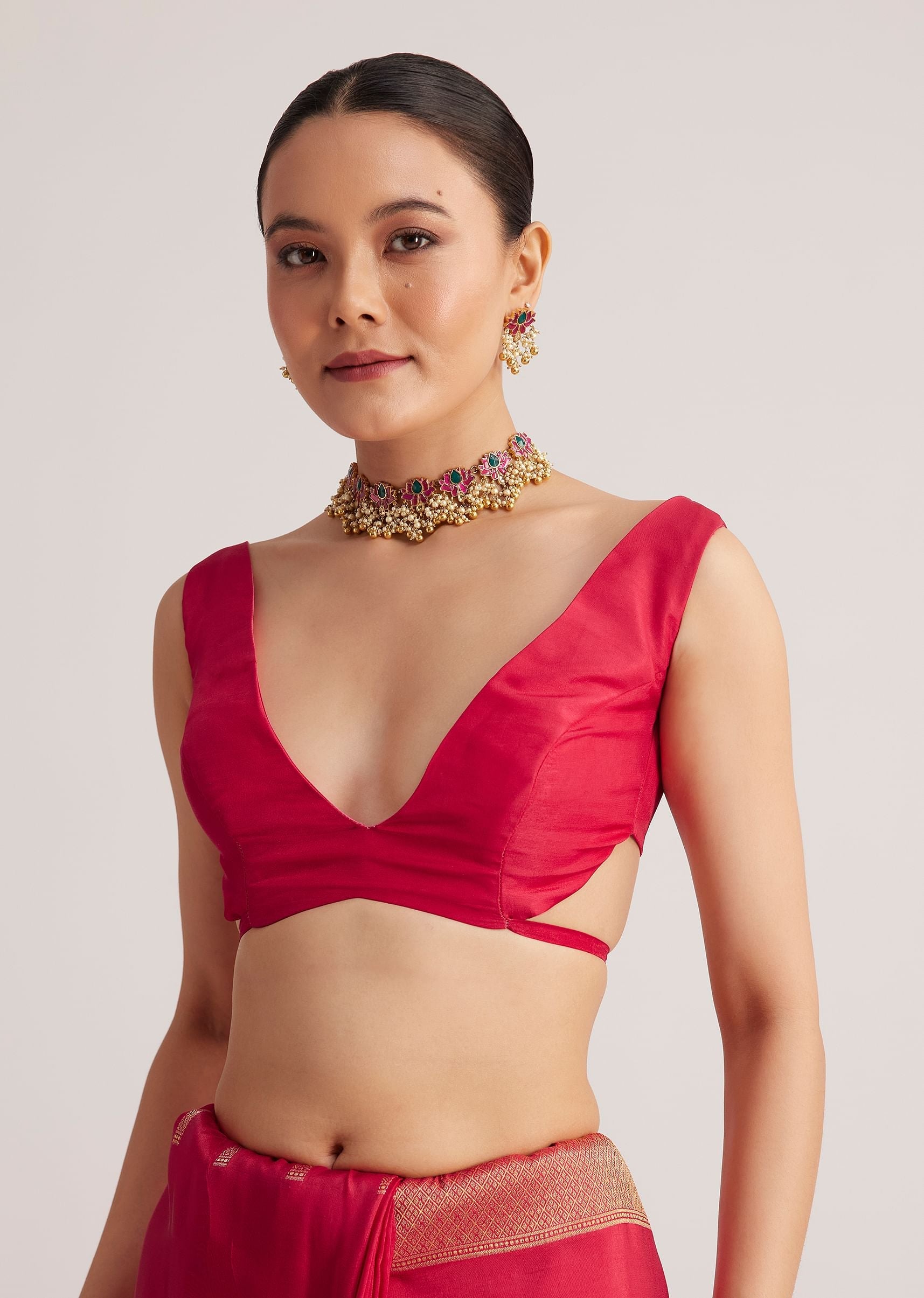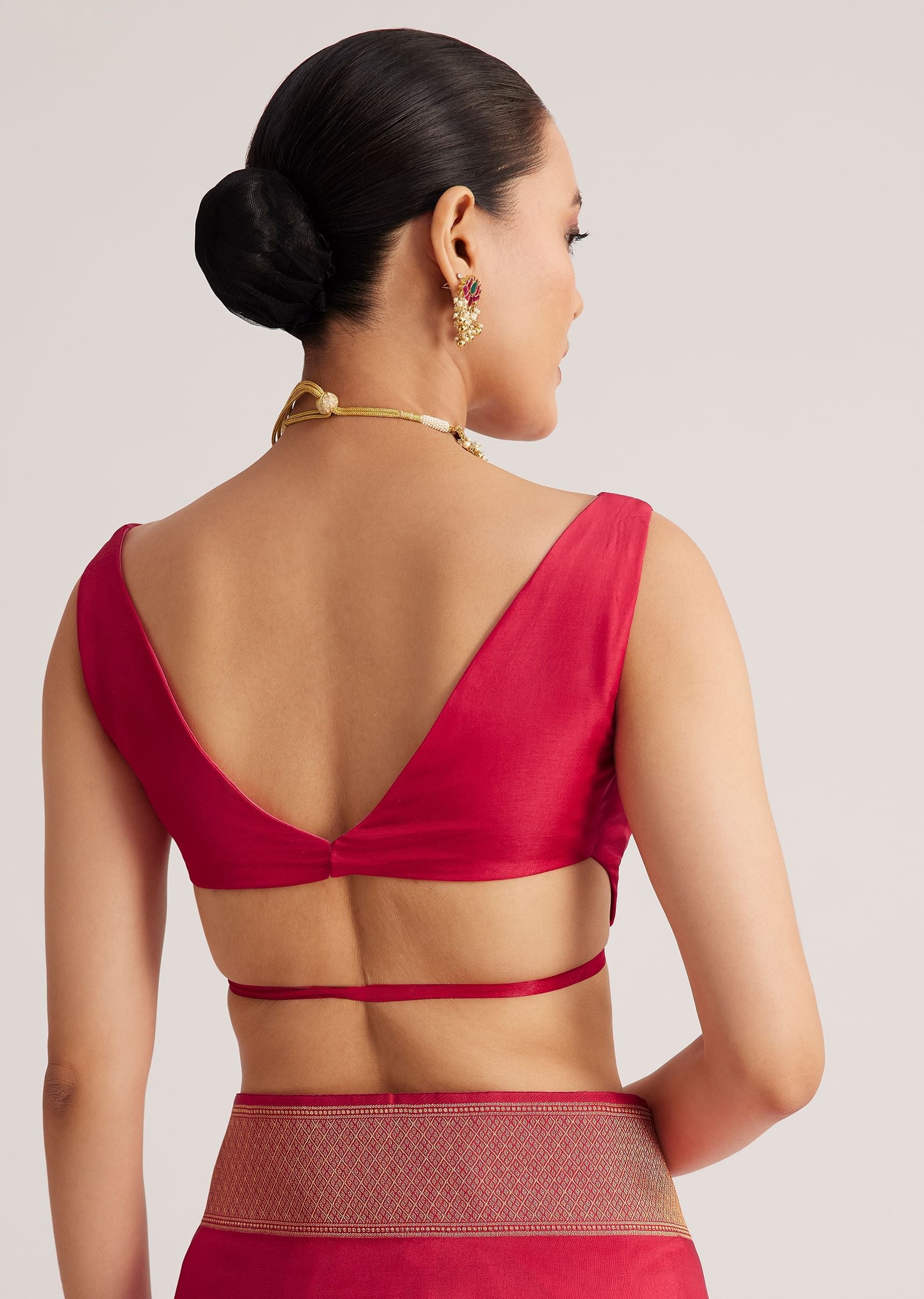 Lightweight chinon drapes easily and the finished border adds enough weight to keep the pallu in place.