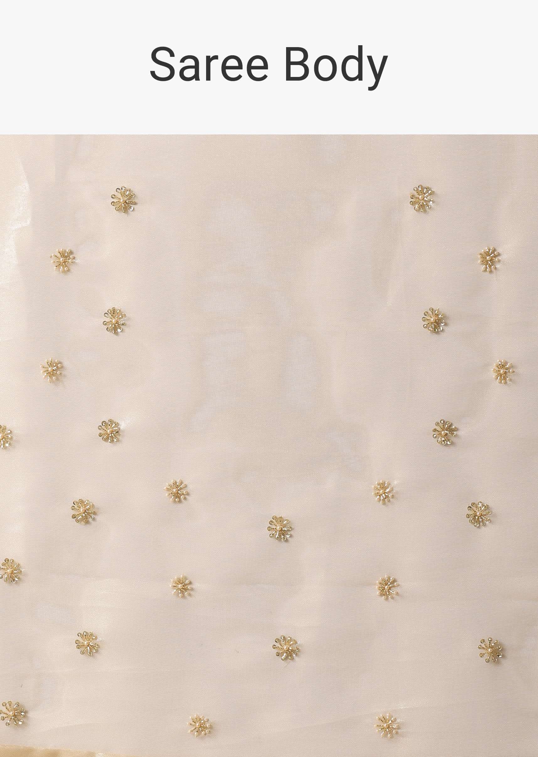 - Adding to its grandeur, the saree is adorned with a foil print along with intricate pearl and cut dana embroidery on the borders.