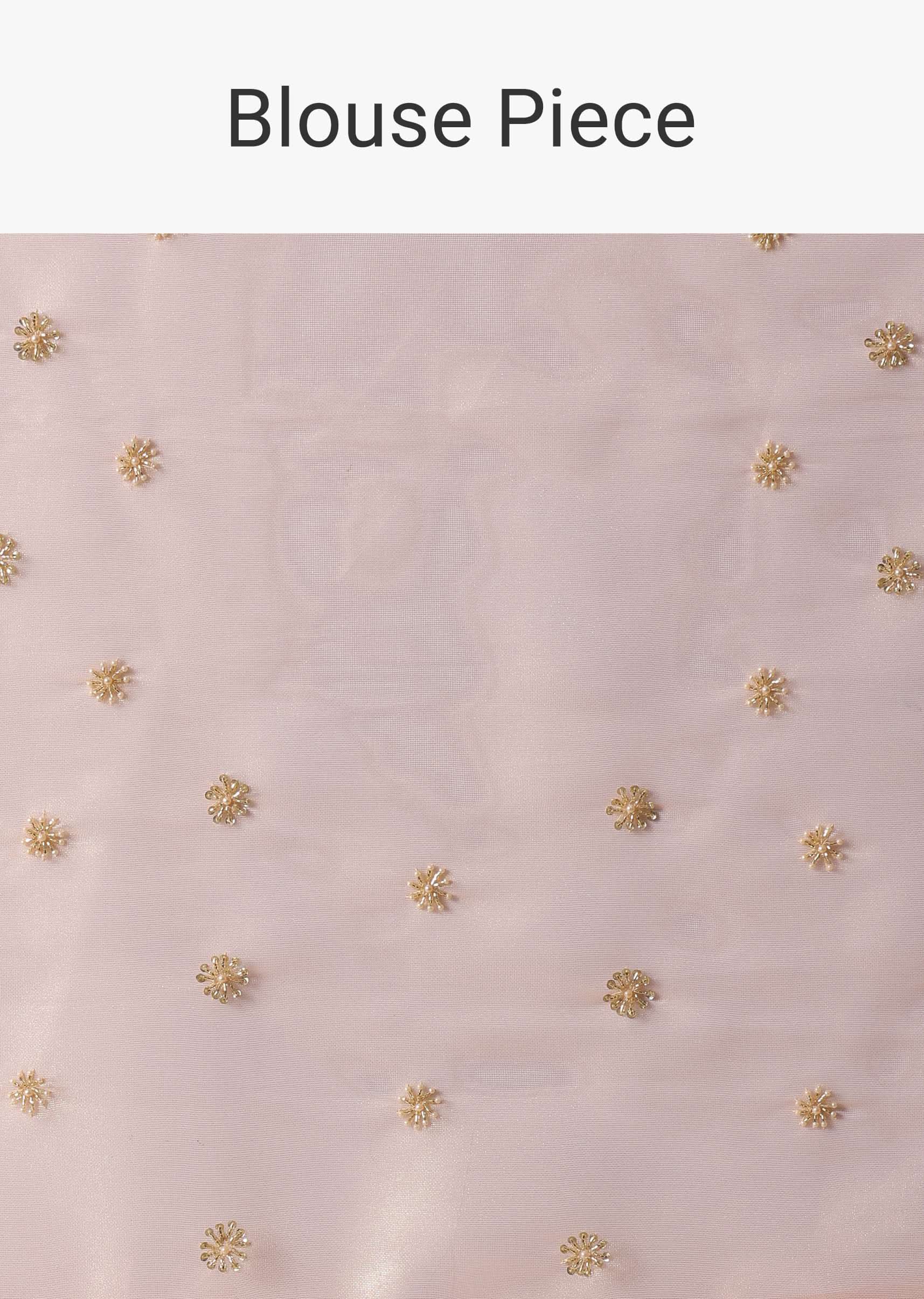 - The intricate pearl and cut dana embroidery border work adds a touch of regal charm enhancing the overall allure of the sareeThe saree comes with an unstitched blouse with a similar embroidery buttis.