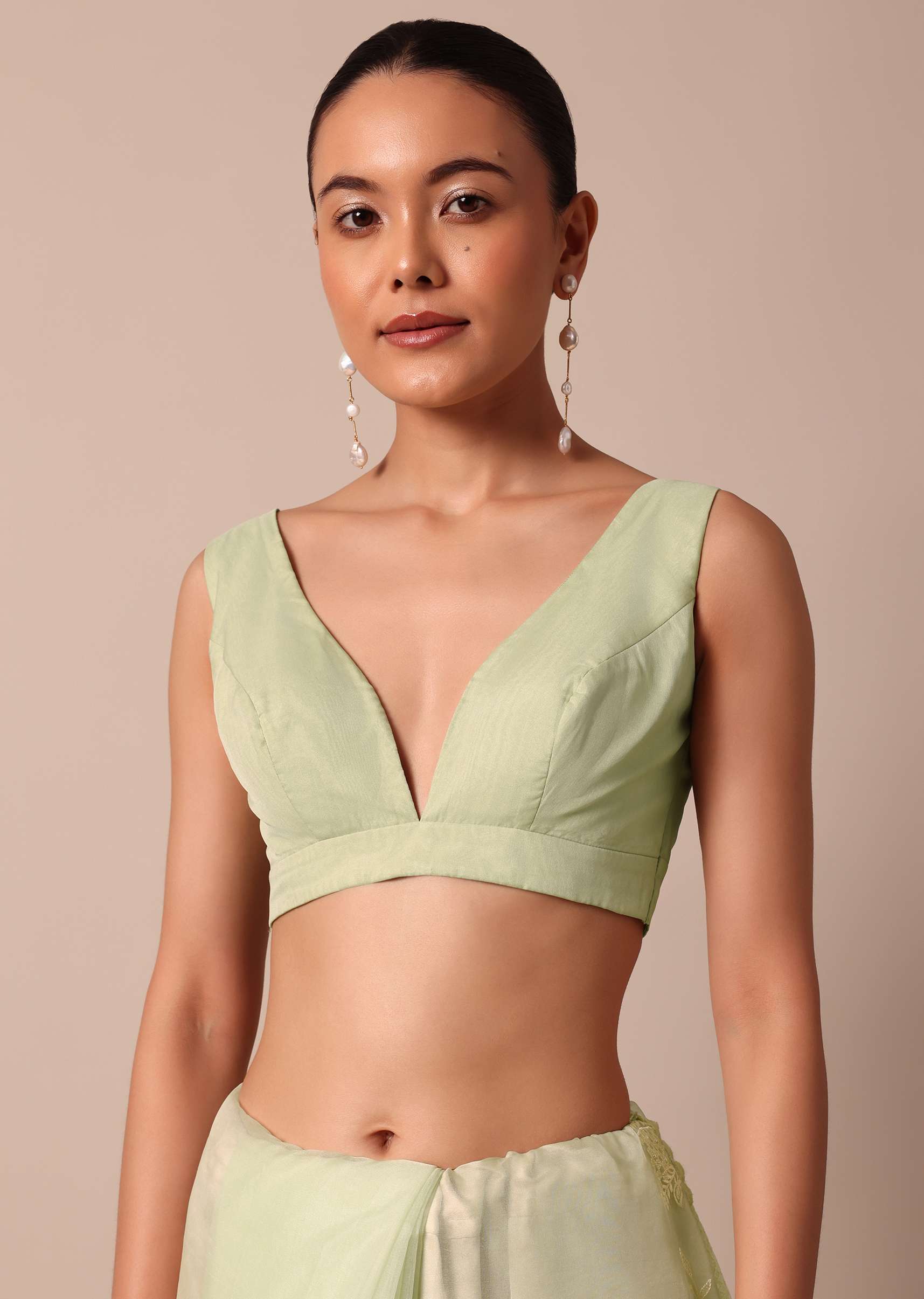 - A beautiful blend of traditions and modern designs is this sheer green saree.