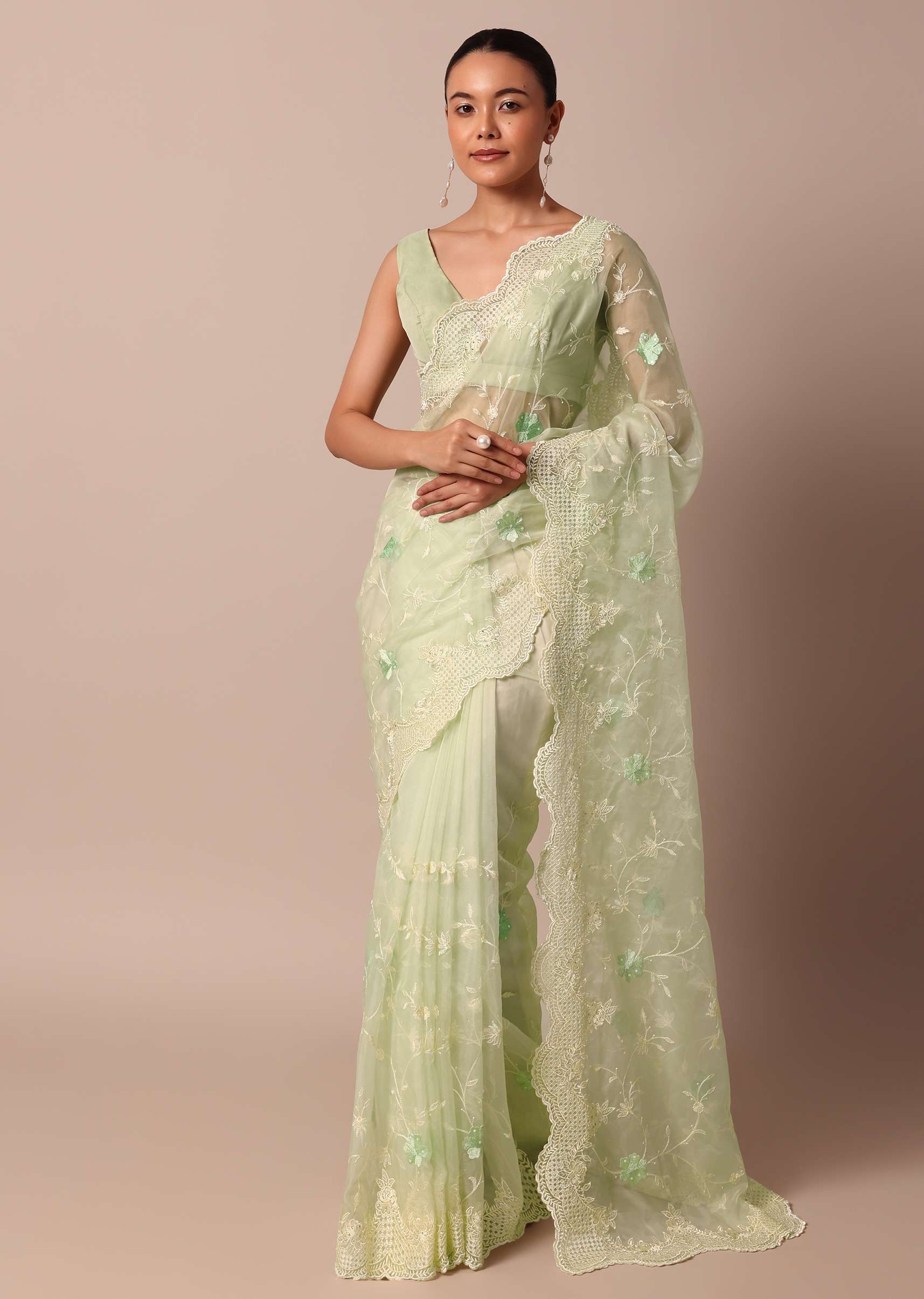 Green Chikankari Saree In Organza Silk With Resham Floral Jaal And Unstitched Blouse Fabric