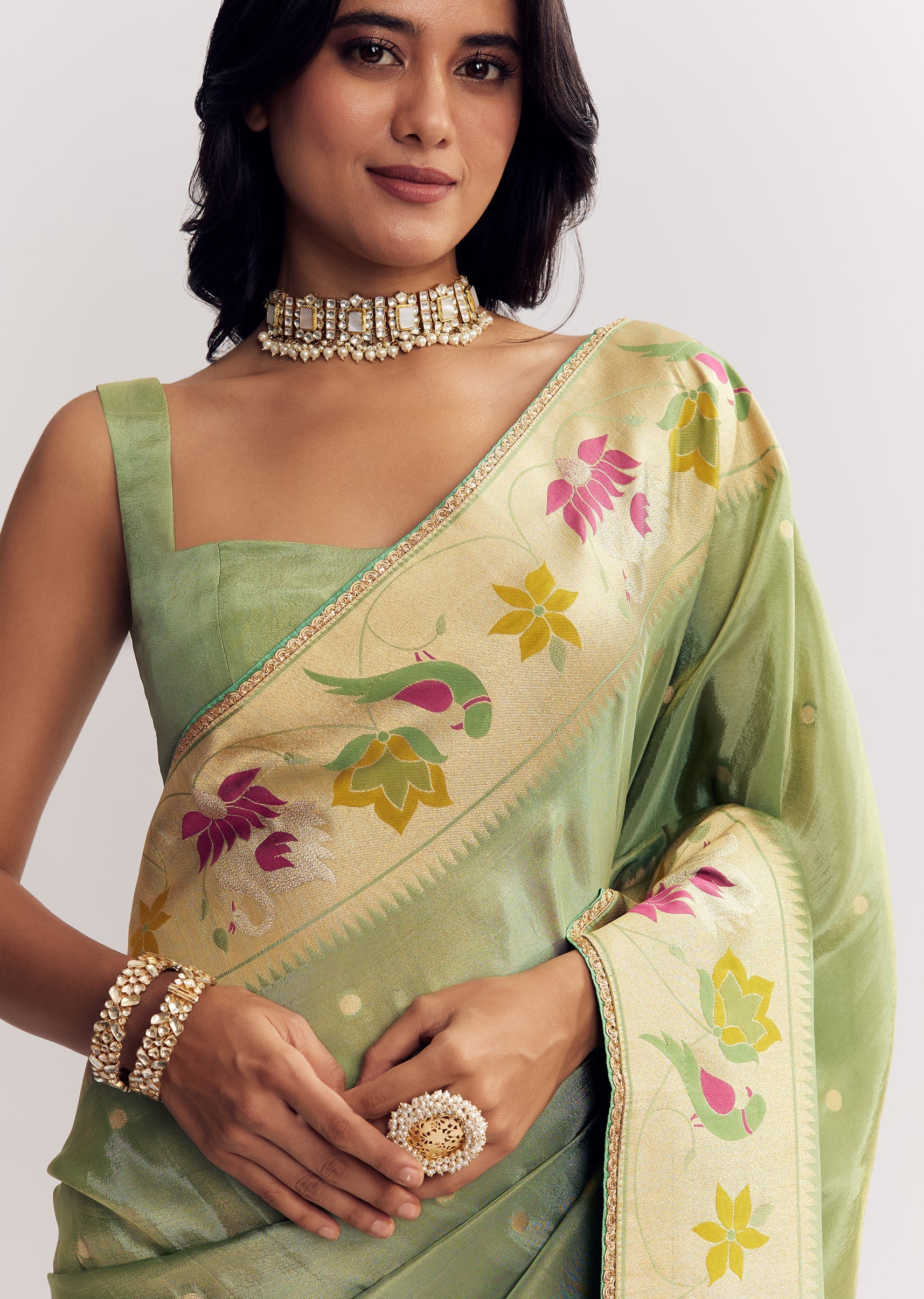 Green Dola Silk Paithani Saree With Dollar Butti And Multicolor Motif