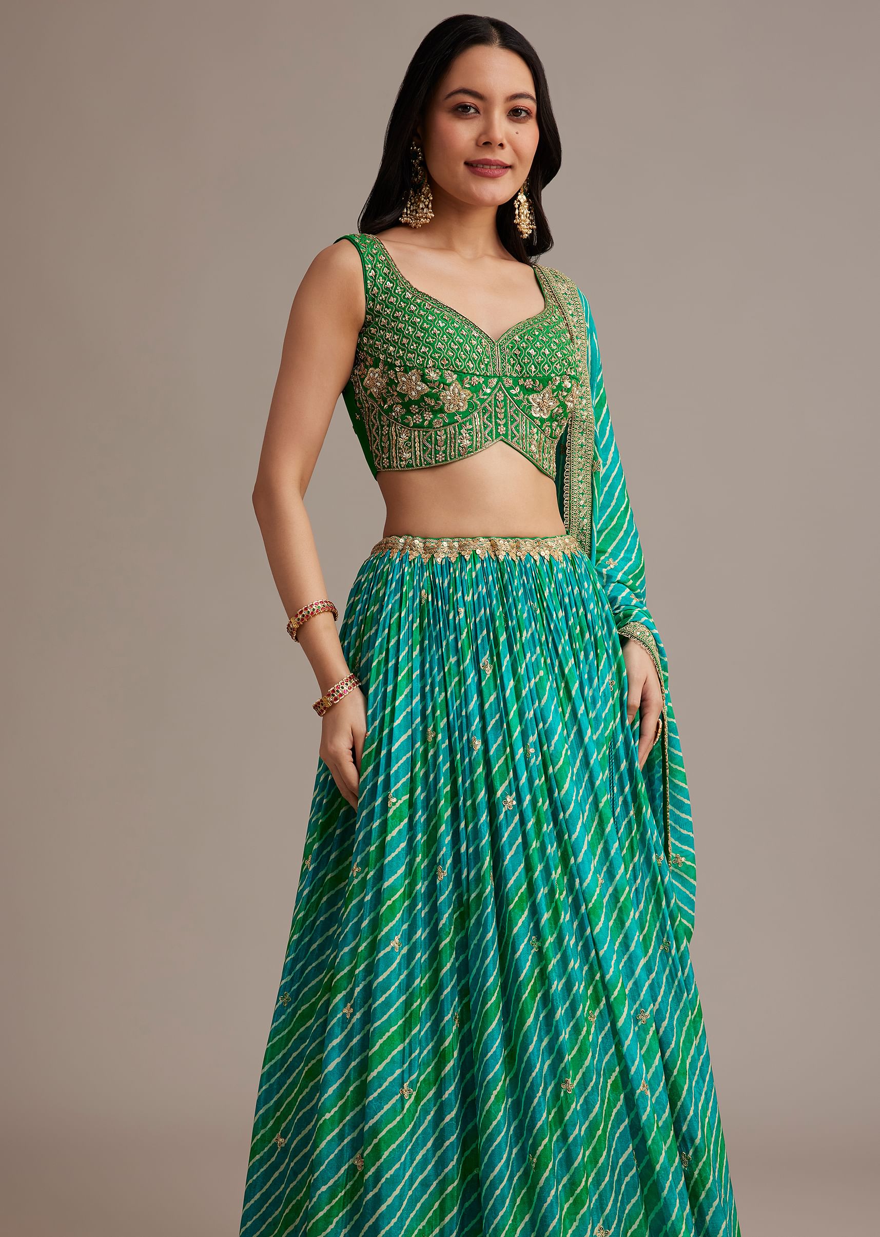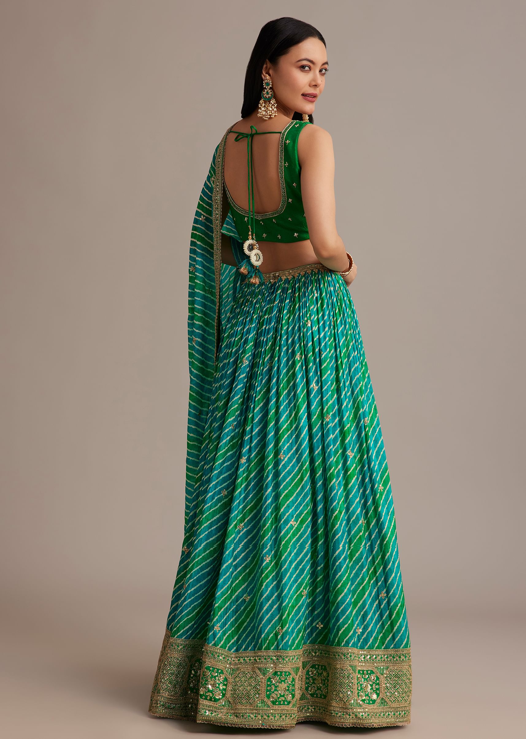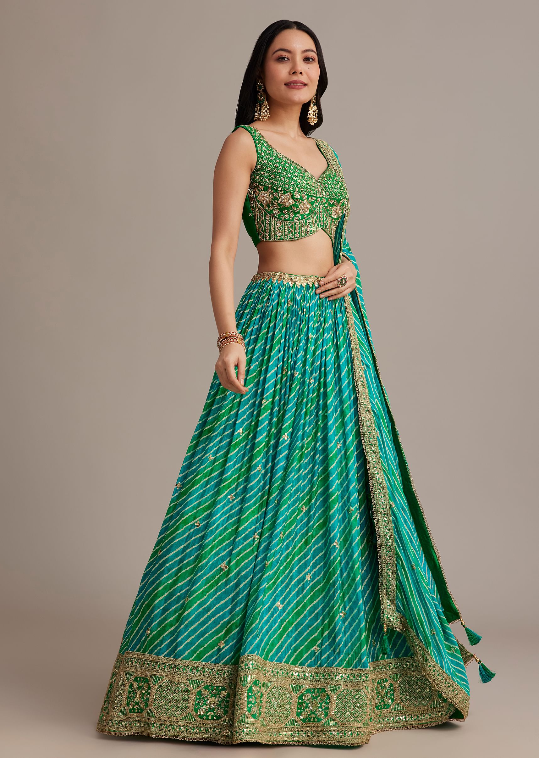 Green Leheriya Lehenga Set With Zardosi And Sequins Work