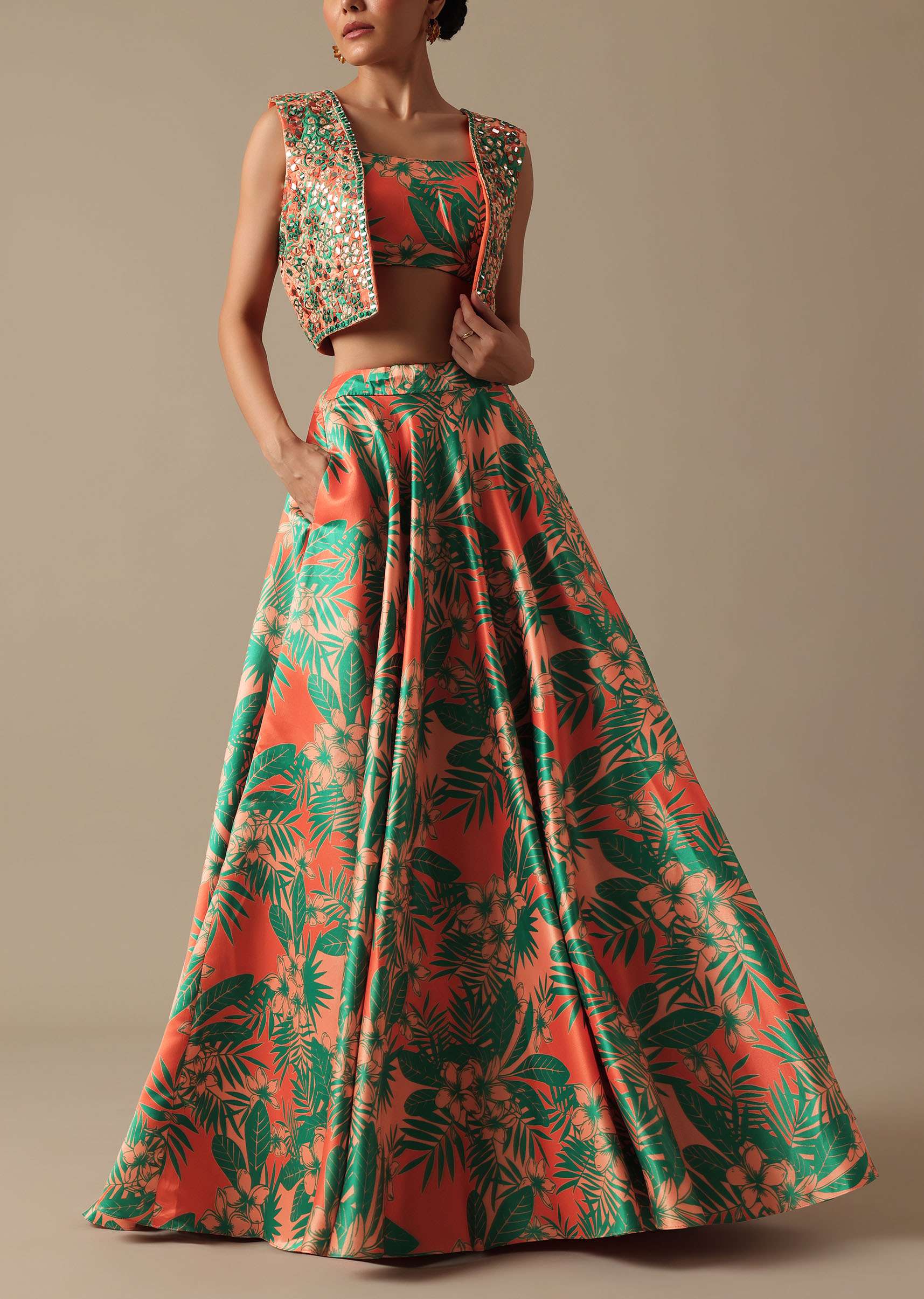 Green Printed Lehenga Set With Mirror Embellished Jacket