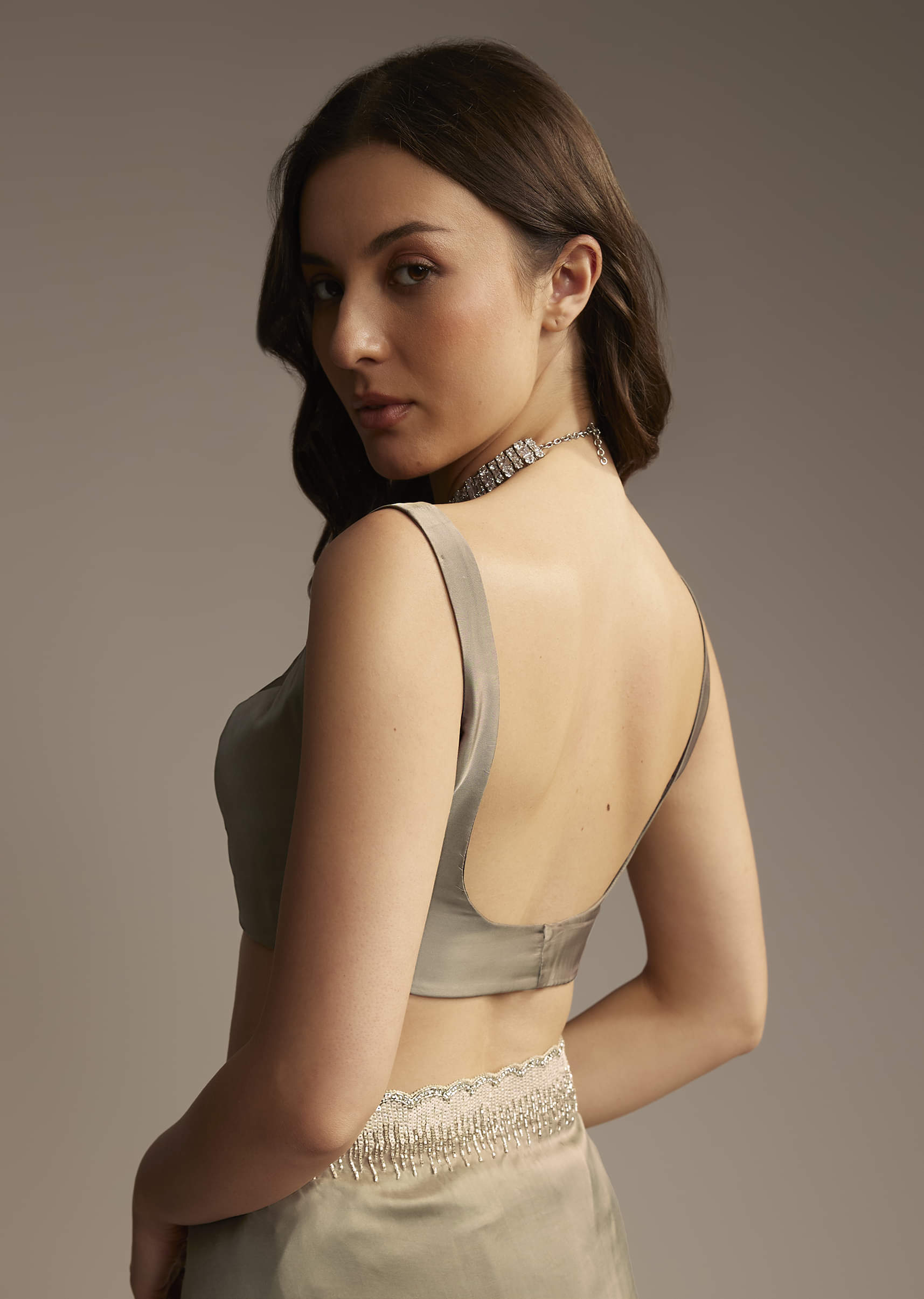 This grey organza saree carries a quiet confidence. Its scalloped border, detailed with cutdana, sequins, and subtle stone highlights, catches the light without trying too hard. The sheer base holds its own, while the blouse fabric, heavily embroidered with floral motifs, adds weight where it matters.