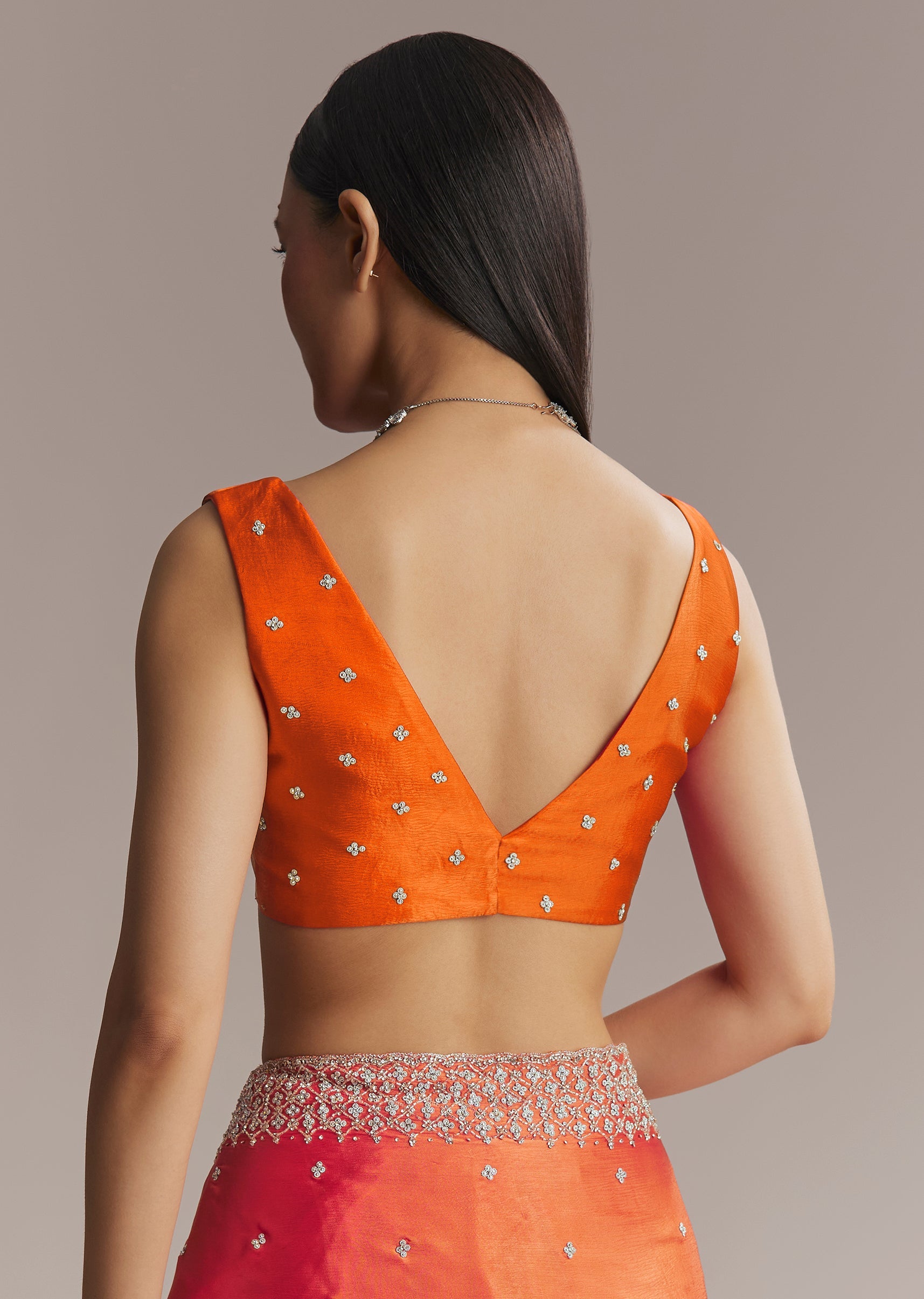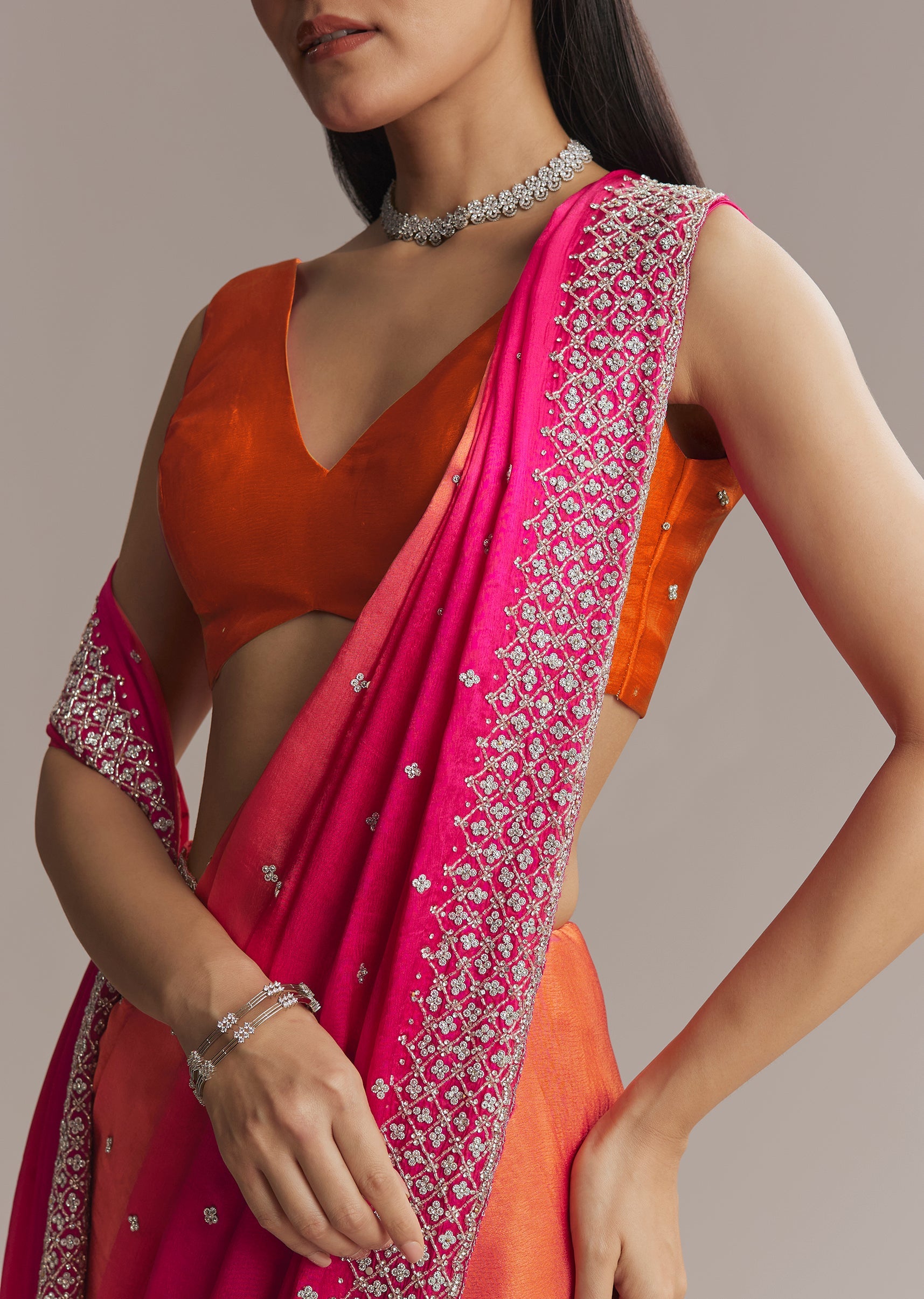 Hot Pink And Orange Chinon Saree With Heavy Embroidery