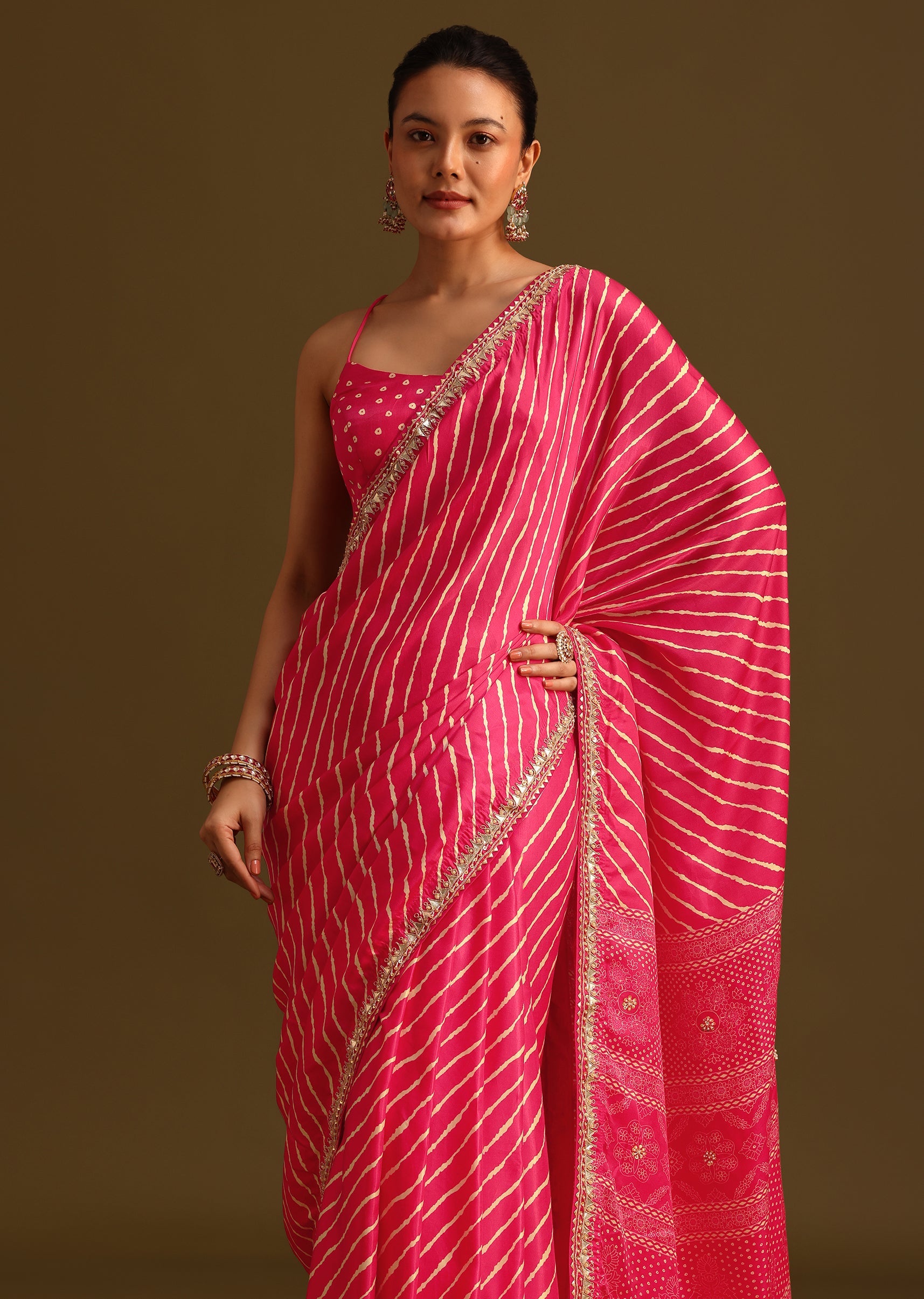 Hot Pink Lehariya Saree In Gota Patti Work With Unstitched Blouse
