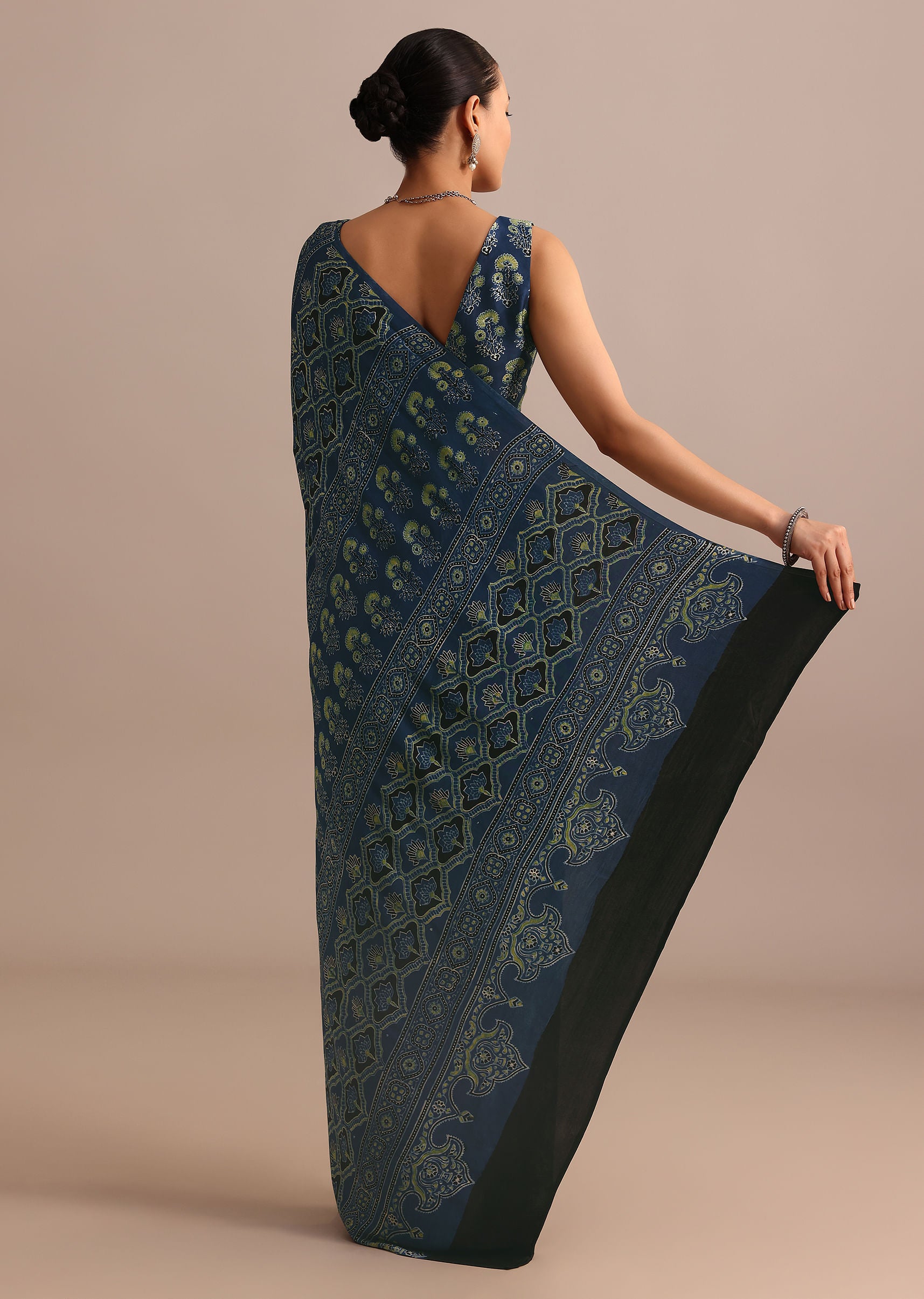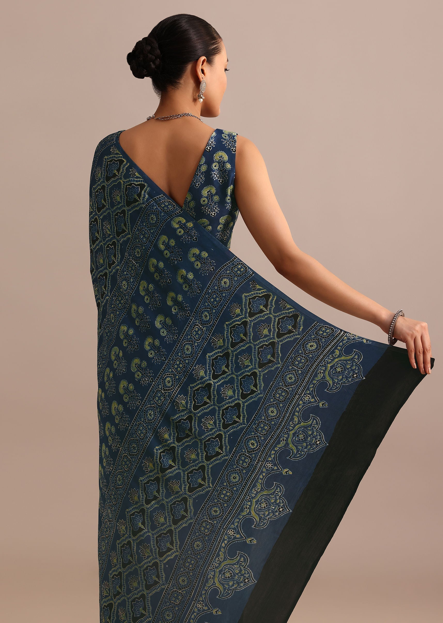 Indigo Satin Modal Handblock Printed Ajrakh Saree