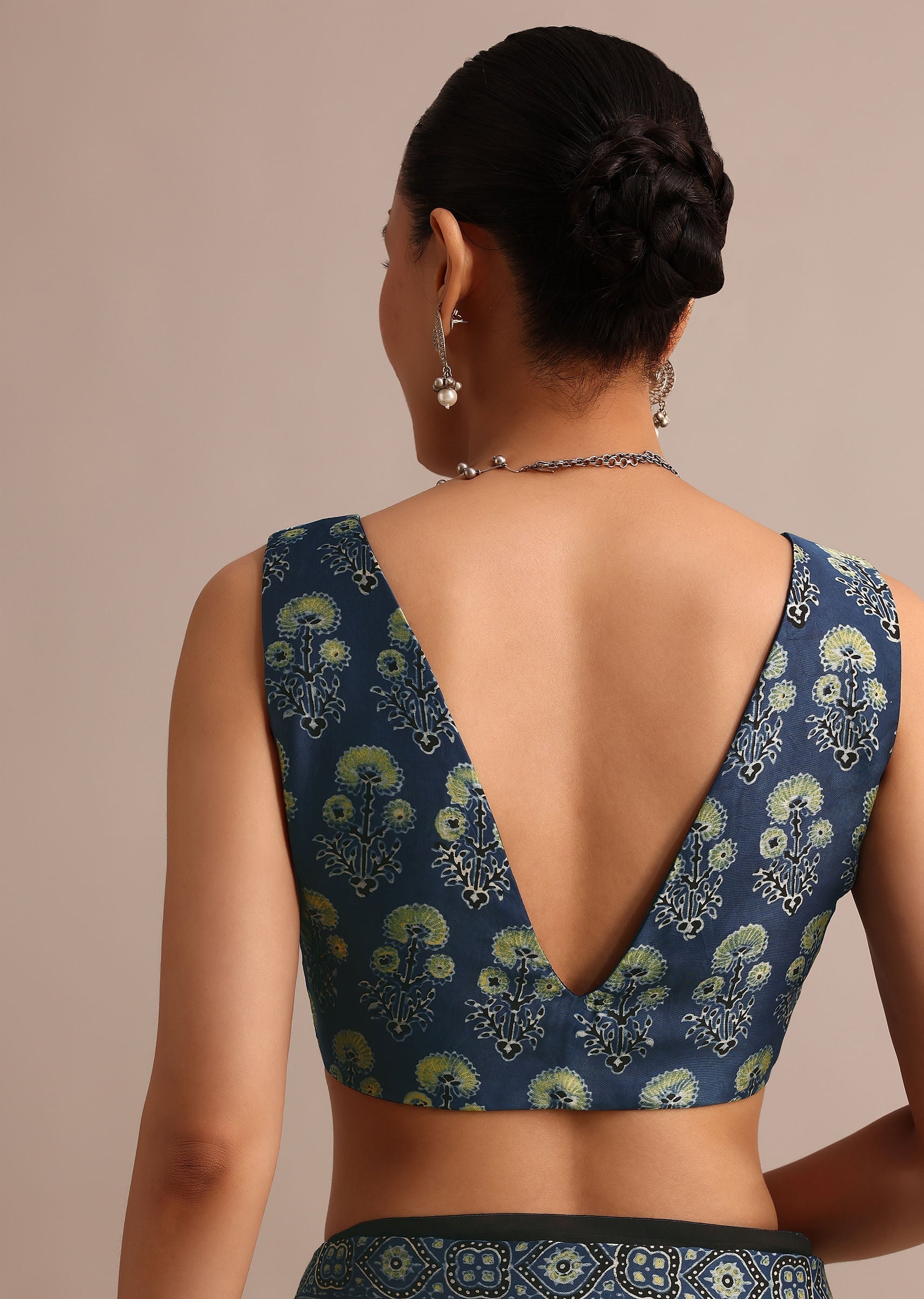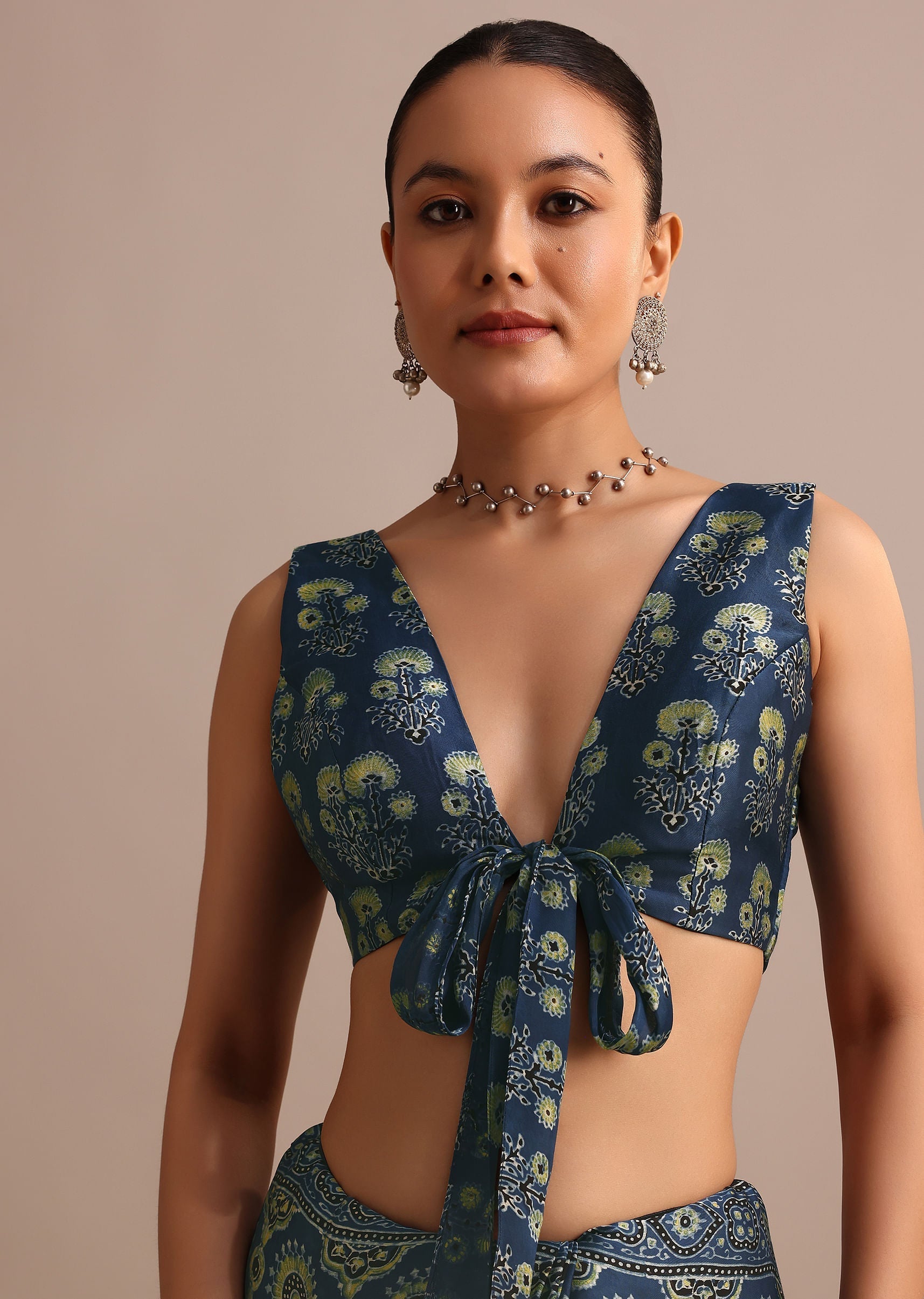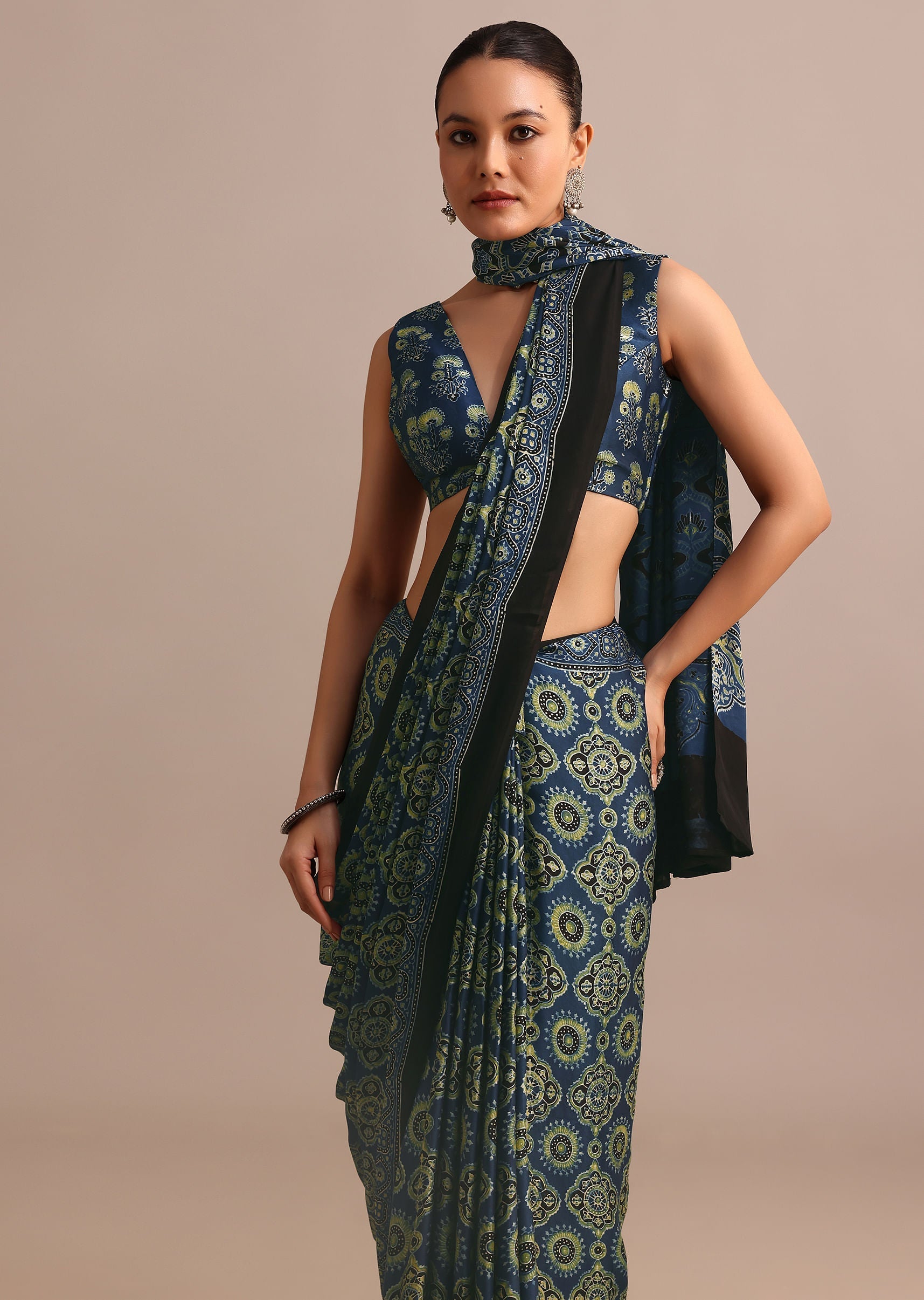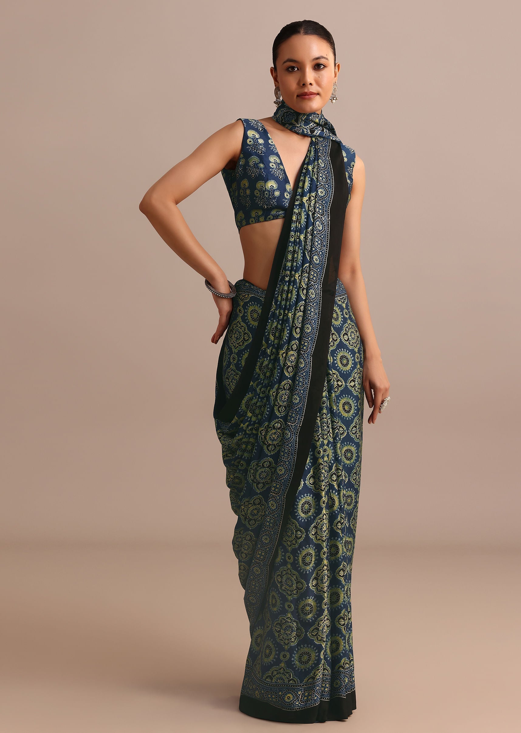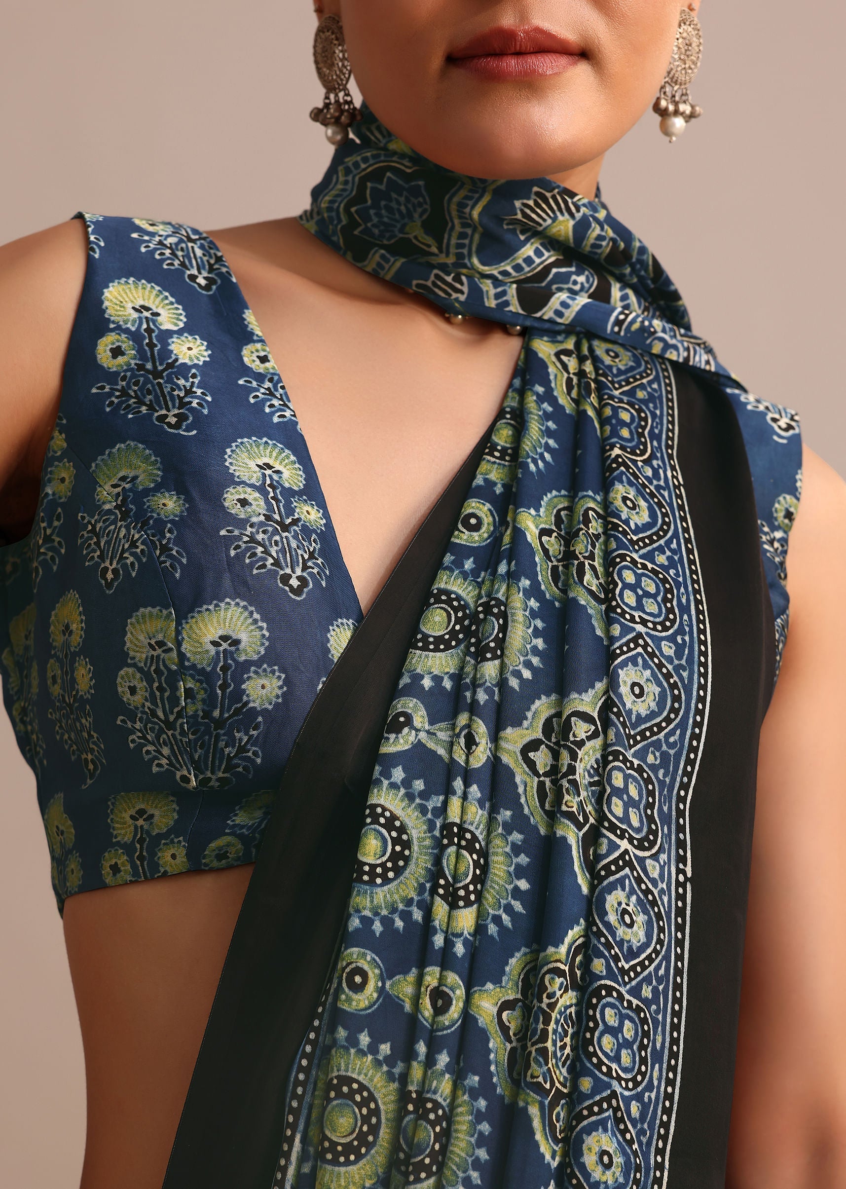 - Adorn yourself in the classic elegance of our indigo satin modal saree, detailed with intricate ajrakh hand block prints.