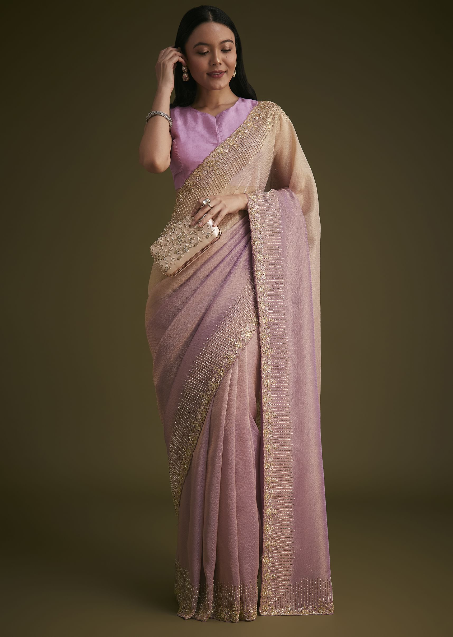 Experience The Regal Charm Of Purple With This Stunning Ombre Jacquard Saree. Featuring Intricate Cutdana And Stone Embroidery, It Exudes A Timeless Appeal, Perfect For Weddings And Grand Celebrations. The Contrasting Blouse Fabric Adds A Modern Touch To Its Traditional Allure, Making It A Standout Piece In Your Wardrobe. With Its Graceful Drape And Exquisite Detailing, Blouse color may vary. This Saree Is Designed To Turn Heads.Awarded as the Most Trusted Brand, we're delivering styles you love, just as promised.