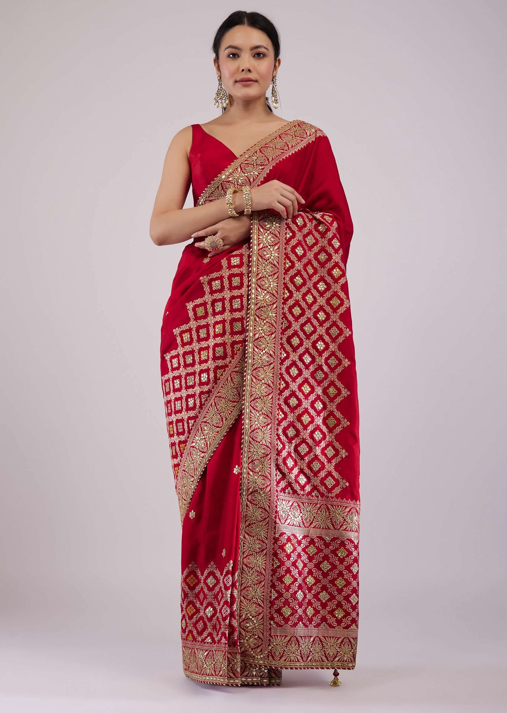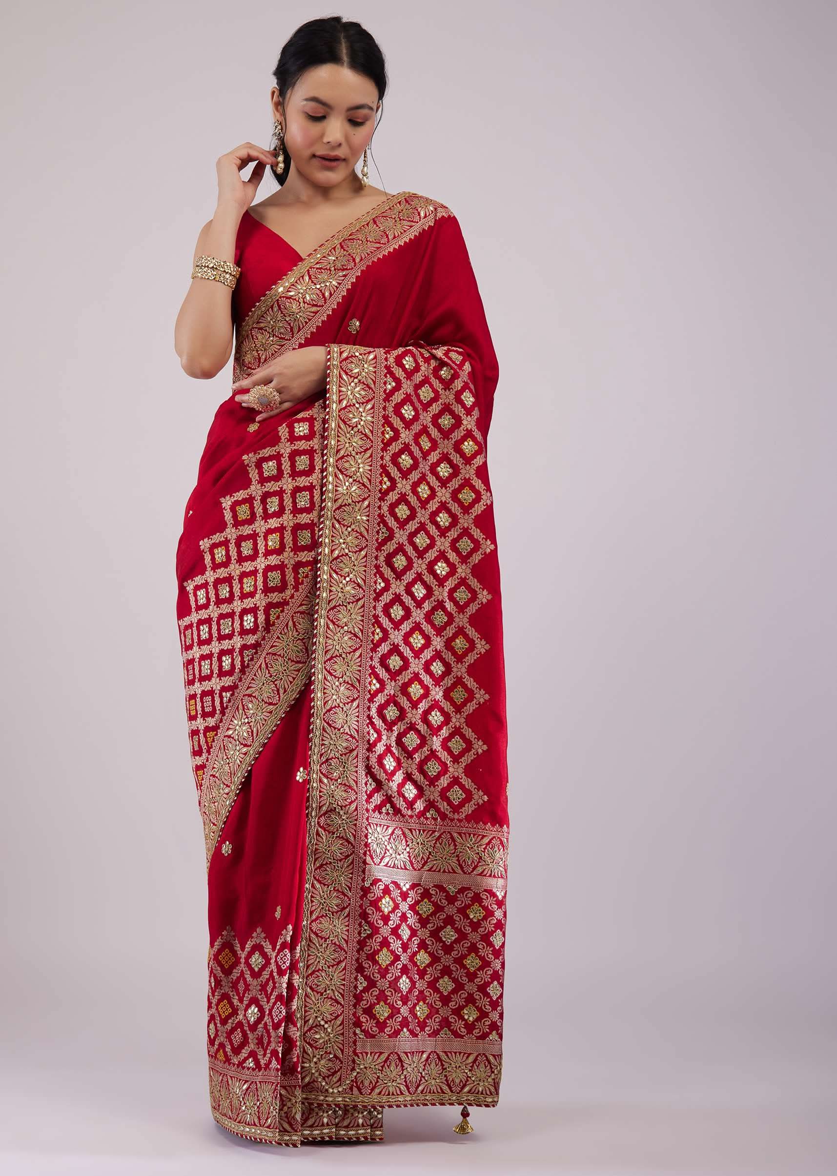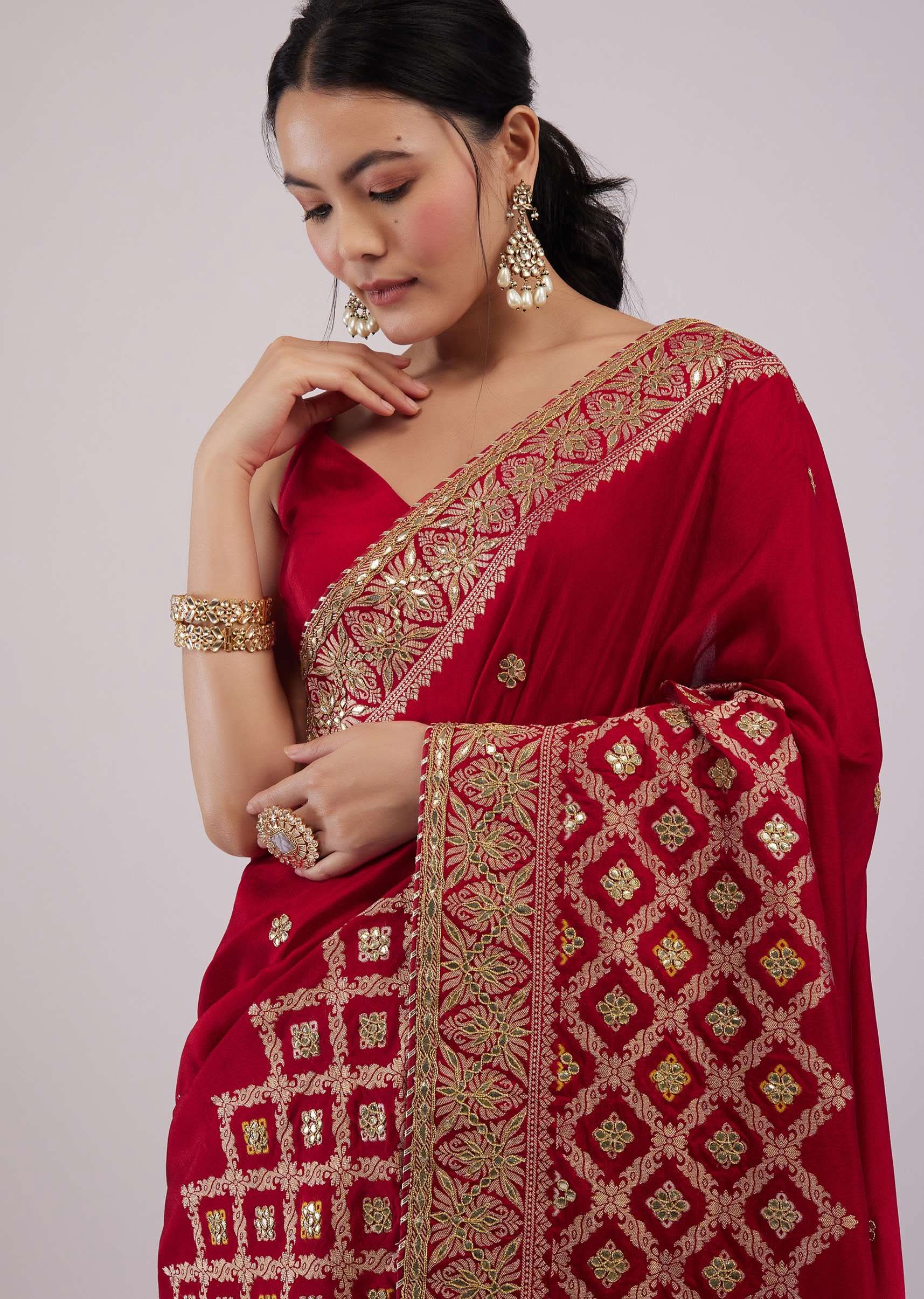 - Feel the royal ethnic vibe when you adorn this stunning scarlet red silk saree.
