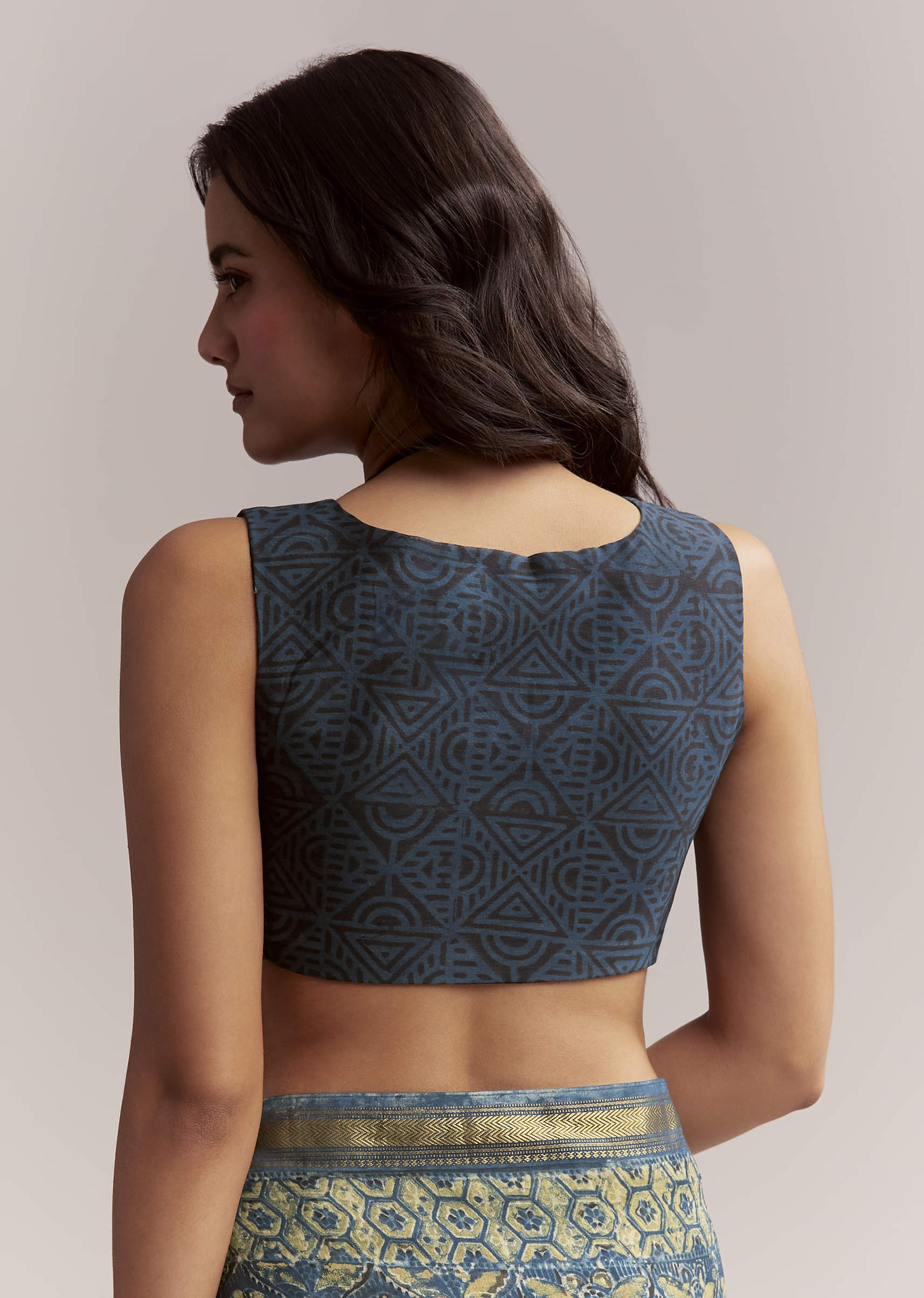 Midnight Blue Linen Printed Saree With Traditional Ajrakh Print