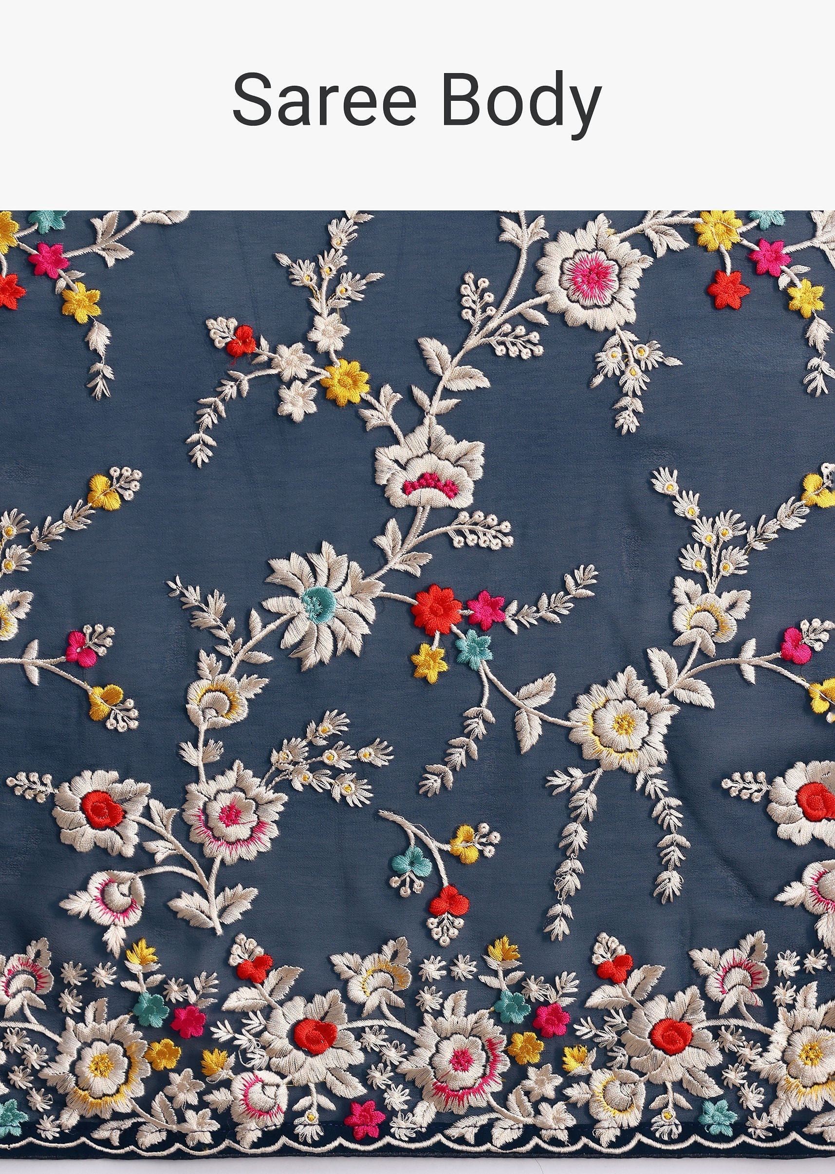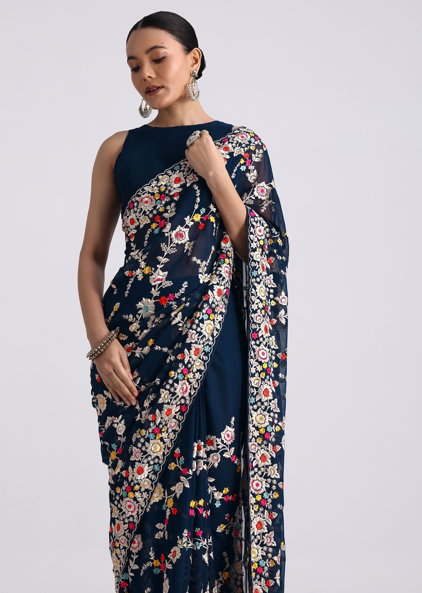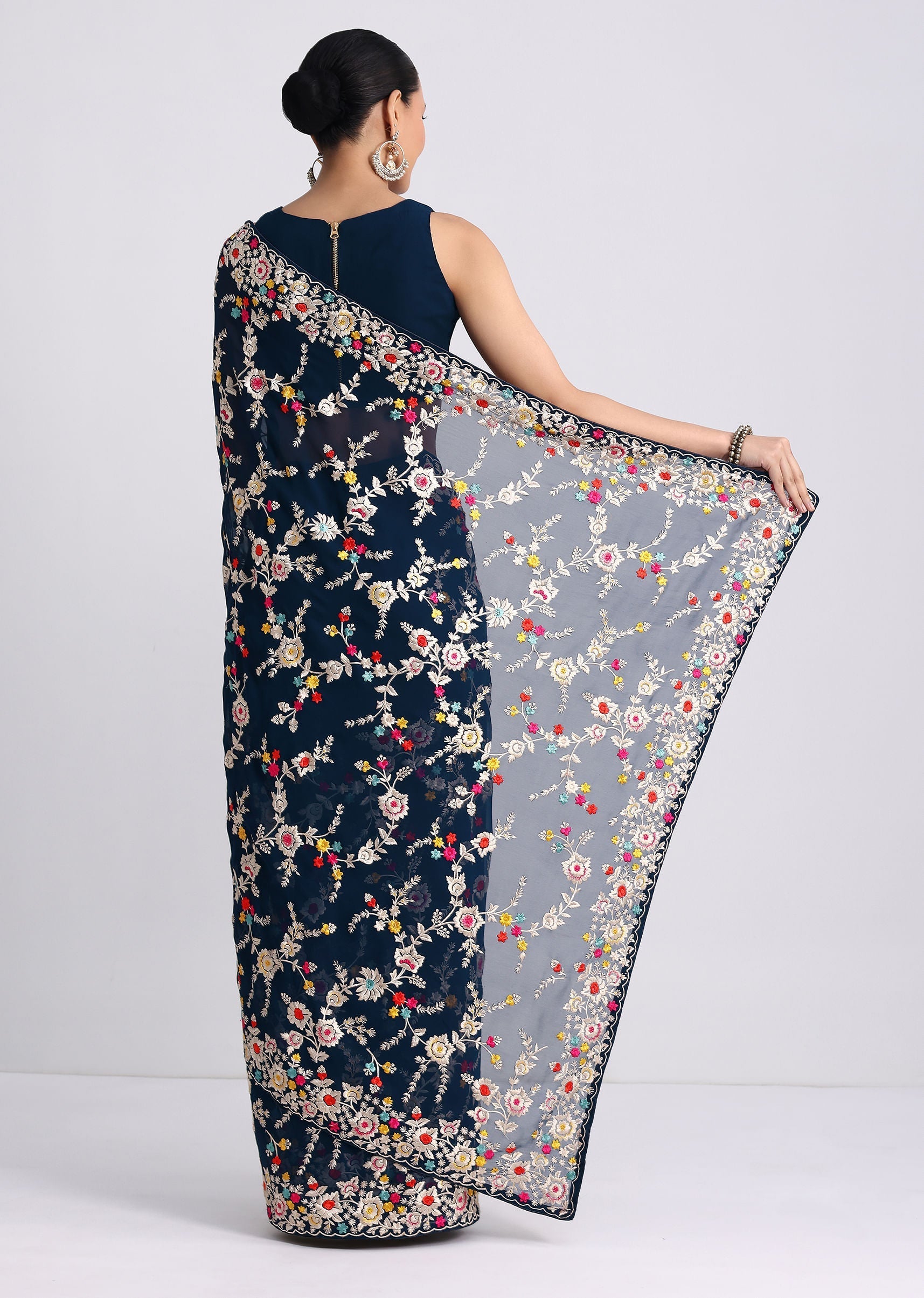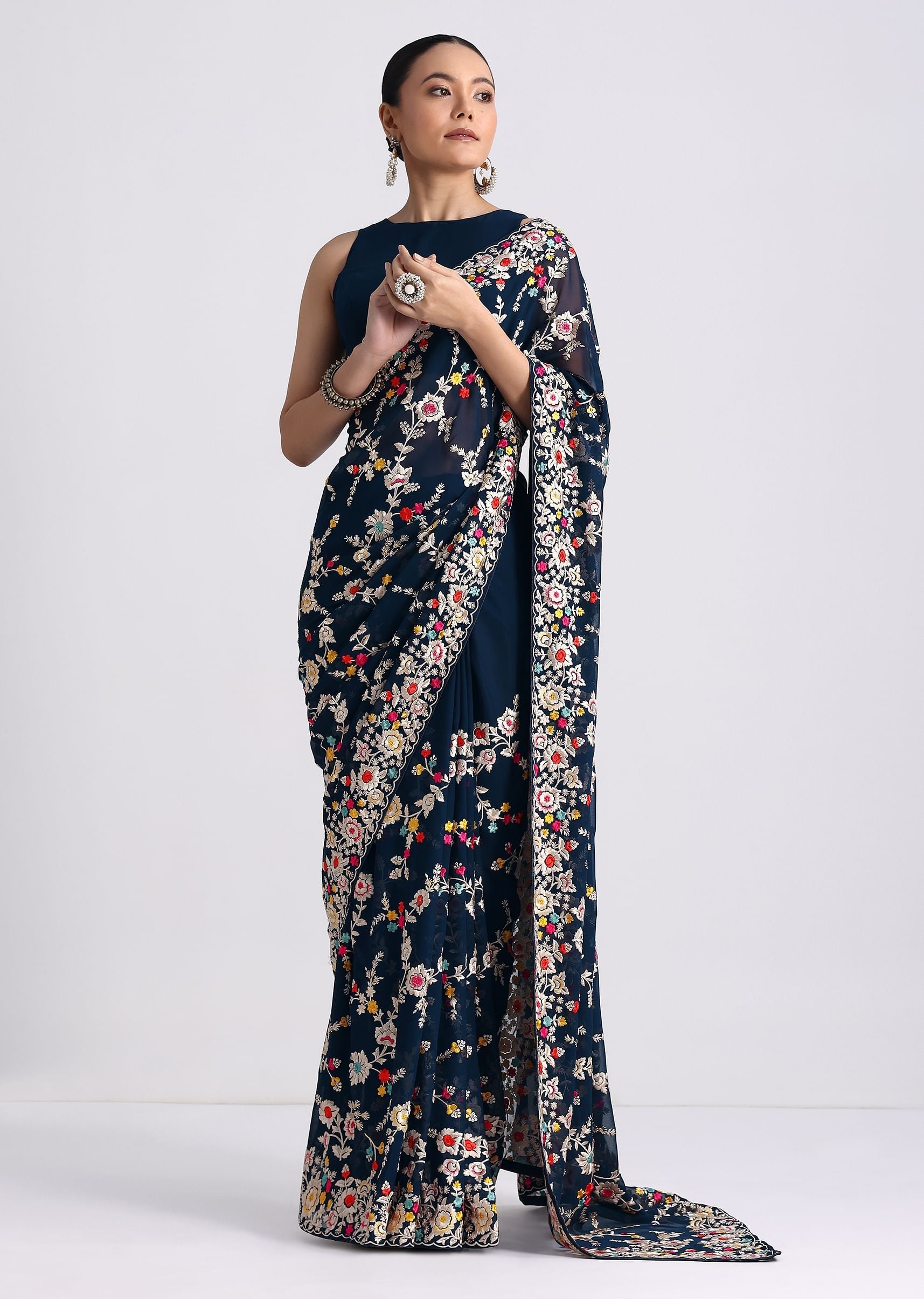 - Exude old-word charm with new-age glamour with this midnight blue saree.