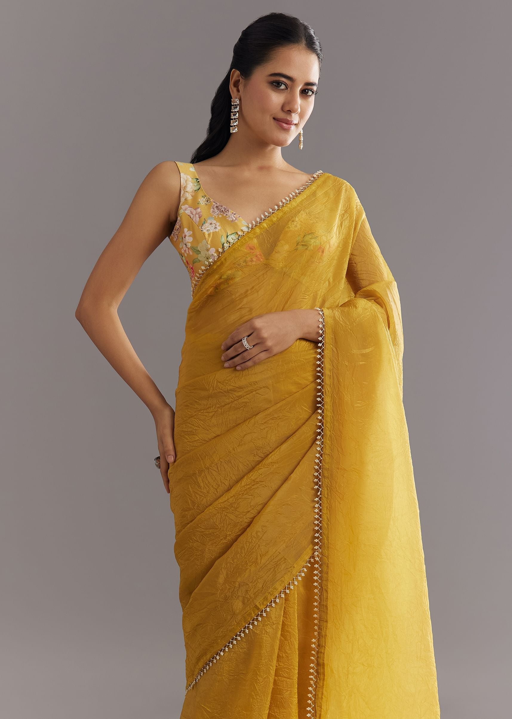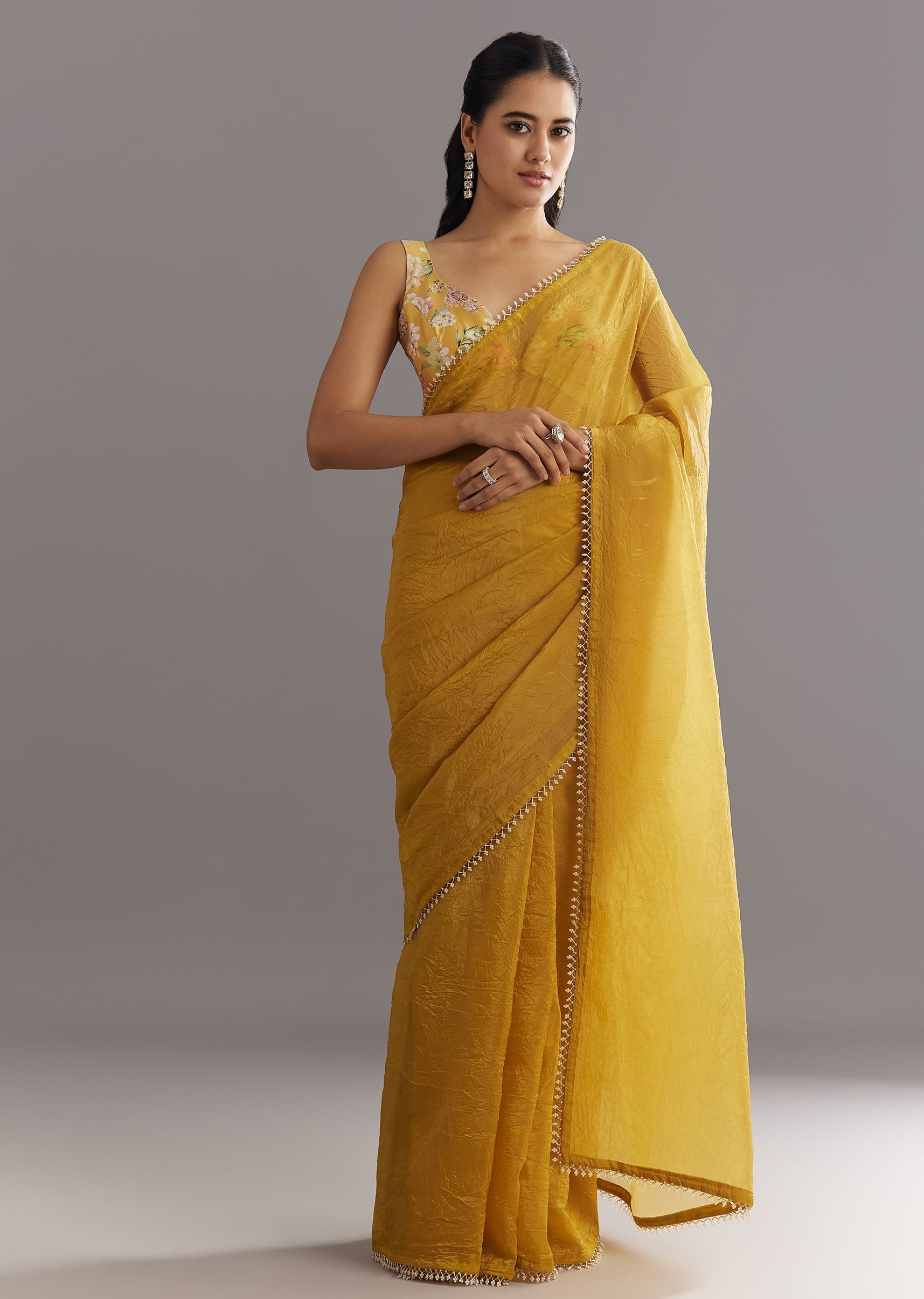 Mustard Yellow Crushed Tissue Saree With Moti Cutdana Embellished Border