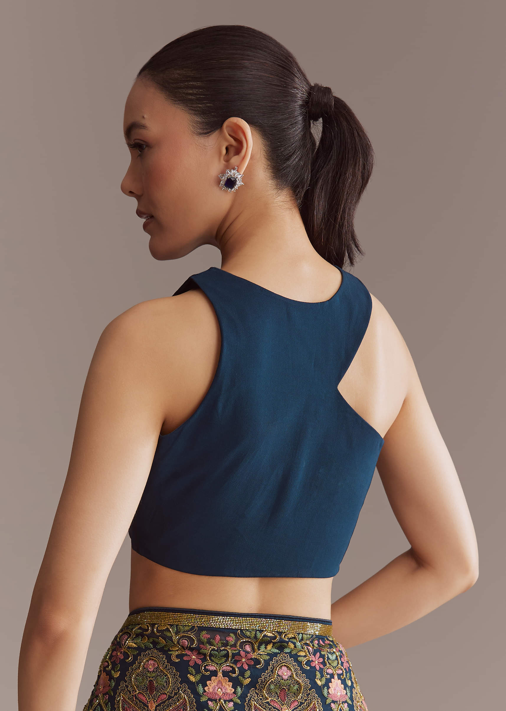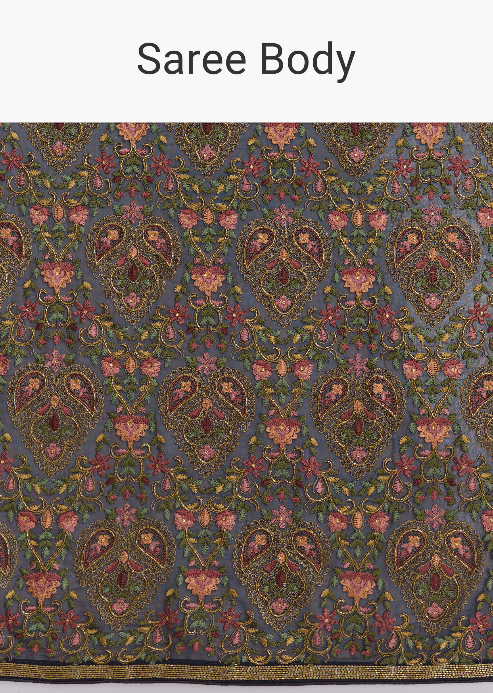 Rich navy blue gives this georgette saree depth and elegance. Kashmiri Kashida work in multicolour resham threads creates paisleys and vines, highlighted with cutdana along the motifs and border. It is a standout choice for sangeet nights when you want artistry and detail. Awarded as the Most Trusted Brand, we're delivering styles you love, just as promised.