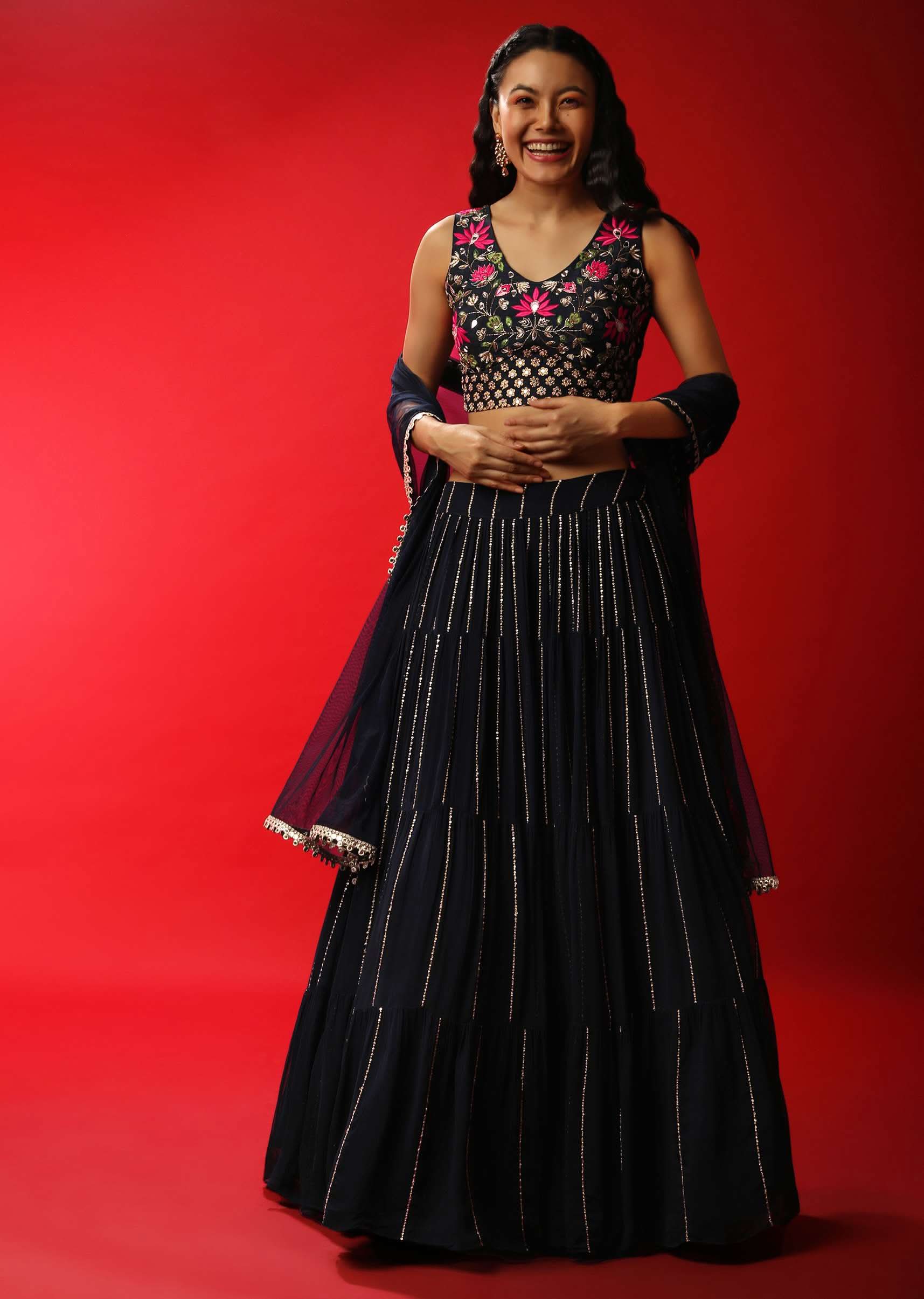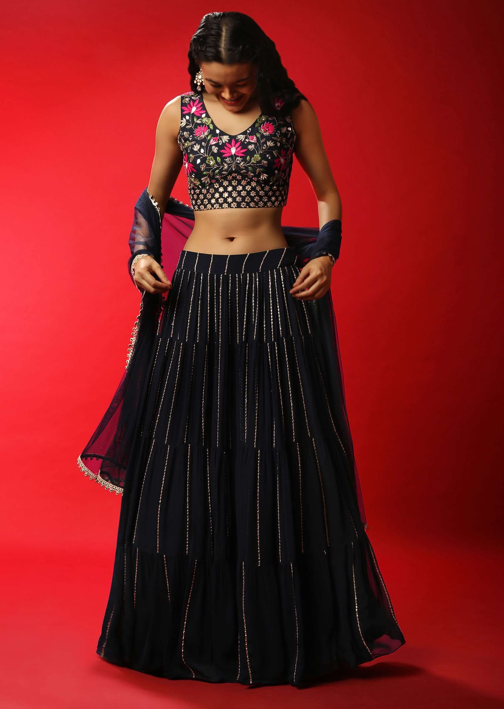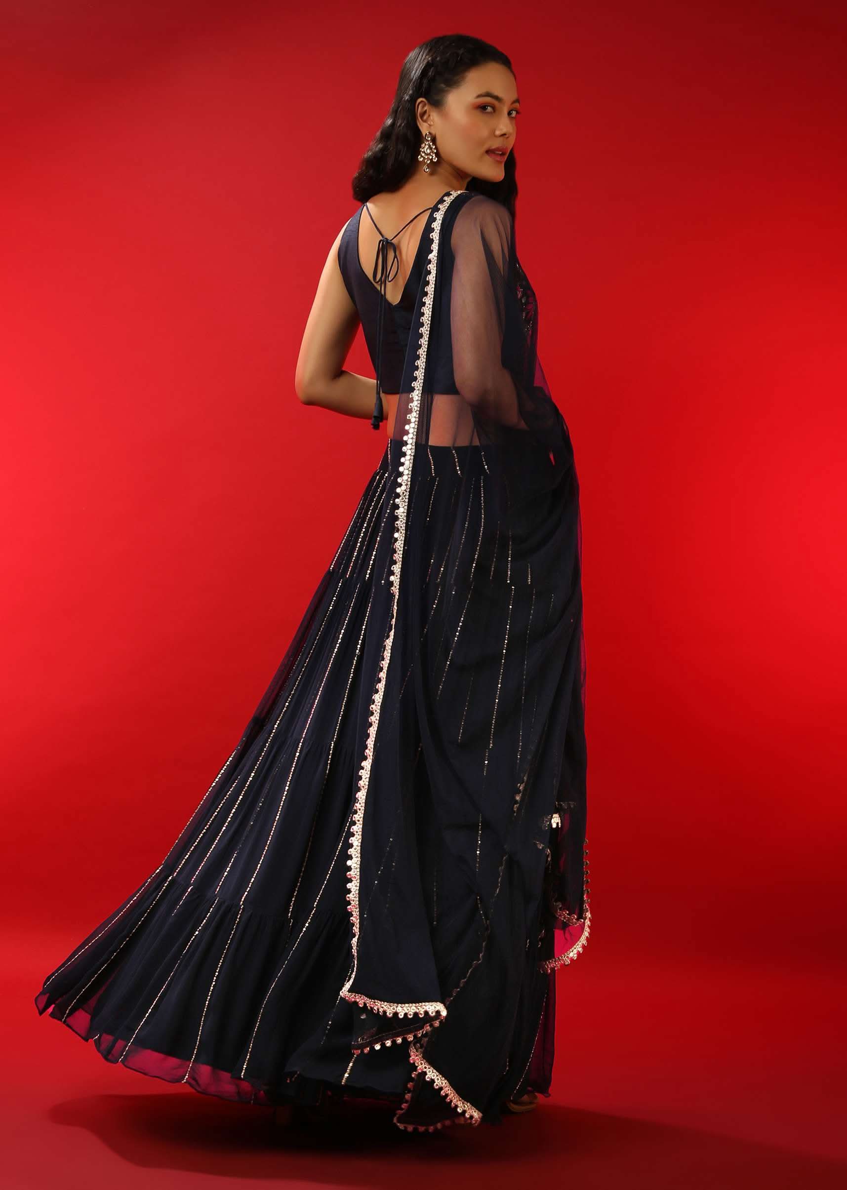 - Navy blue lehenga in georgette with sequins and zari embroidered stripes and gathered flare.