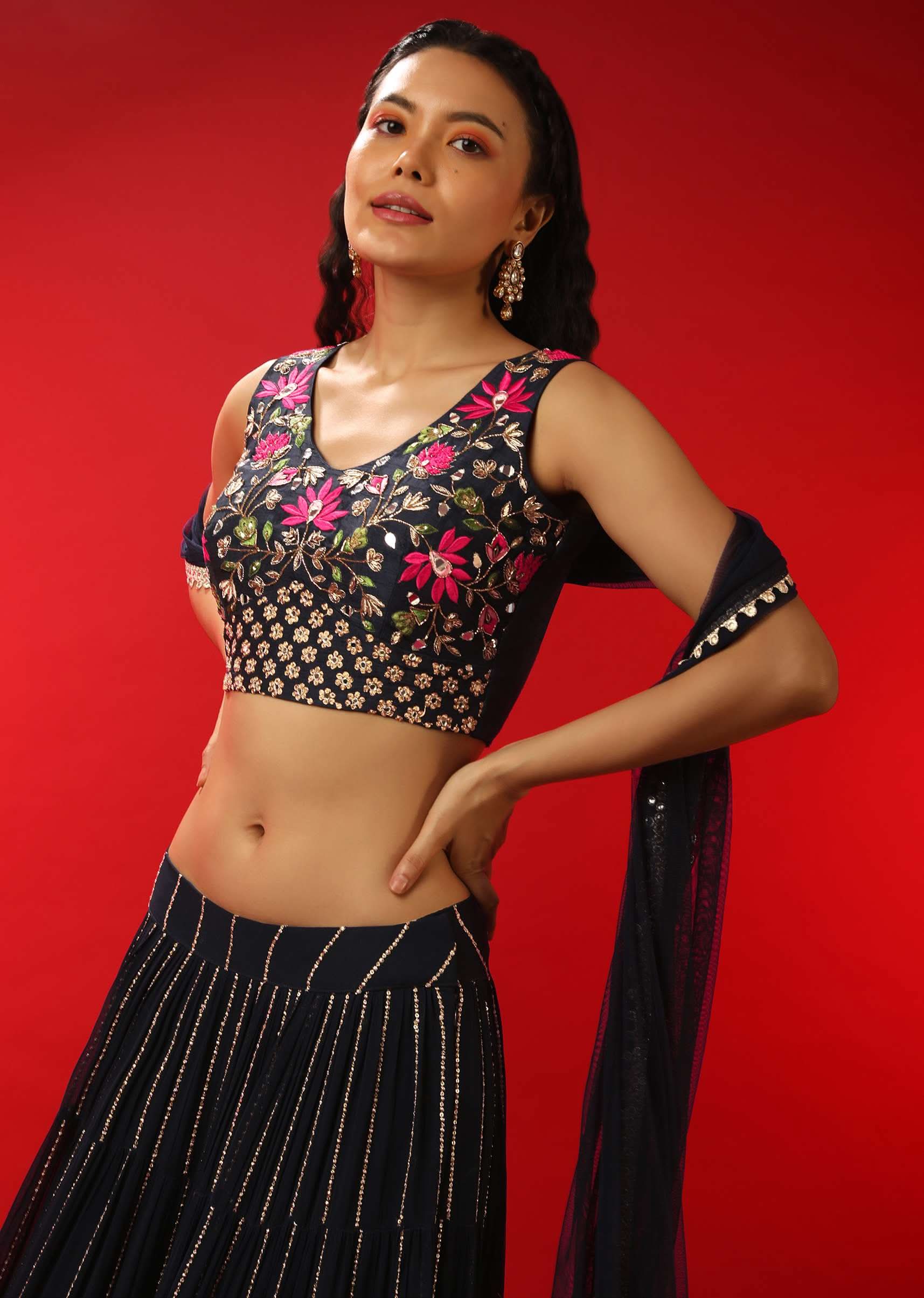Navy Blue Lehenga Choli With Sequins Stripes And Multi Colored Resham Work