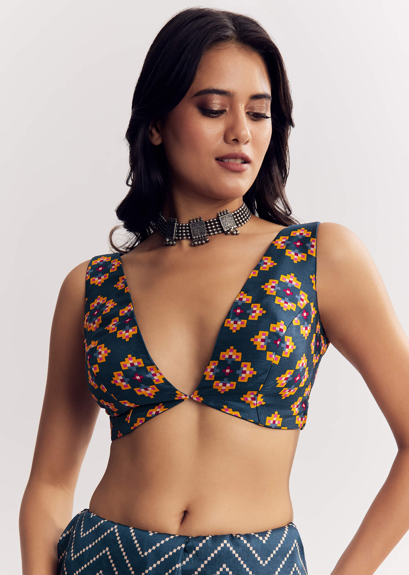 Navy Blue Muslin Ajrakh Printed Saree With Gota And Mirror Work
