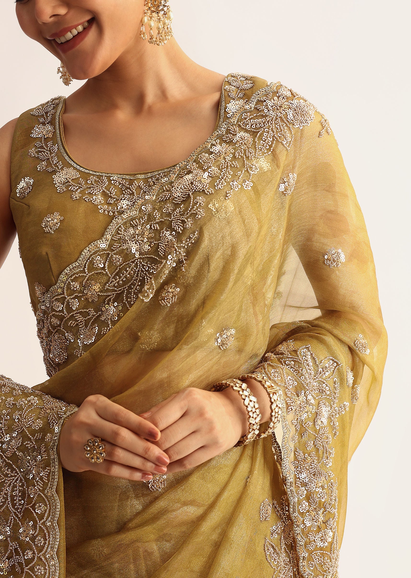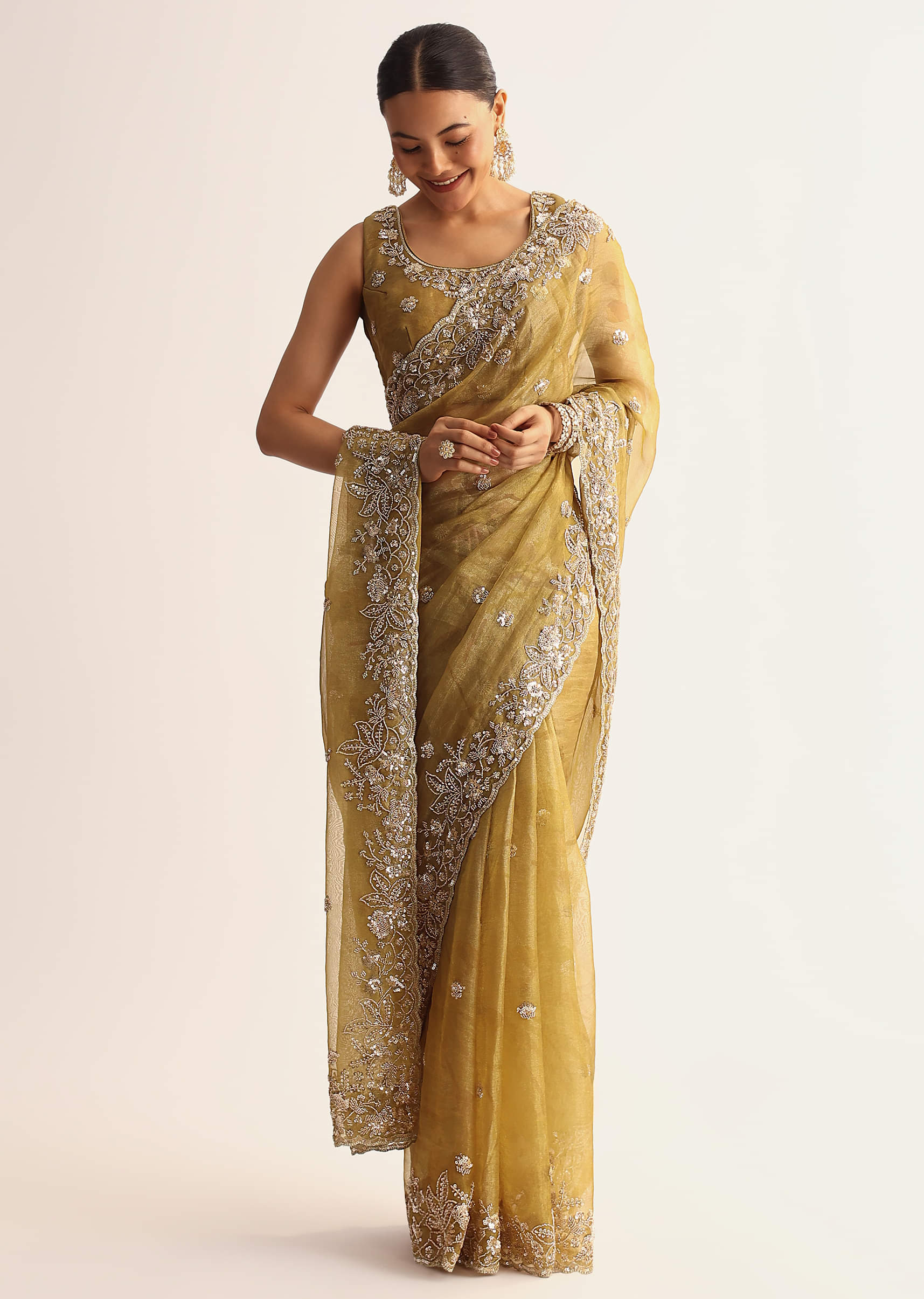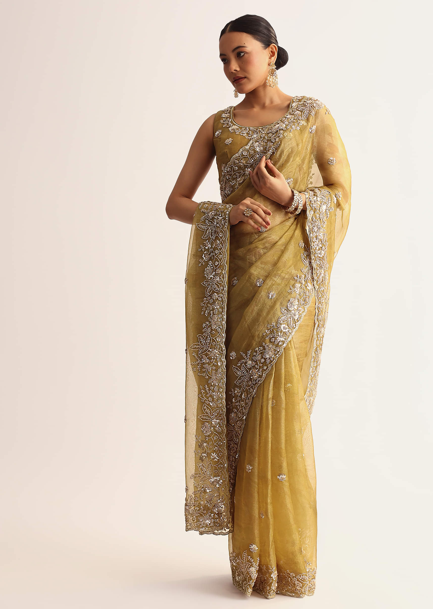 Bright occur yellow tissue saree covered in floral embroidery. Sequins, beads, and cutdana enhance the scallop border and blouse. Fresh and bold pick for daytime functions. Awarded as the Most Trusted Brand, we're delivering styles you love, just as promised.