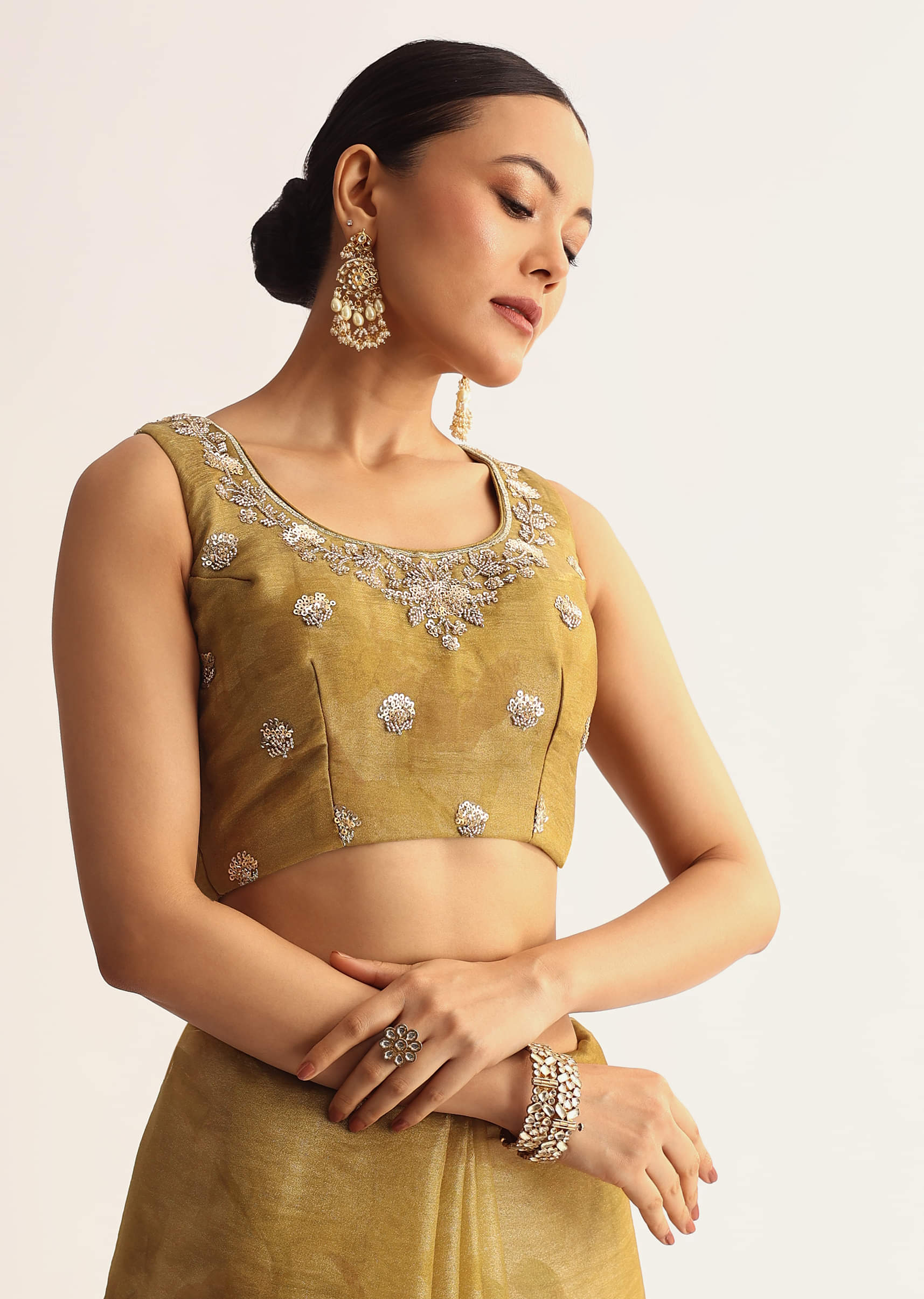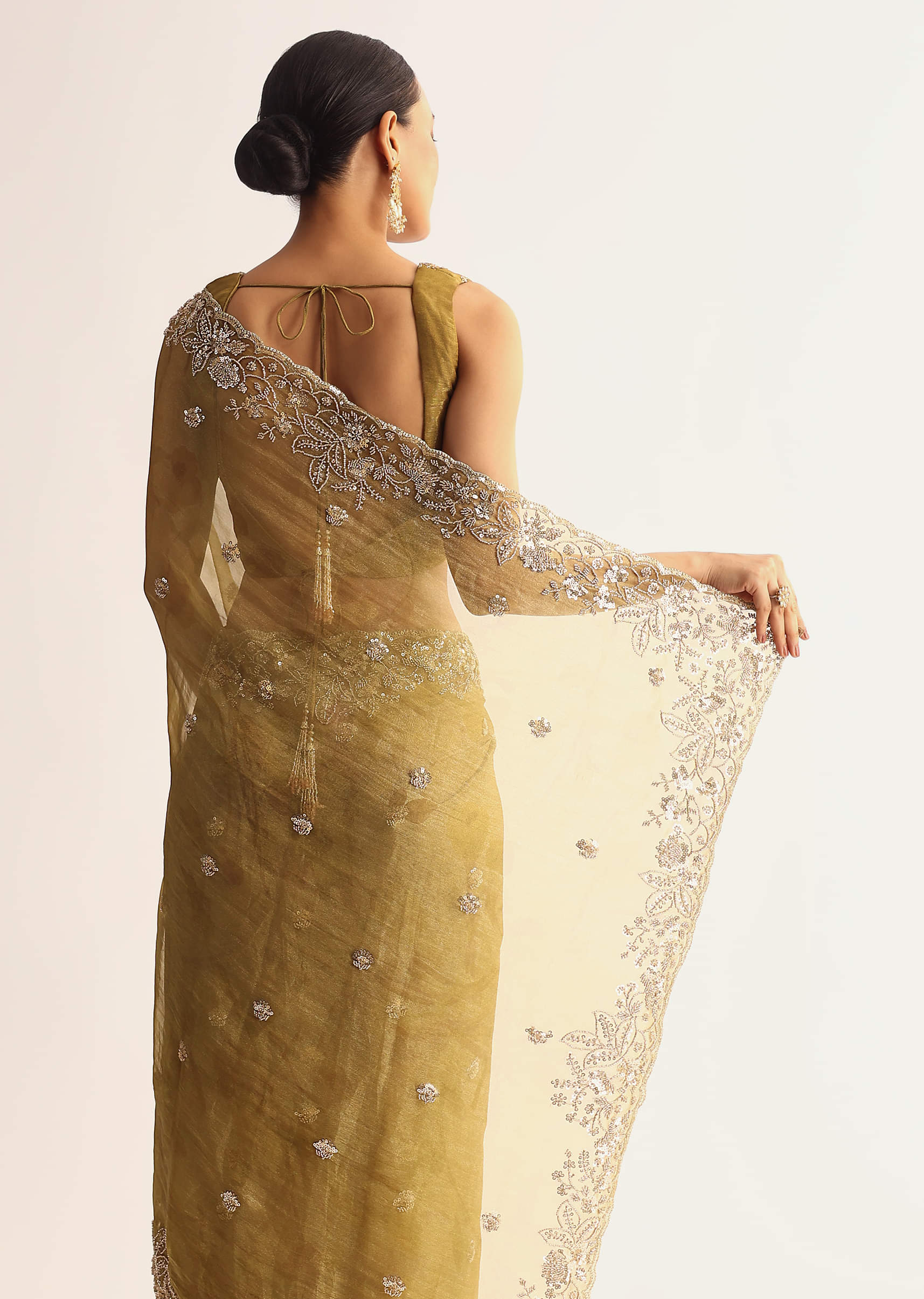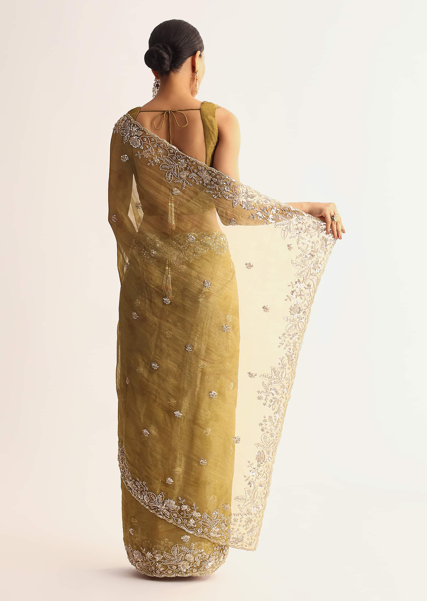 Bright occur yellow tissue saree covered in floral embroidery. Sequins, beads, and cutdana enhance the scallop border and blouse. Fresh and bold pick for daytime functions. Awarded as the Most Trusted Brand, we're delivering styles you love, just as promised.