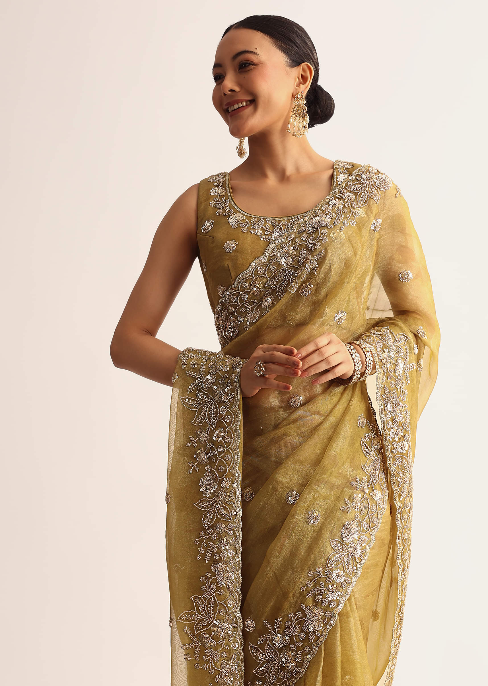 Occur Yellow Tissue Floral Saree With Scallop Embroidered Border