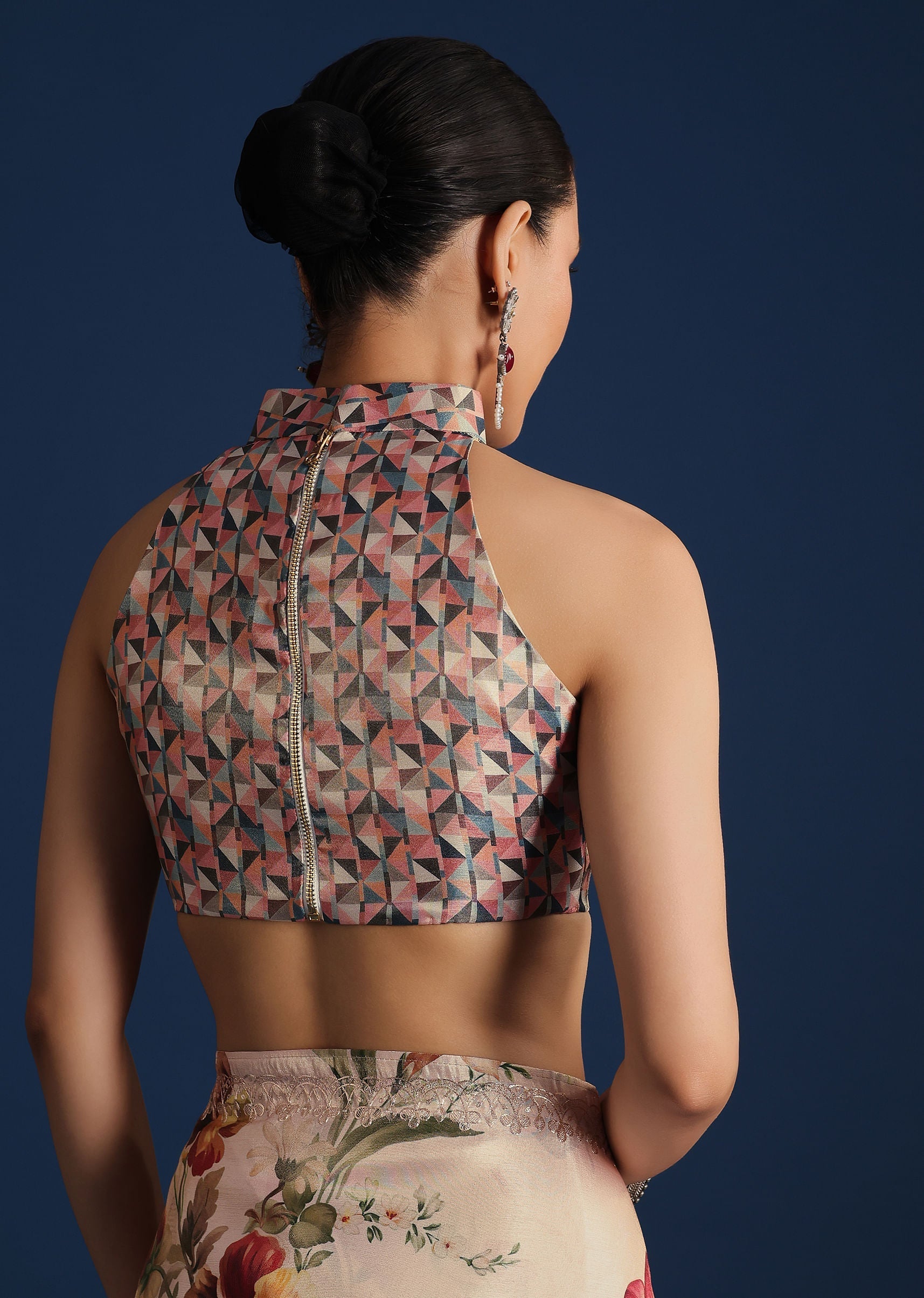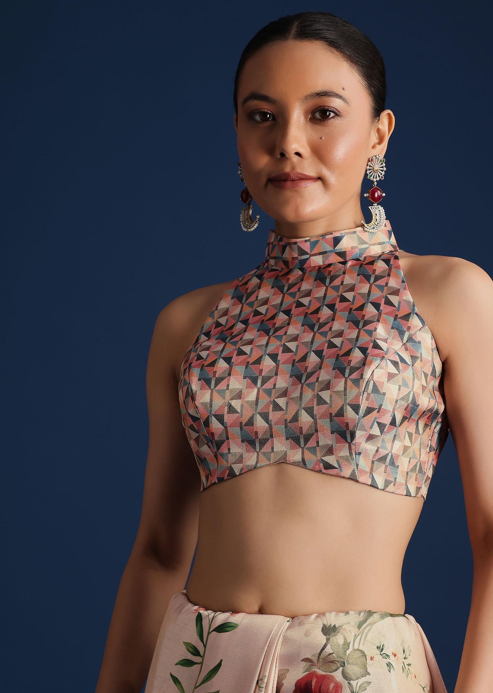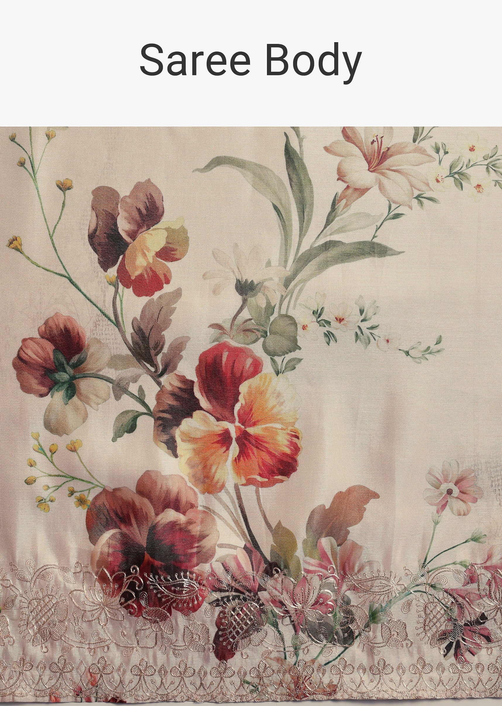 - Made from lightweight and rich tissue muslin fabric this saree is adorned with colorful floral motif prints.