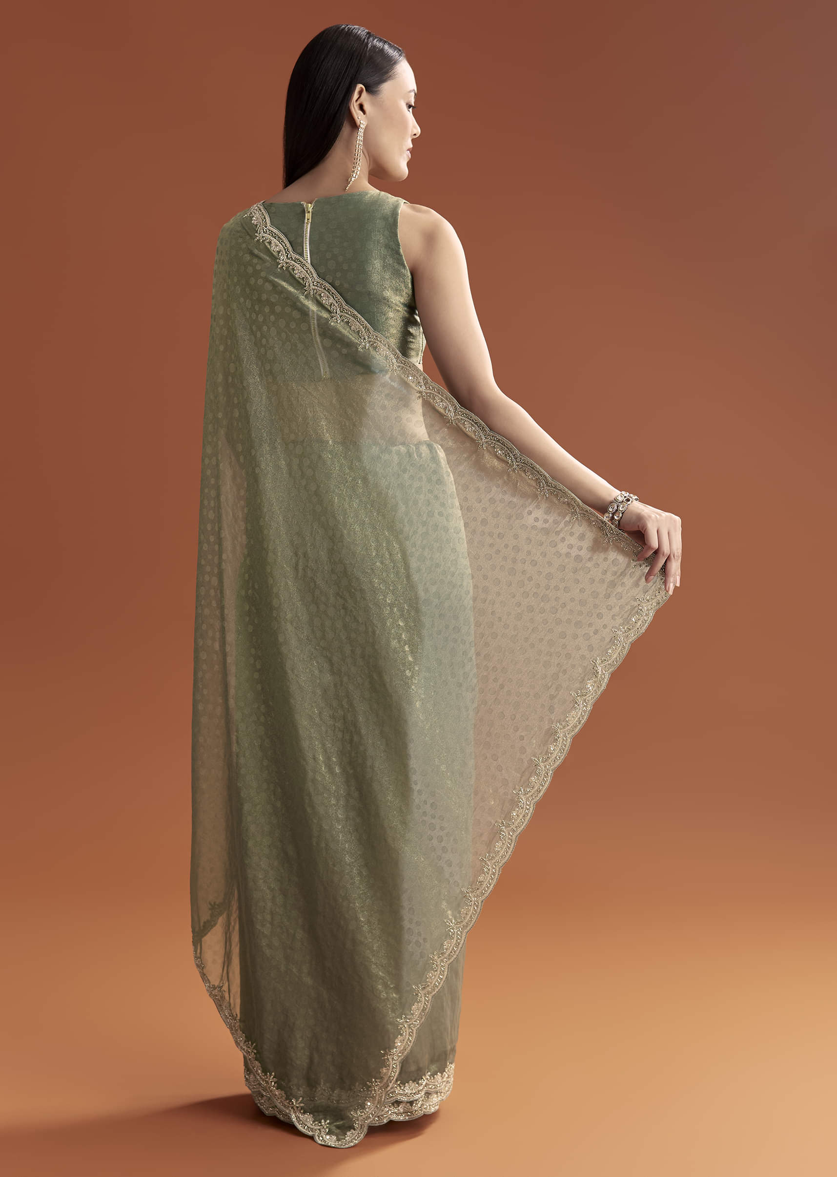 Olive Green Jacquard Saree With Stone And Sequin Embroidery