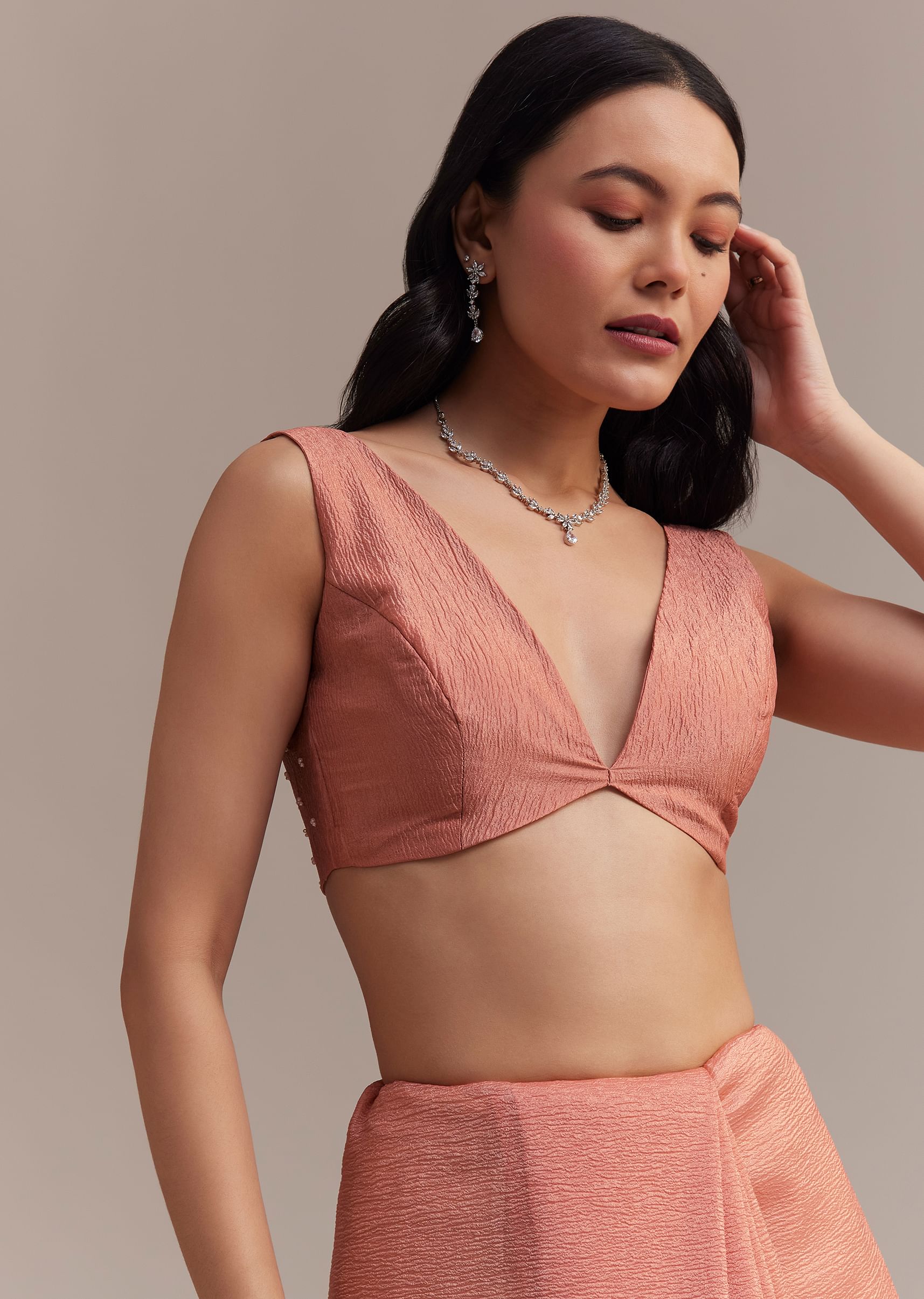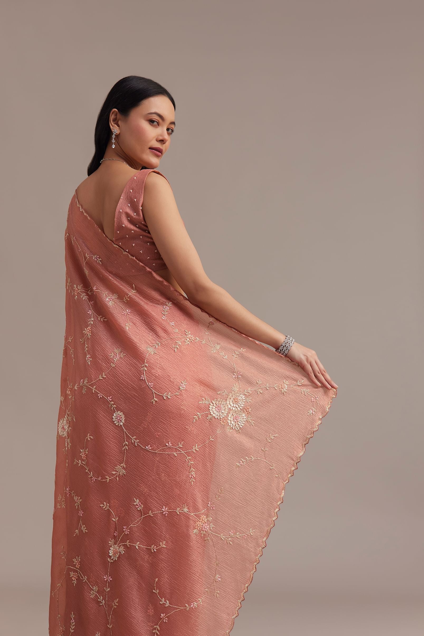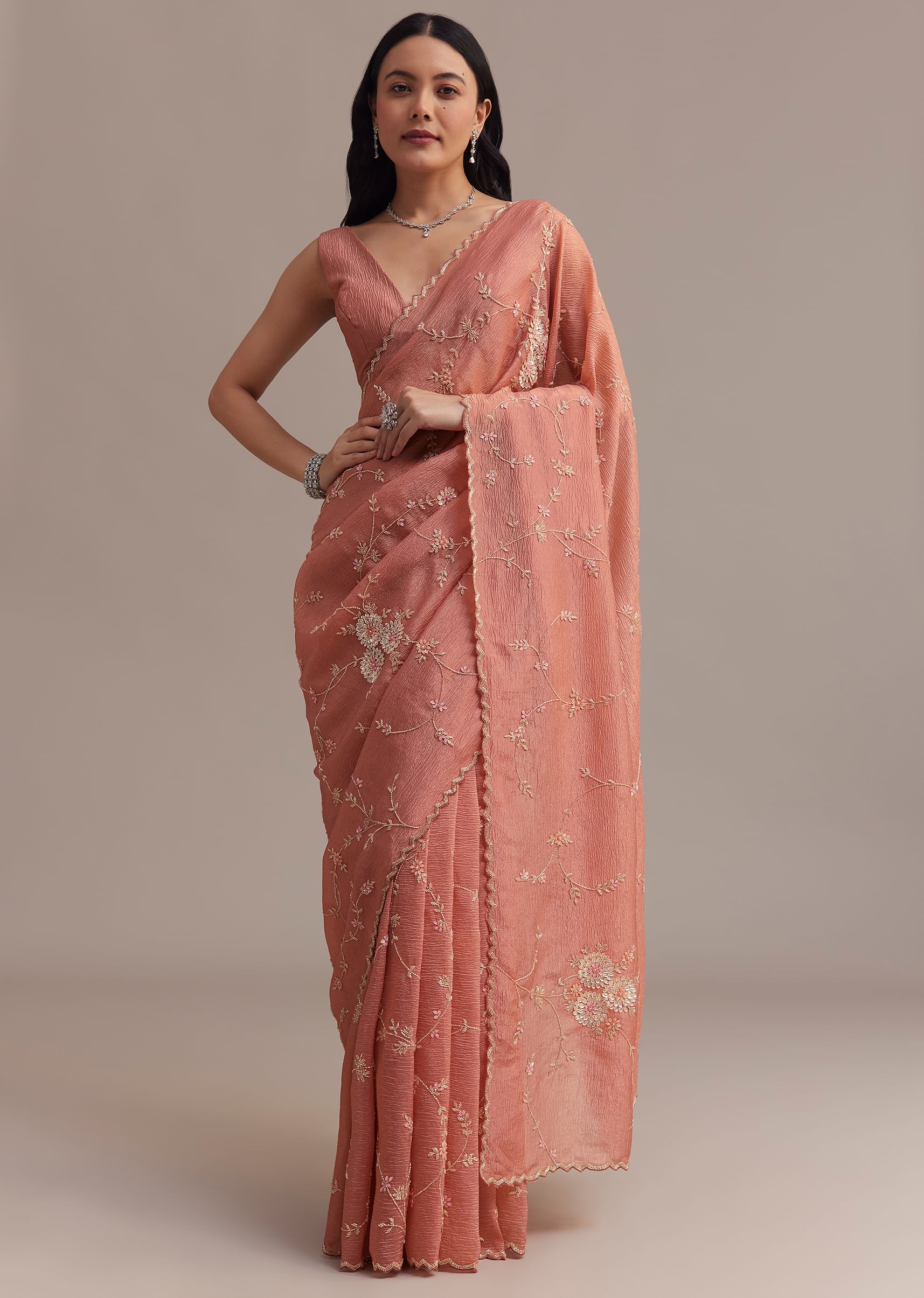 A Vision Of Elegance This Peach Crushed Tissue Saree Is Adorned With Intricate Cutdana And Sequins Jaal Work. The Delicate Embroidery Flows Across The Fabric Creating A Mesmerizing Pattern That Catches The Light With Every Movement. The Soft Peach Hue Enhances Its Ethereal Appeal Making It Perfect For Weddings Festive Gatherings And Evening Receptions. A Timeless Masterpiece That Exudes Understated Opulence.Awarded As The Most Trusted Brand We'Re Delivering Styles You Love Just As Promised.