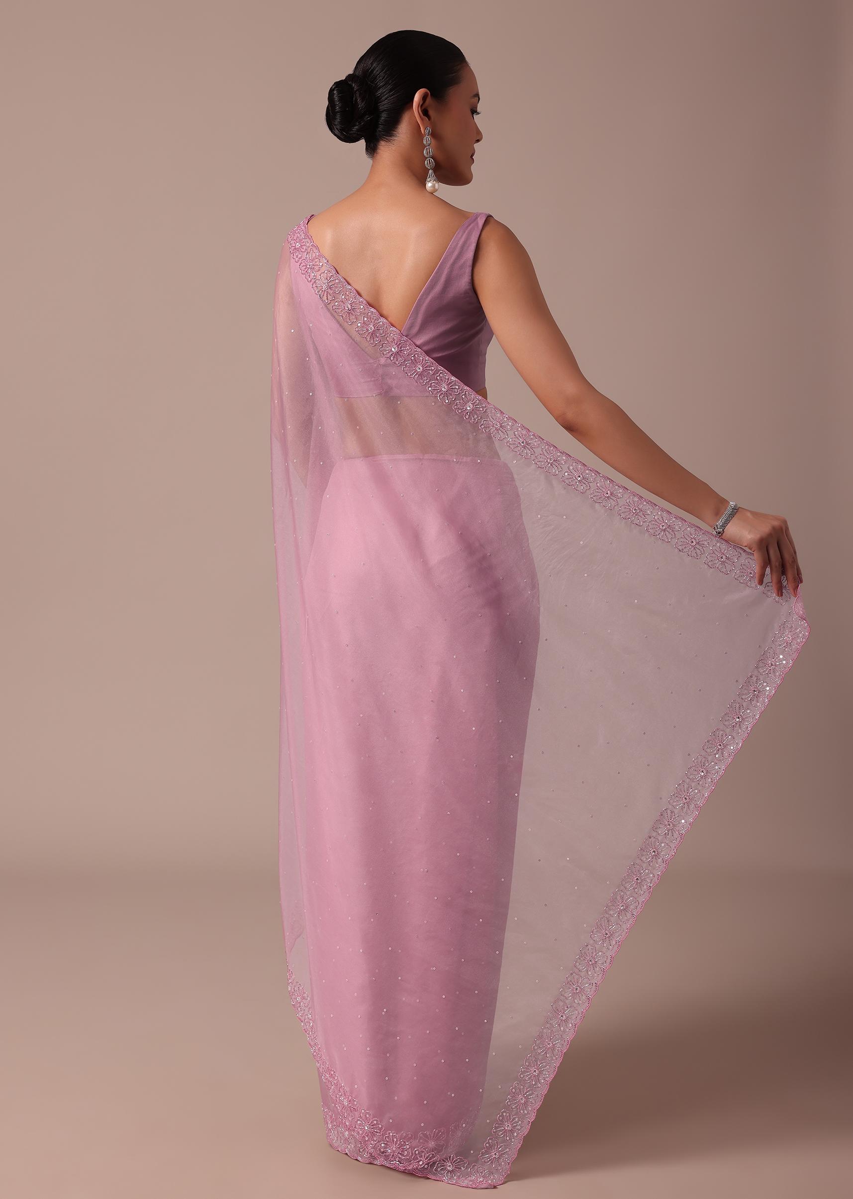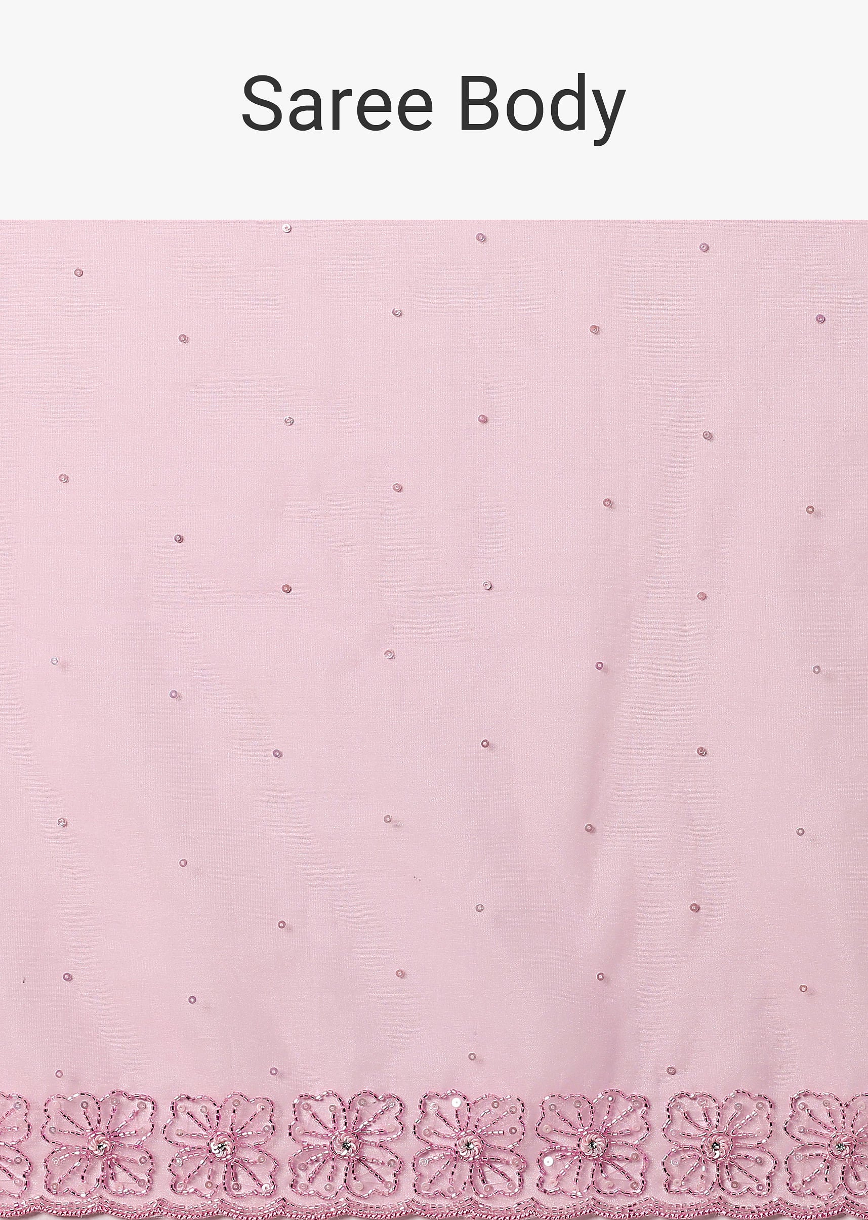 - Experience the allure of this pink saree ornamented with cutdana and sequin work borders.