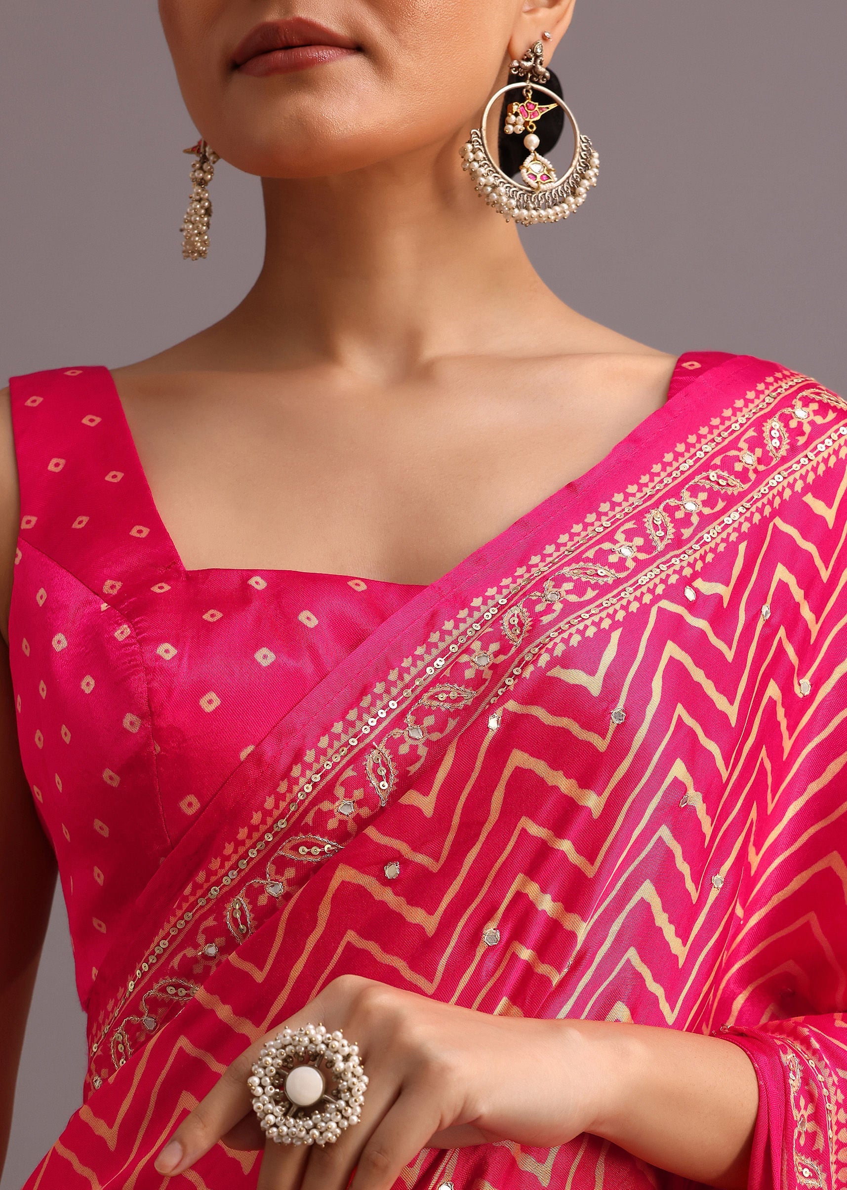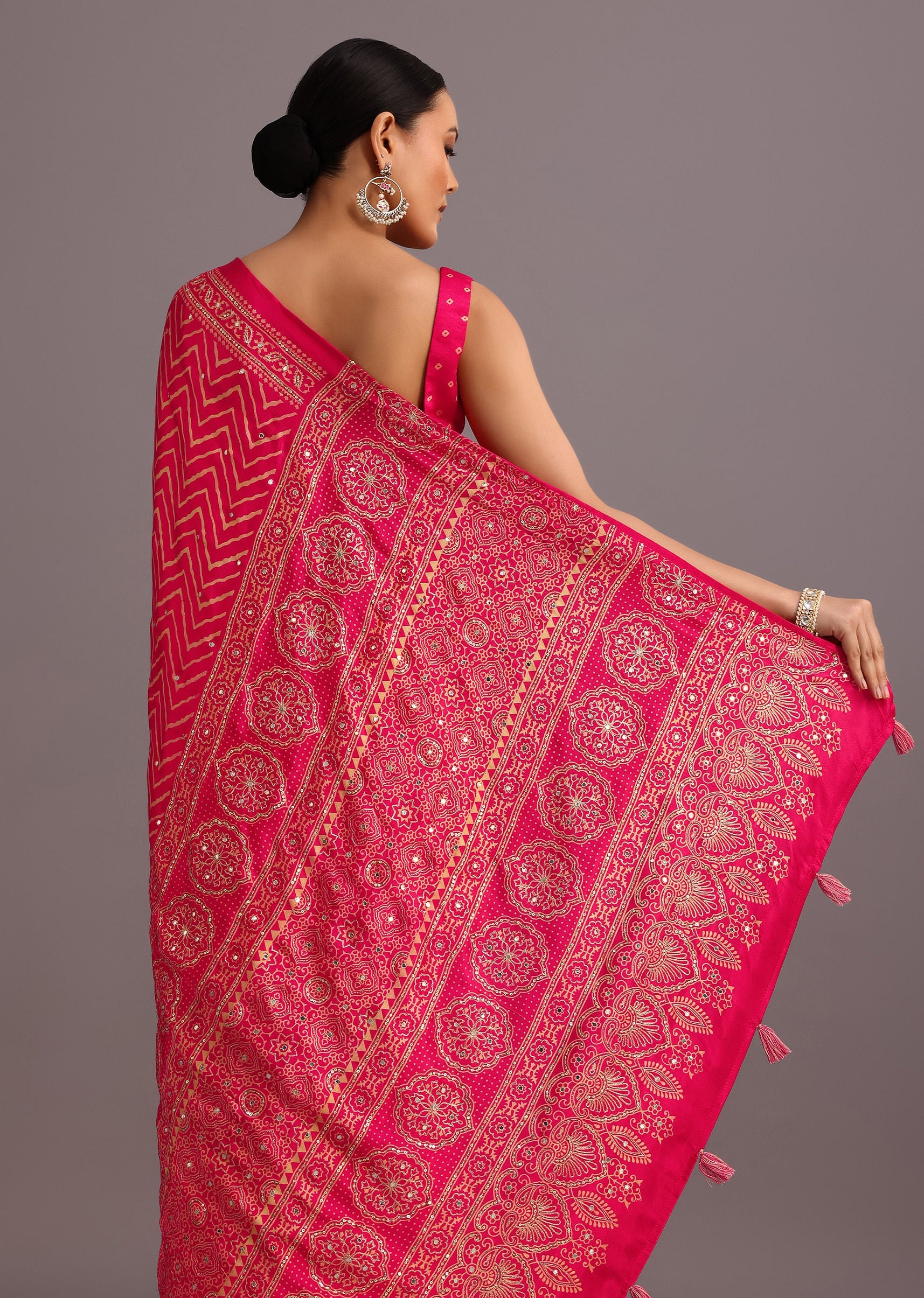 Pink Embroidered Satin Ajrakh Block Print Saree With Mirror Work