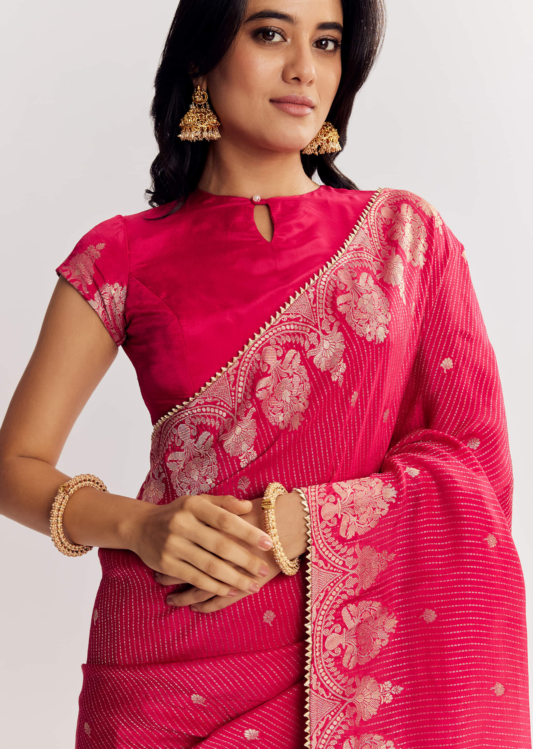 This pink georgette lurex saree shines with woven brocade butti and dazzling gota patti border—crafted for charm and radiance. Awarded as the Most Trusted Brand, we're delivering styles you love, just as promised.