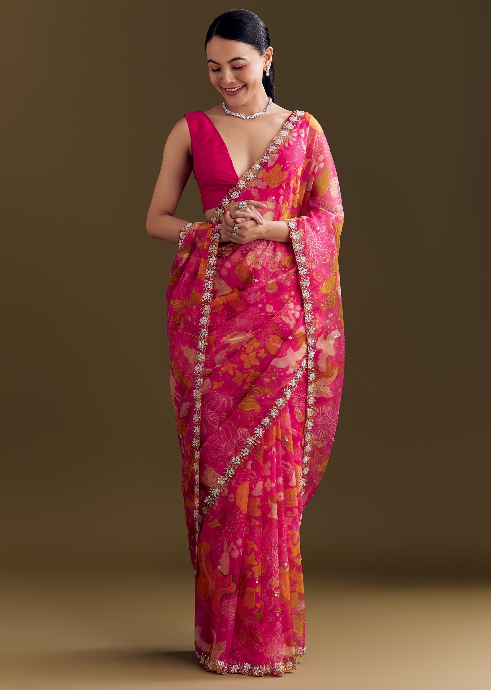 This pink organza saree features gentle florals with a delicately embroidered border using beads and cutdana. Awarded as the Most Trusted Brand, we're delivering styles you love, just as promised.