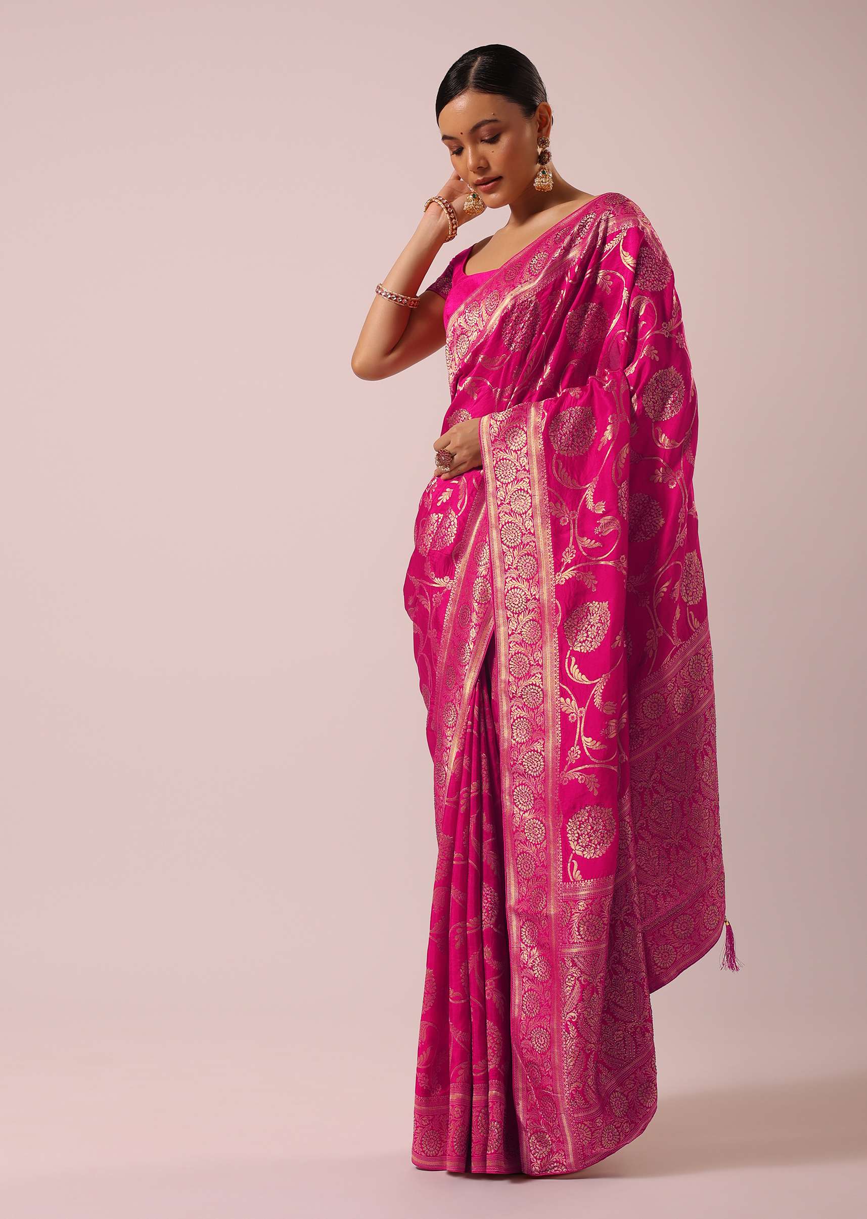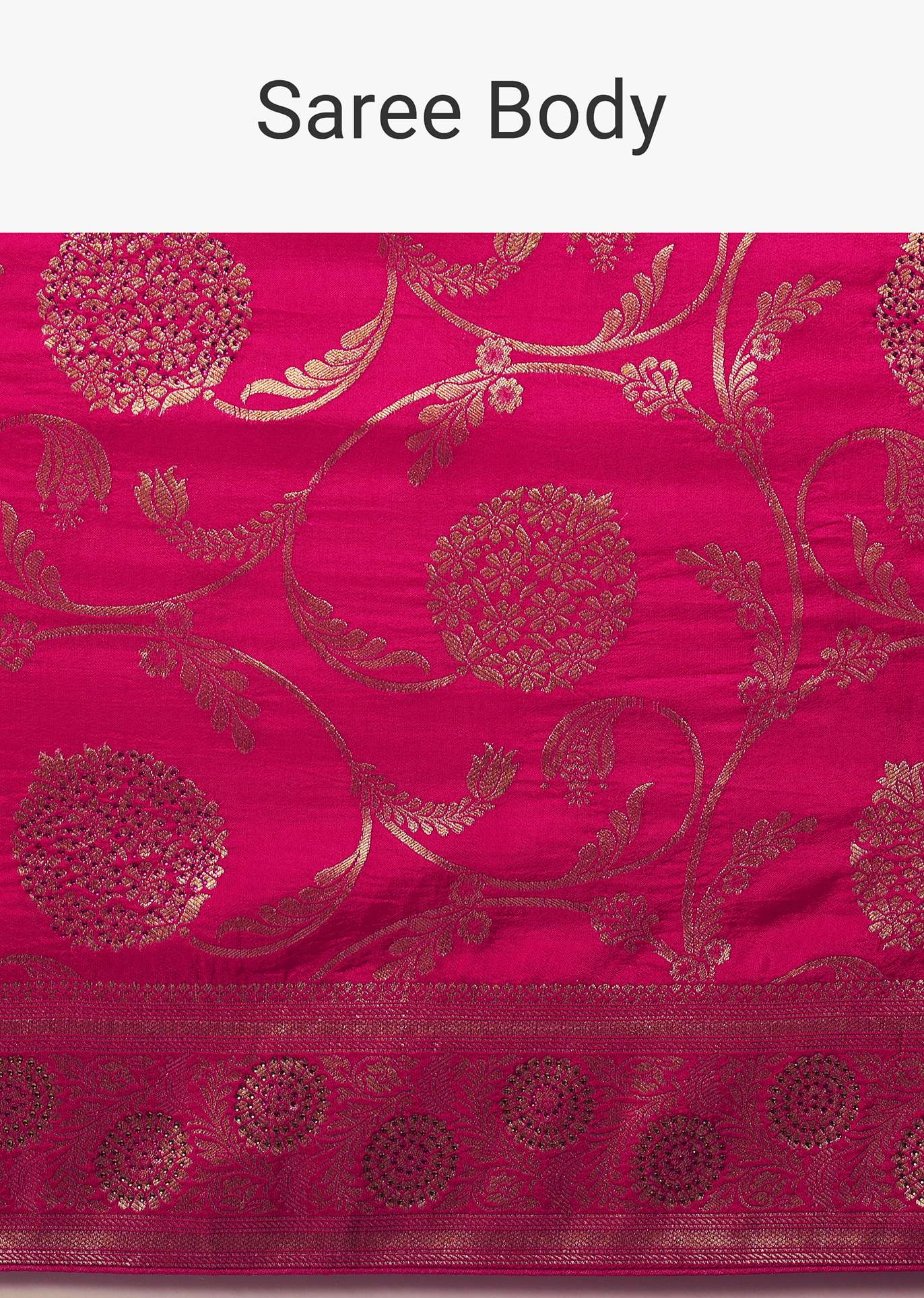 - A captivating medley of old-world charm and stunning hues, this saree flaunts of exquisite floral woven motifs in a jaal pattern.