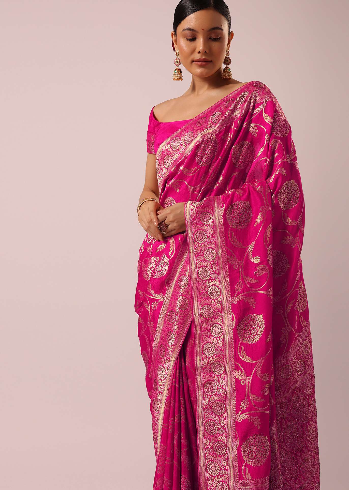 Pink Satin Organza Saree With Floral Jaal Weave