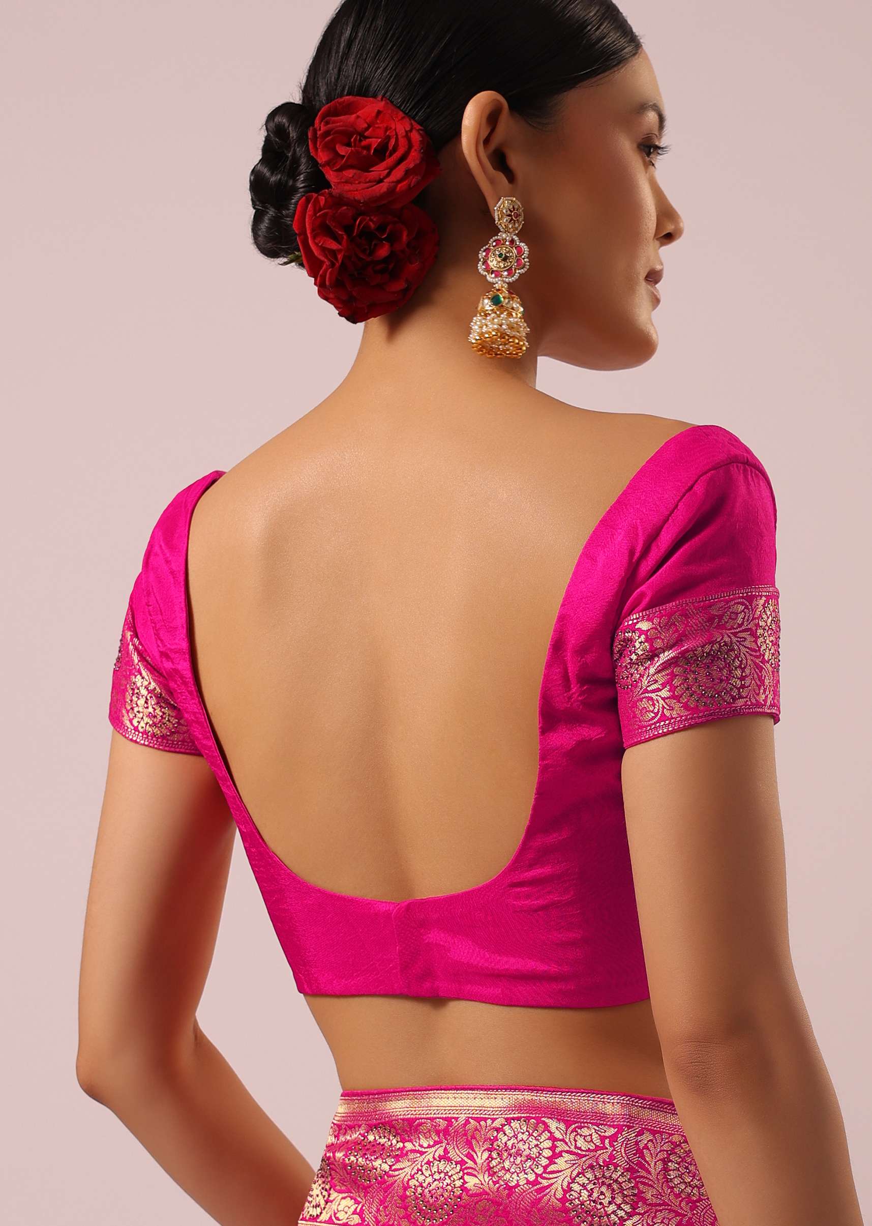 Pair with antique-finish jhumkas, a sleek bun and gold bangles; carry a potli to echo the gota.