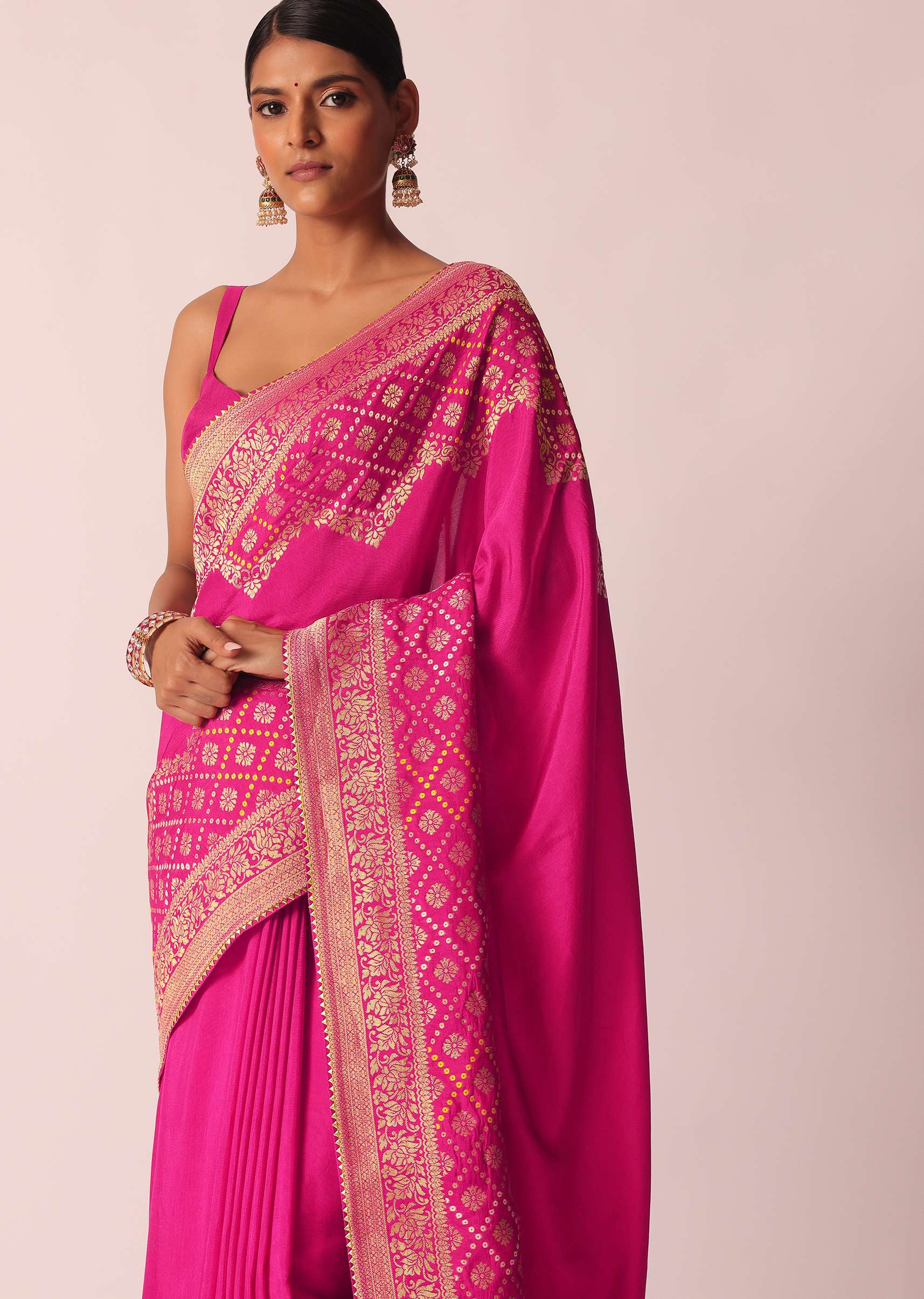 - Expertly crafted on a vibrant rani pink hue, it showcases breathtaking Bandhani detailing and woven motifs.
