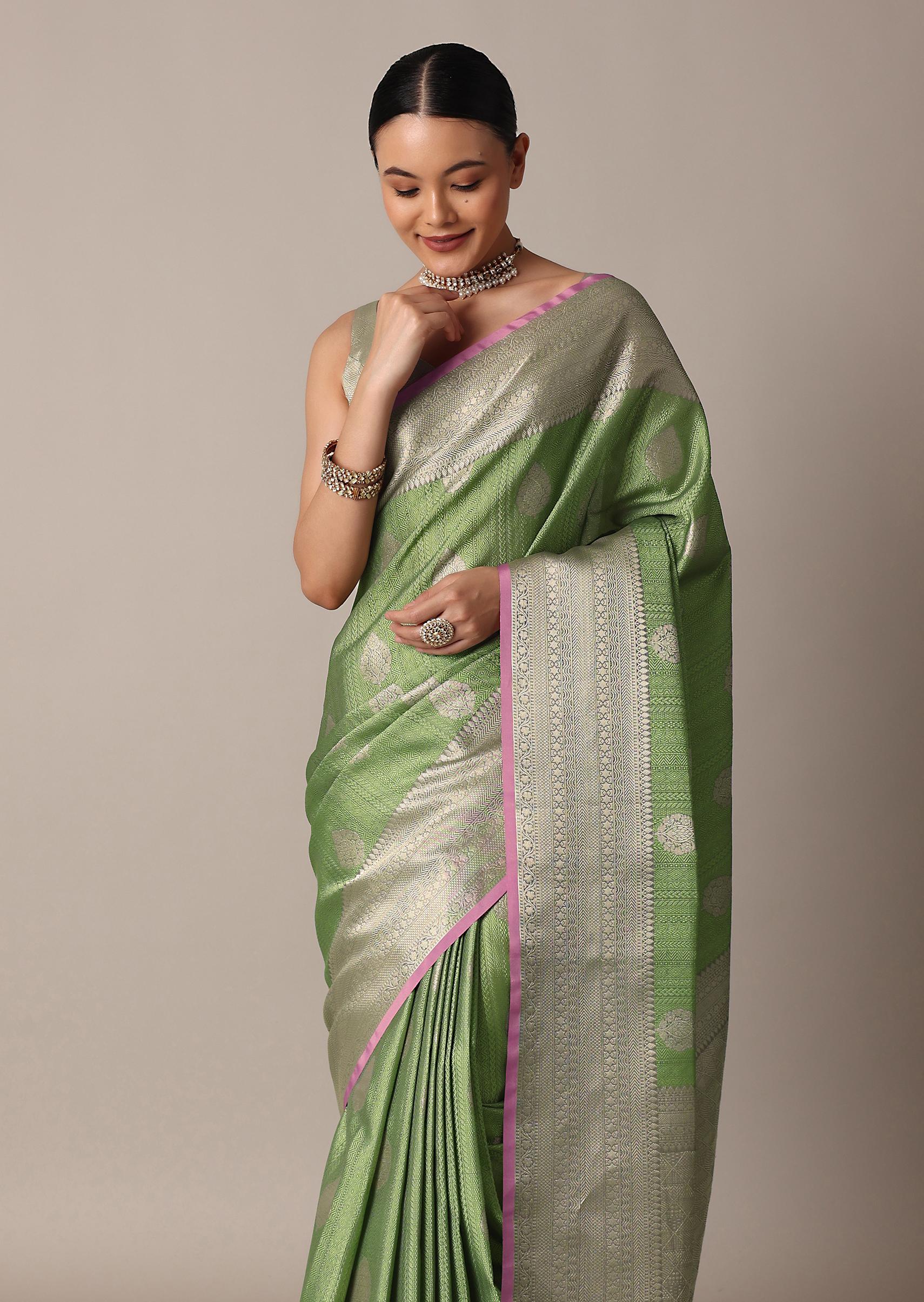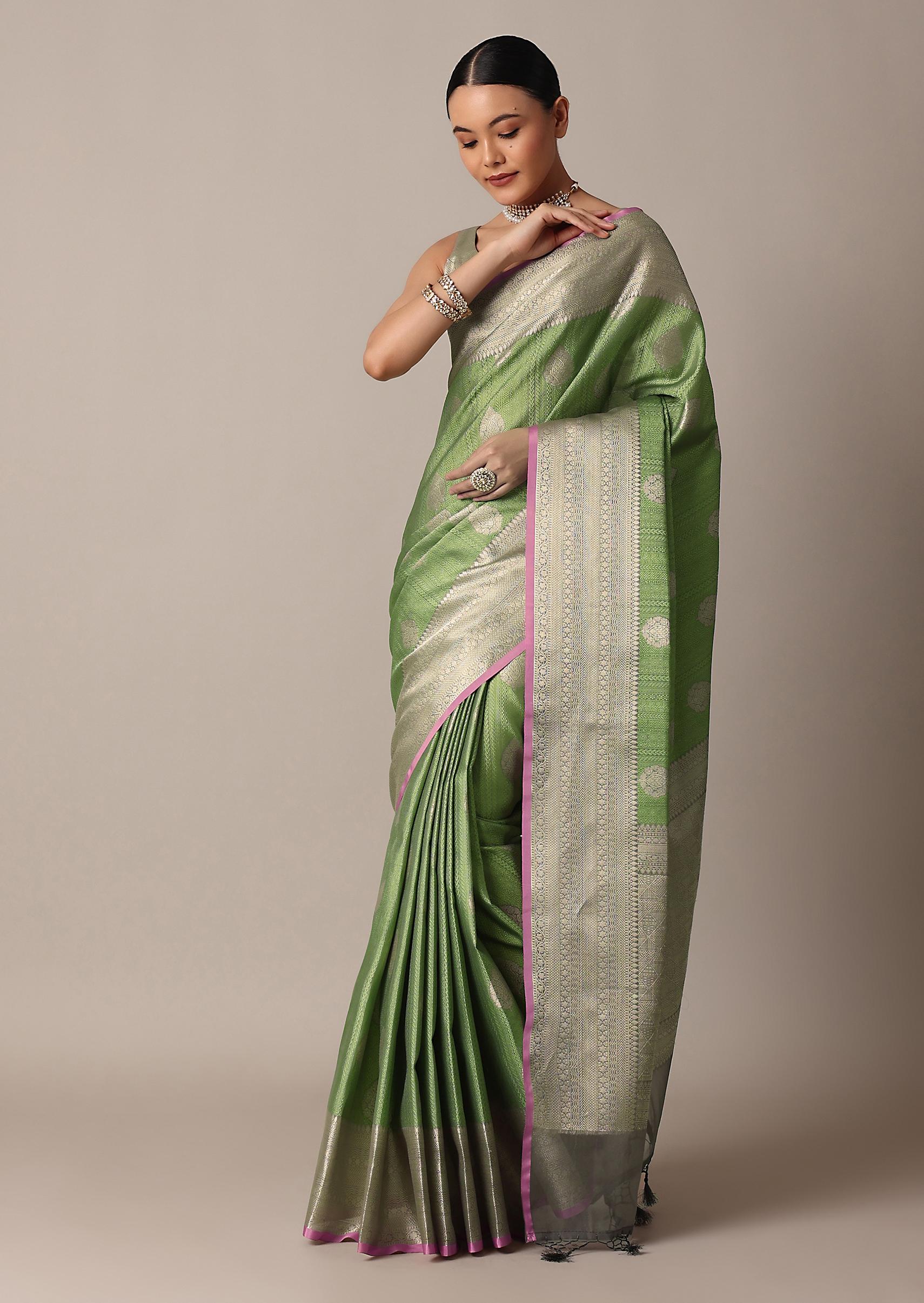 - Guaranteeing a boost to your style and confidence is this luxurious green saree.