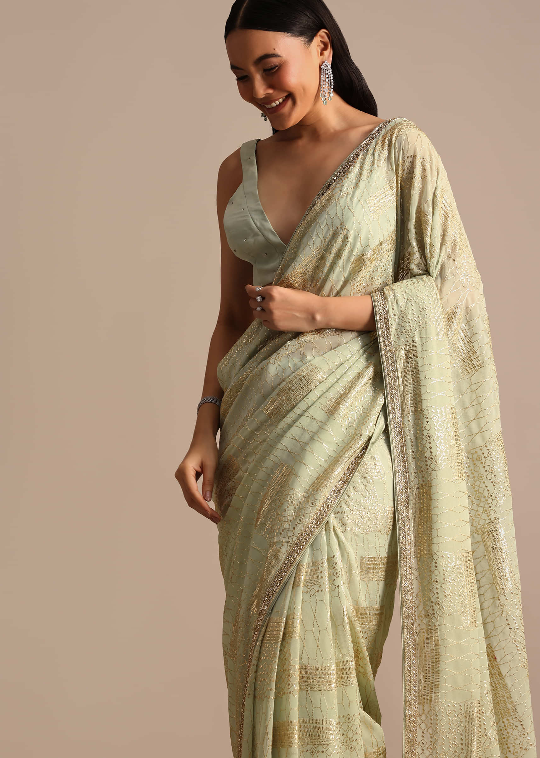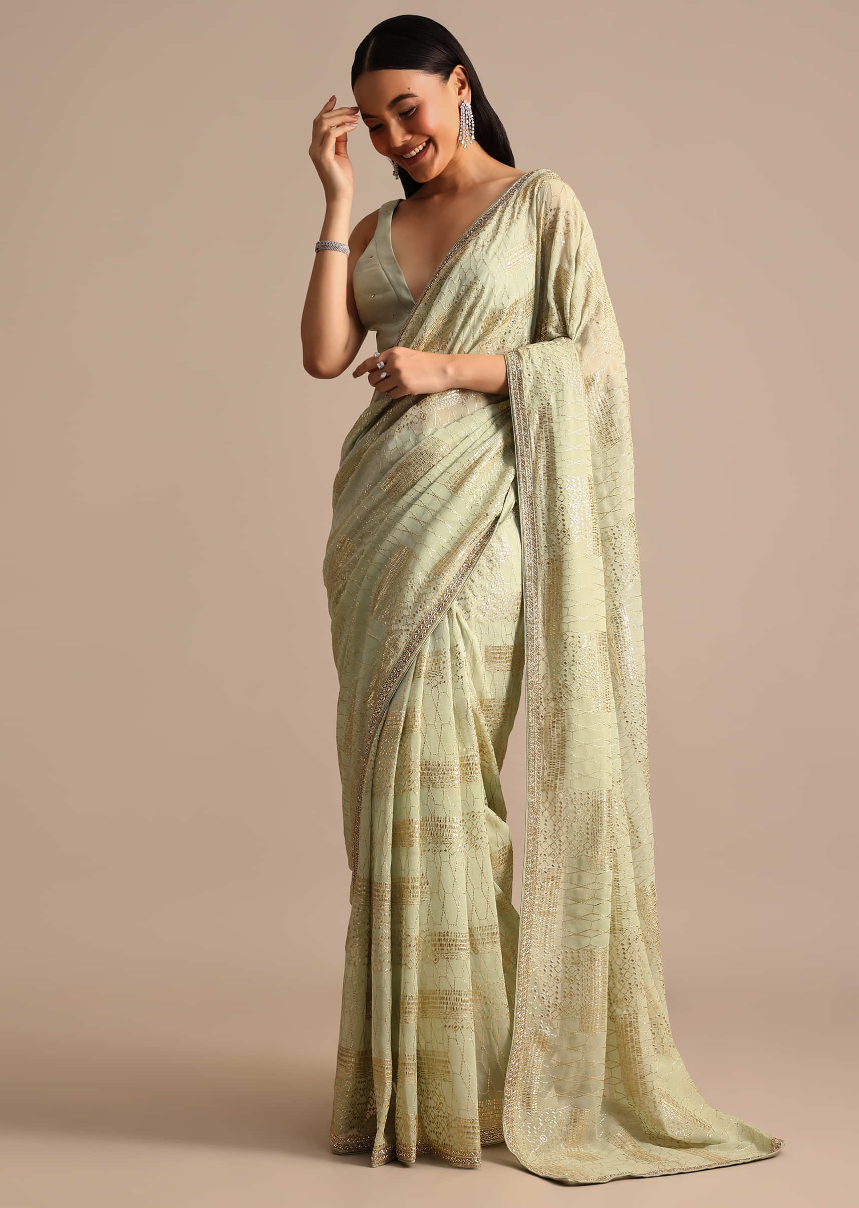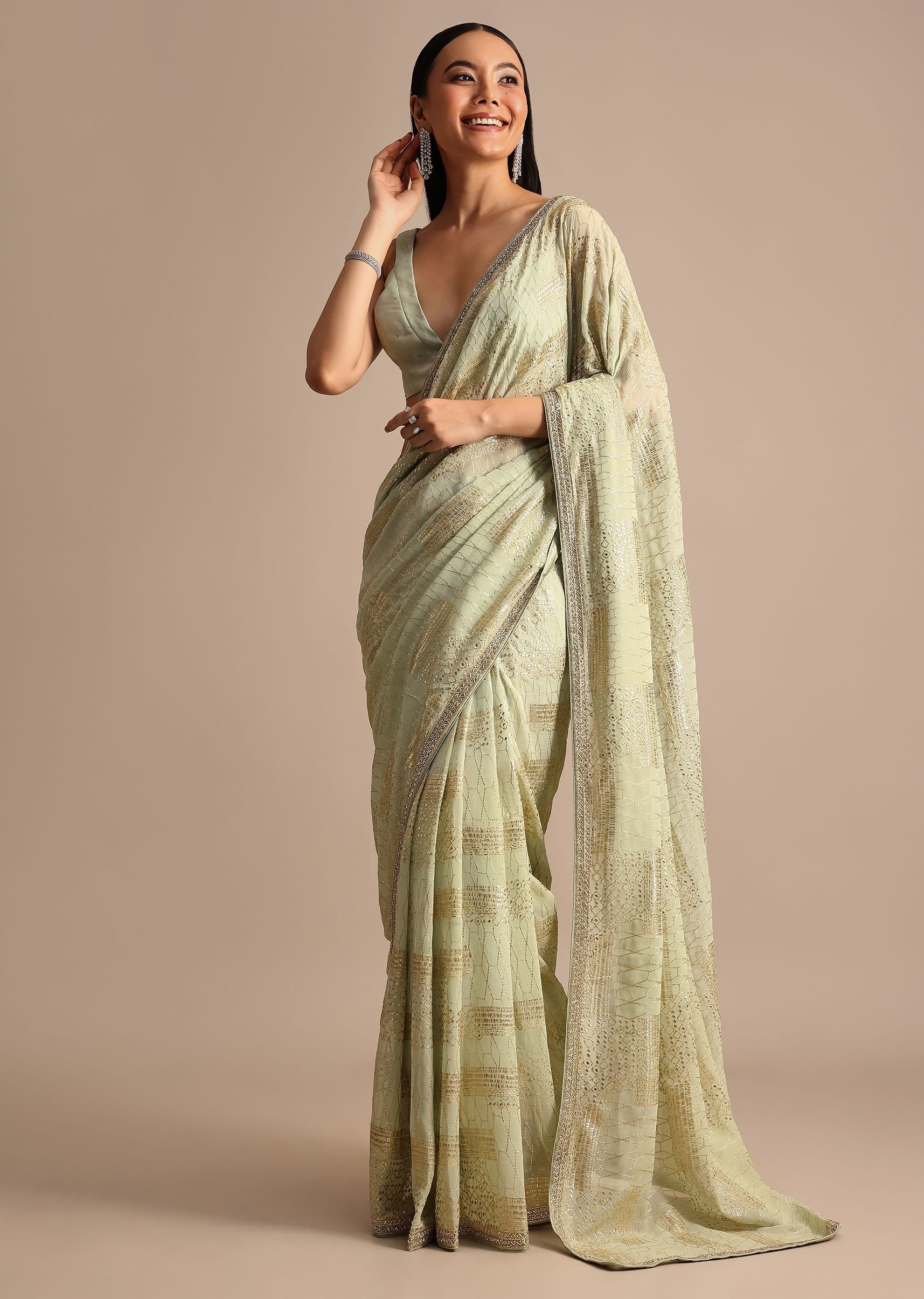 Pista Green Embroidered Georgette Saree With Unstitched Blouse