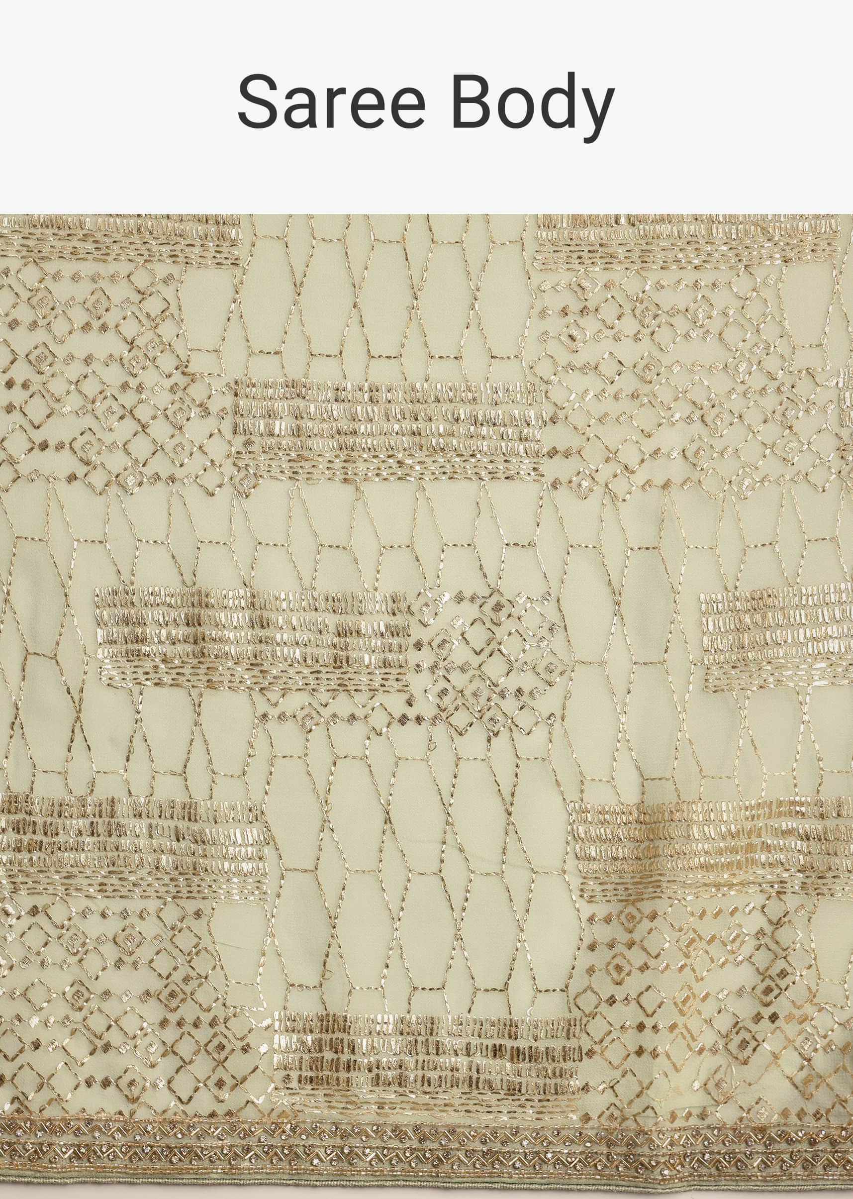 - This saree is made on a georgette fabric and adorned with intricate badla work that shimmers with every step.