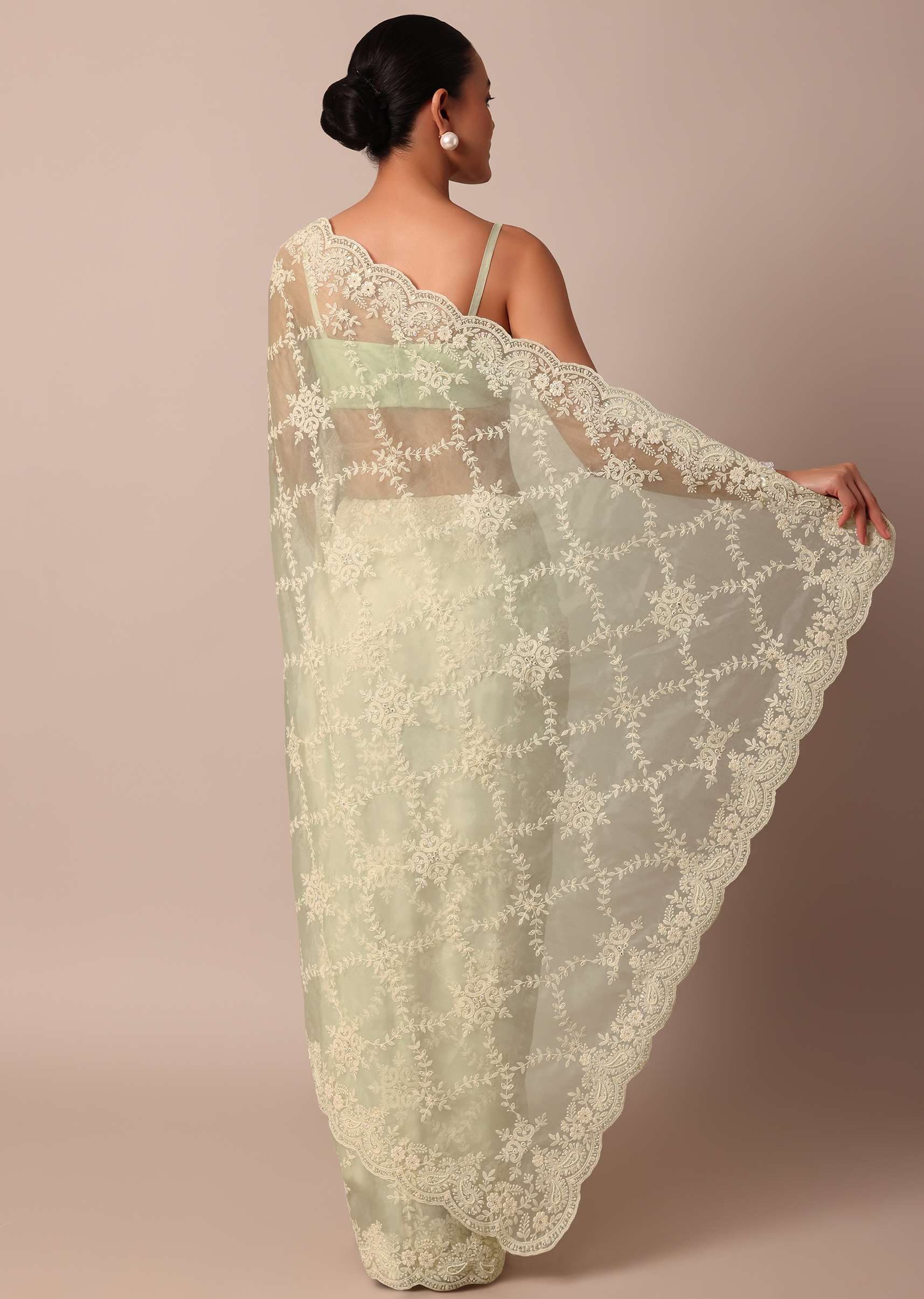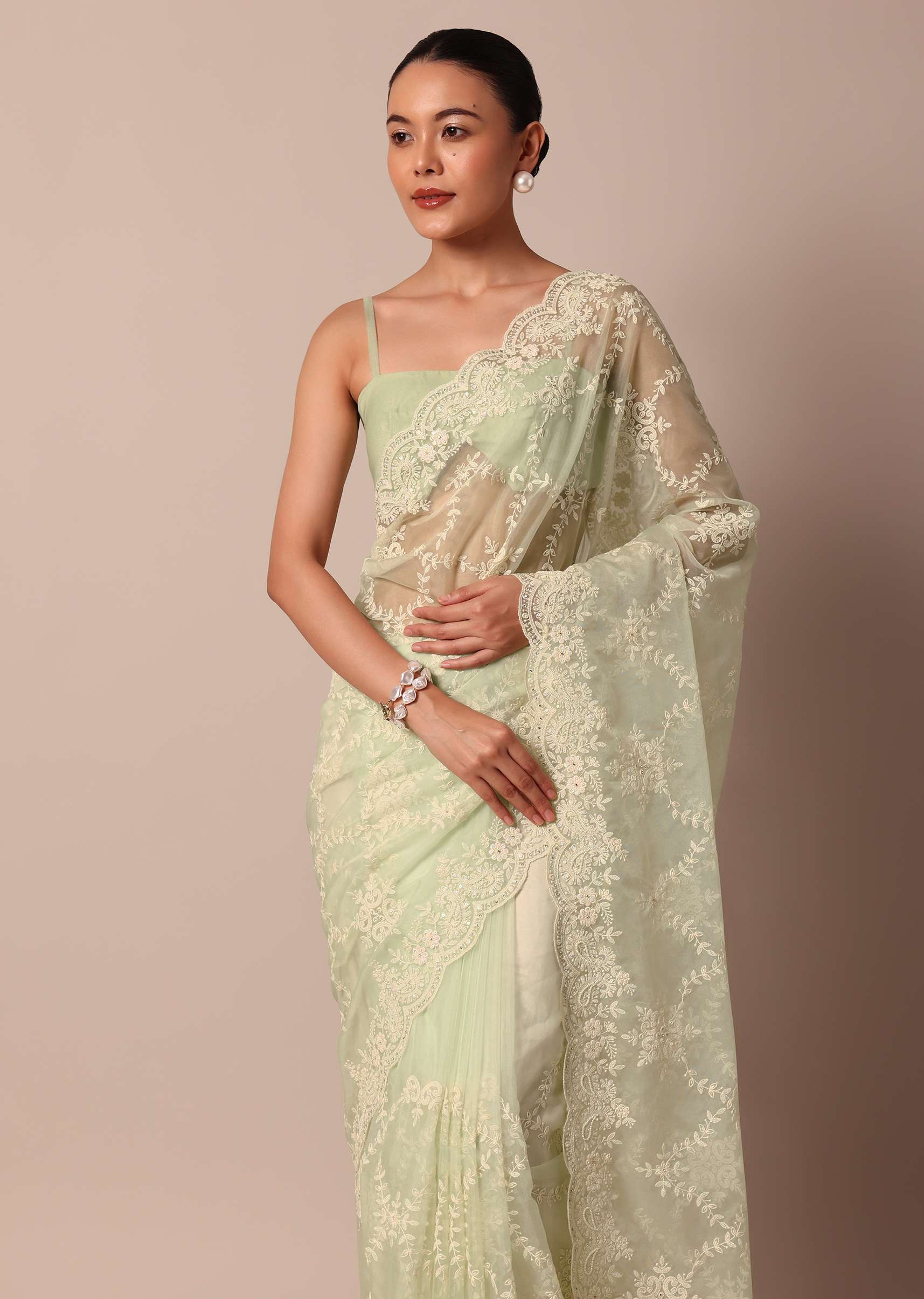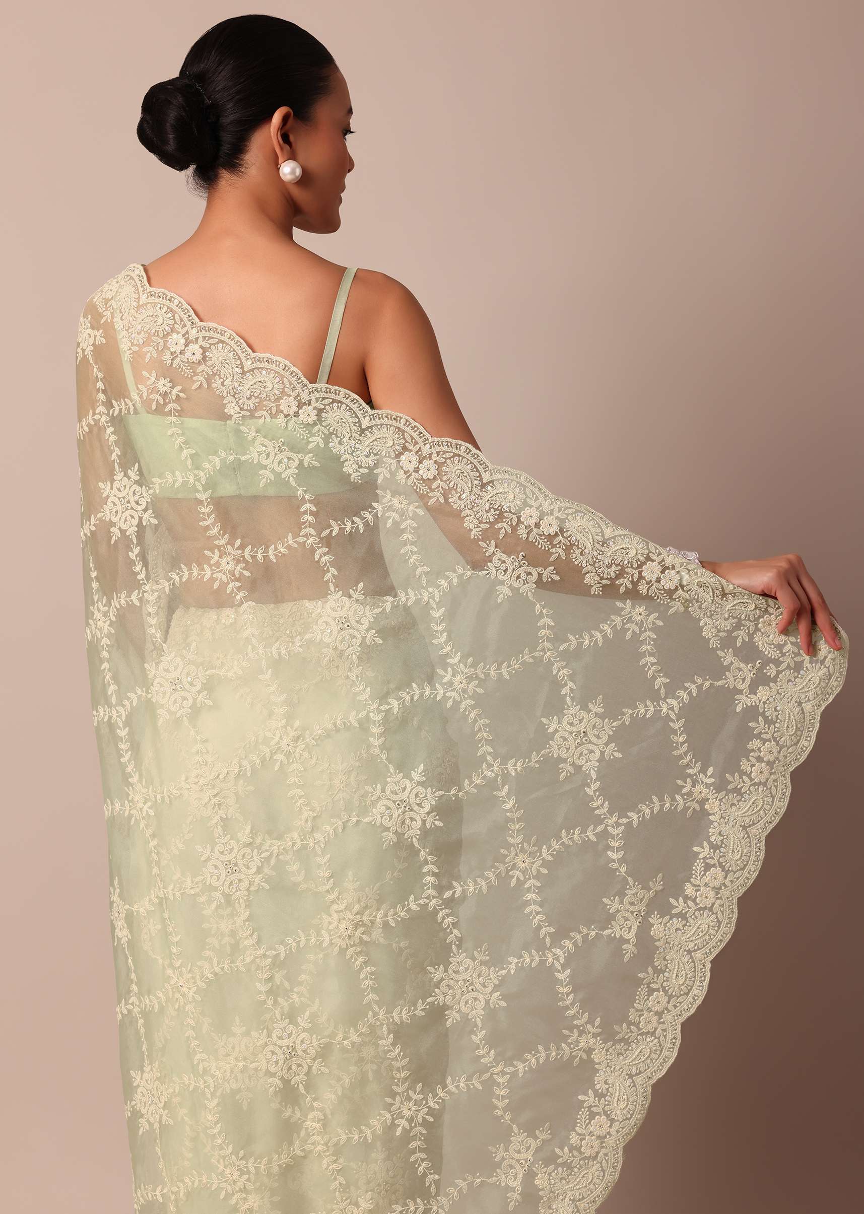 - Strike a fashionable pose in this chic and elegant sheer green saree.
