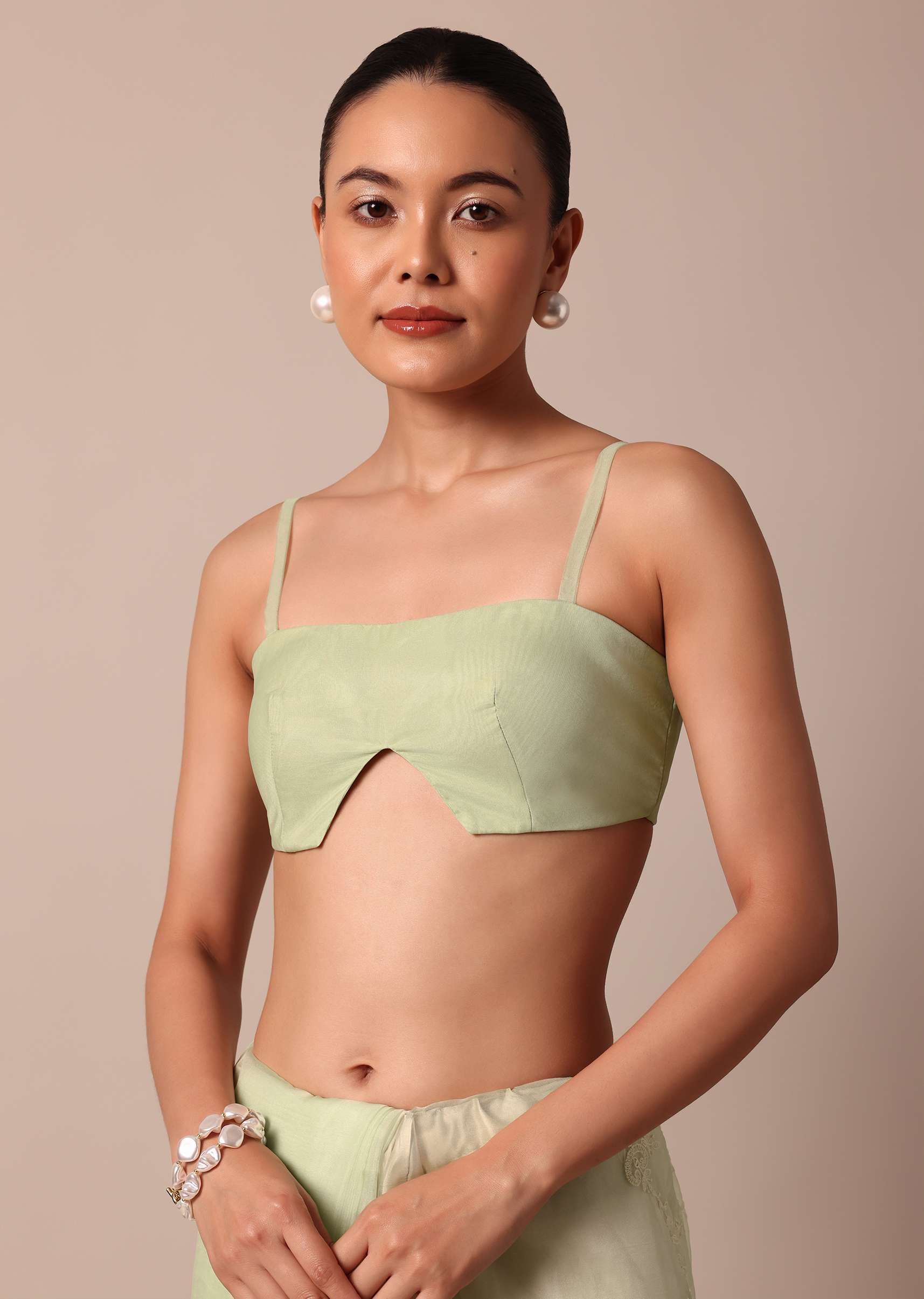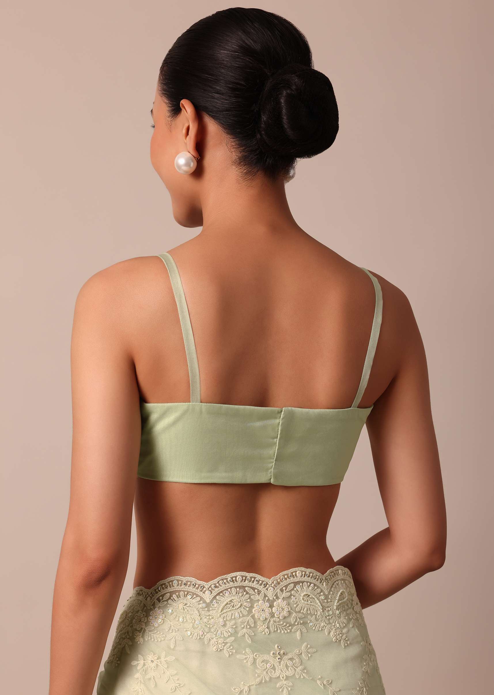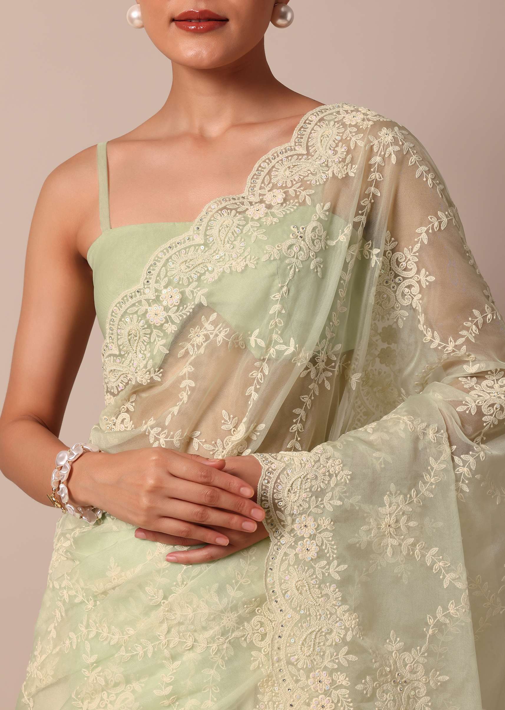 - Strike a fashionable pose in this chic and elegant sheer green saree.