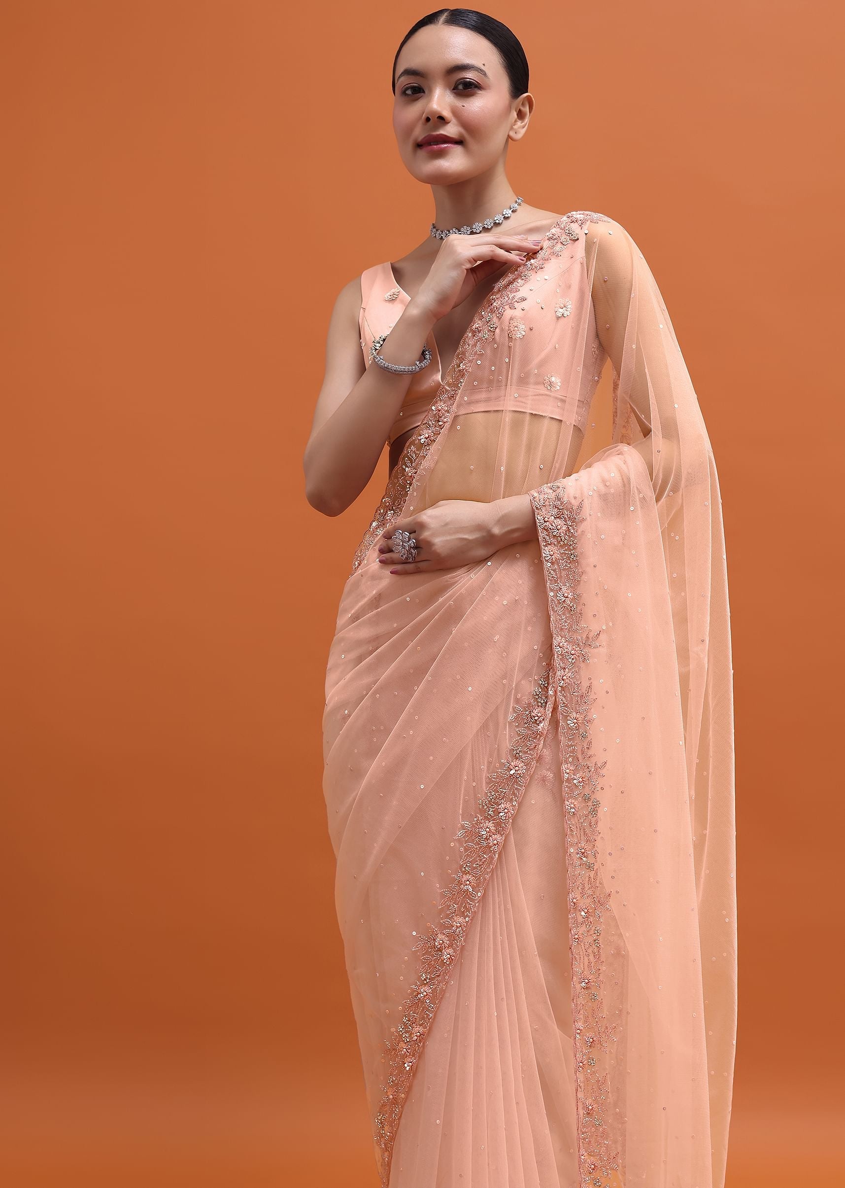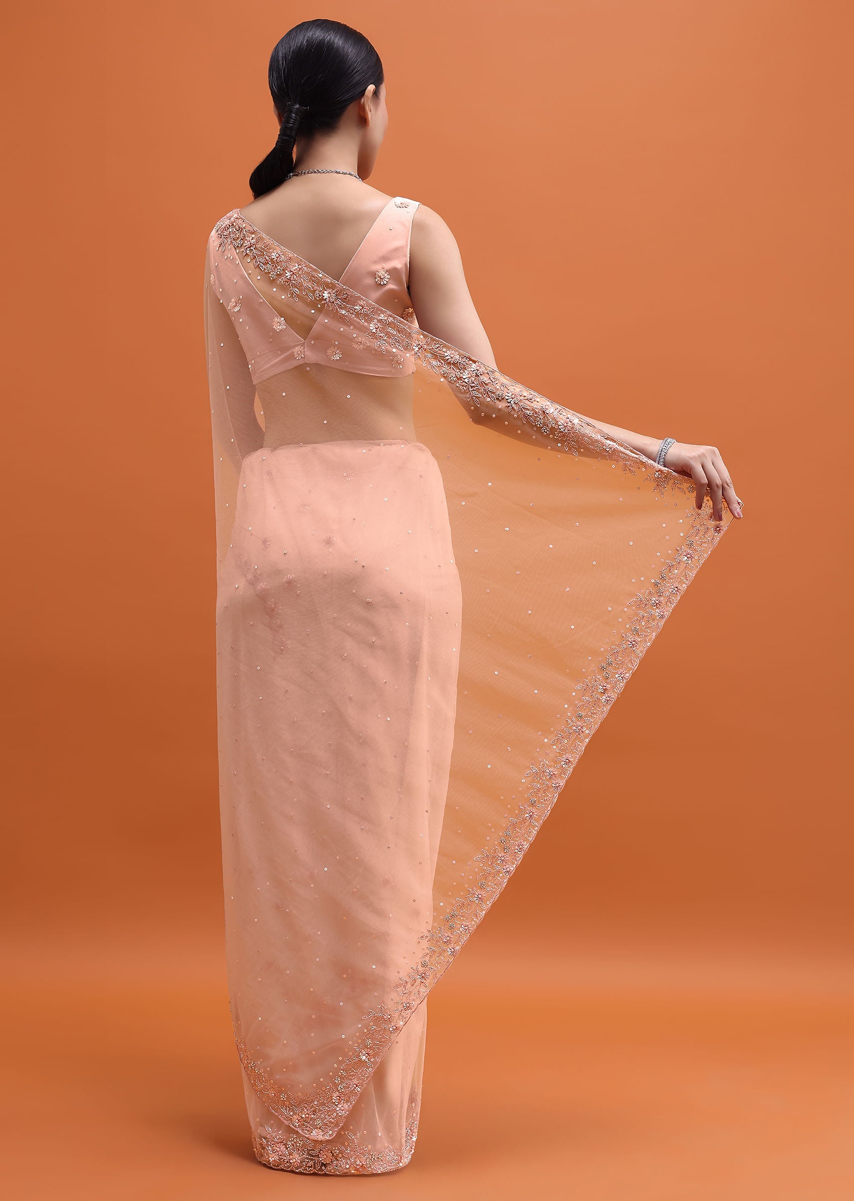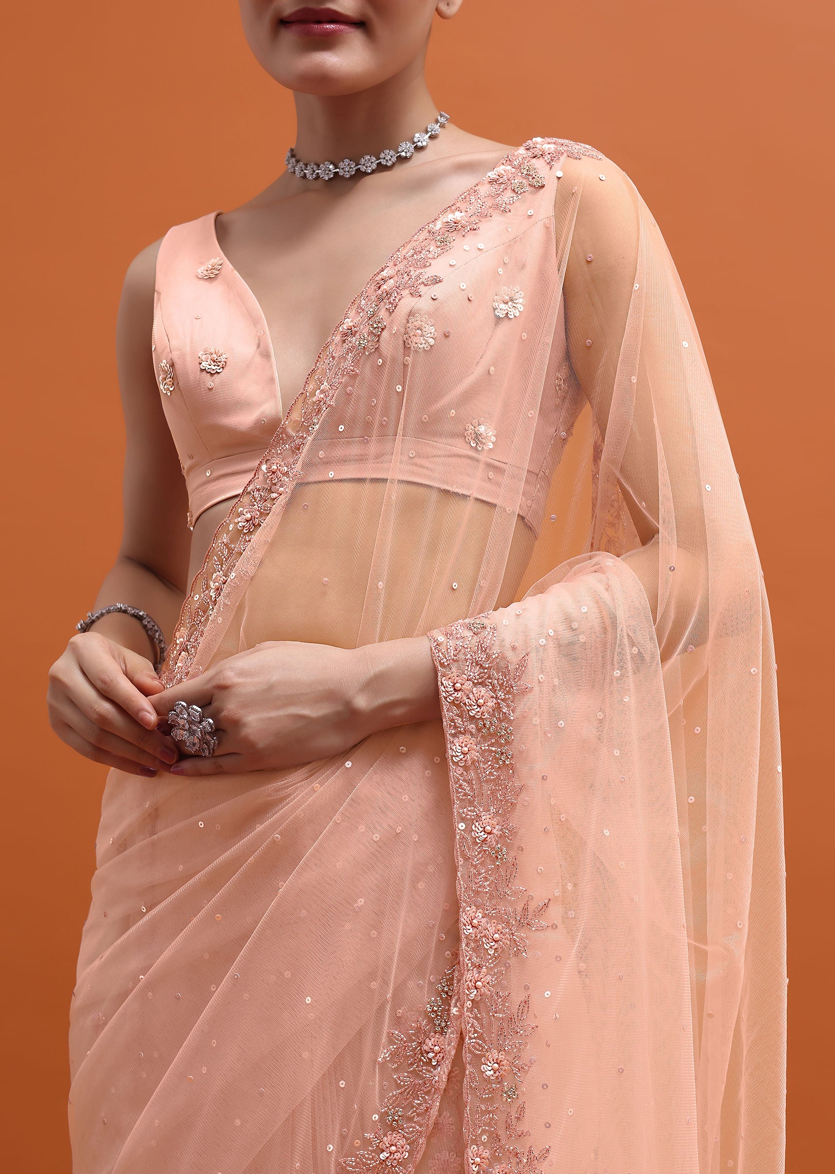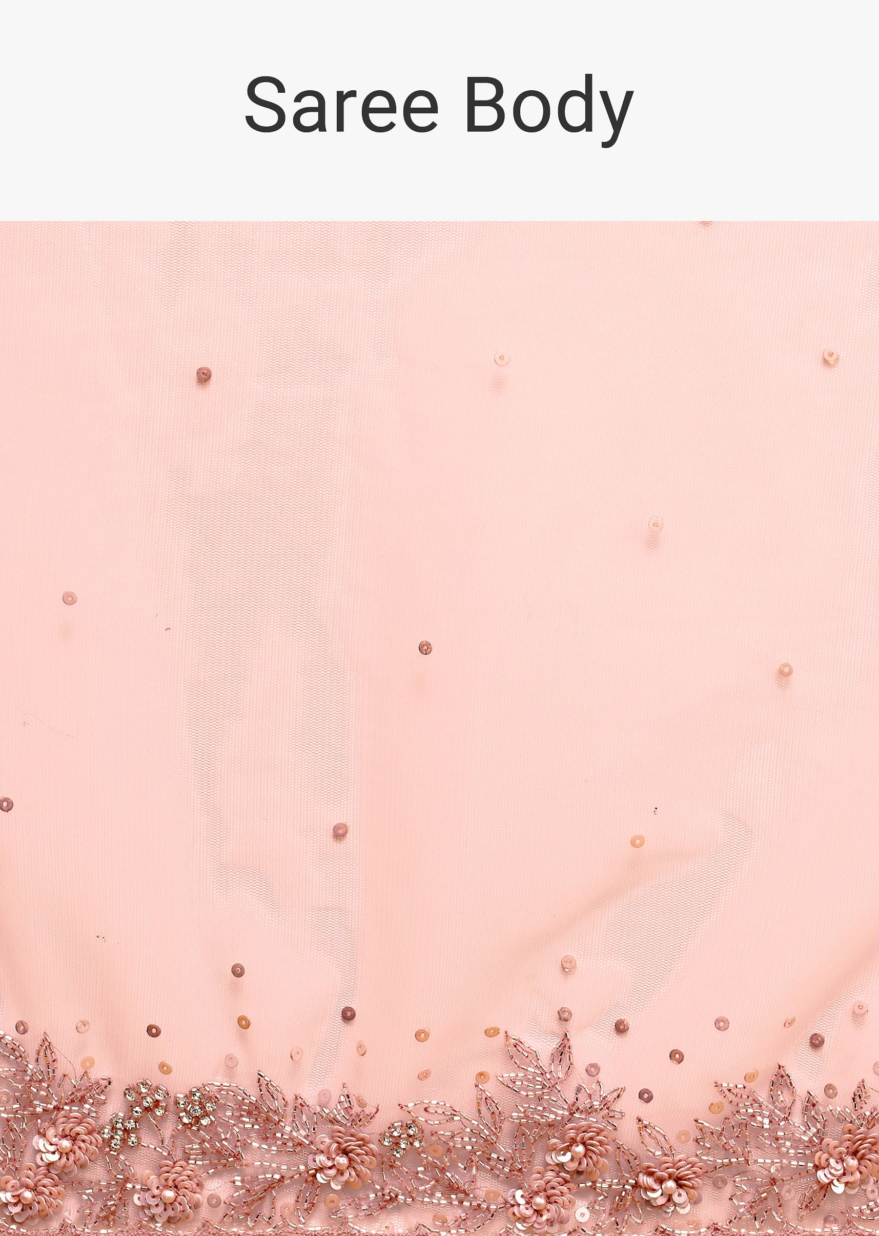 Powder Pink Embroidered Net Saree With Unstitched Blouse