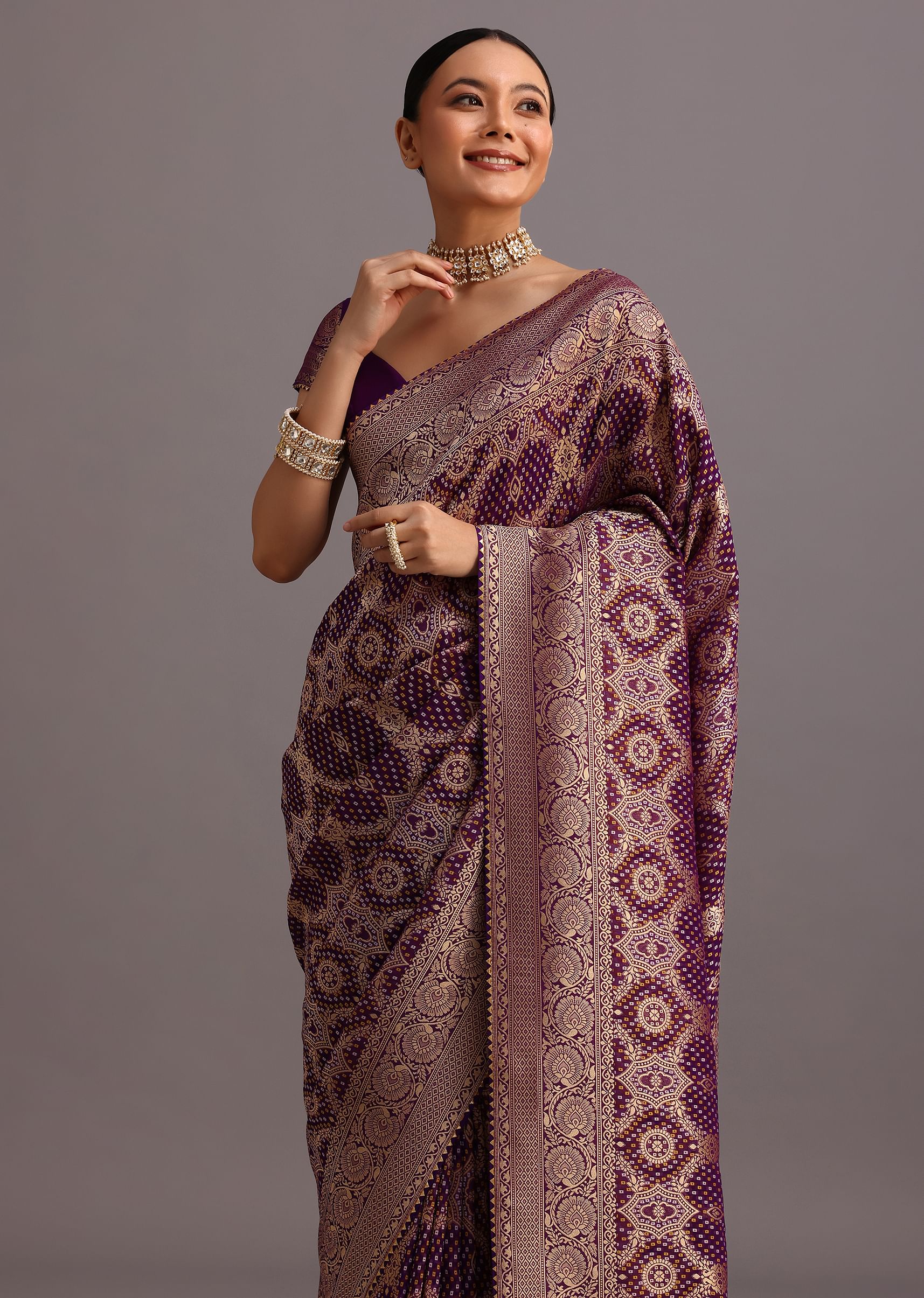 Purple Khaddi Georgette Woven Saree In Bandhani Detail With Gotta Patti Border