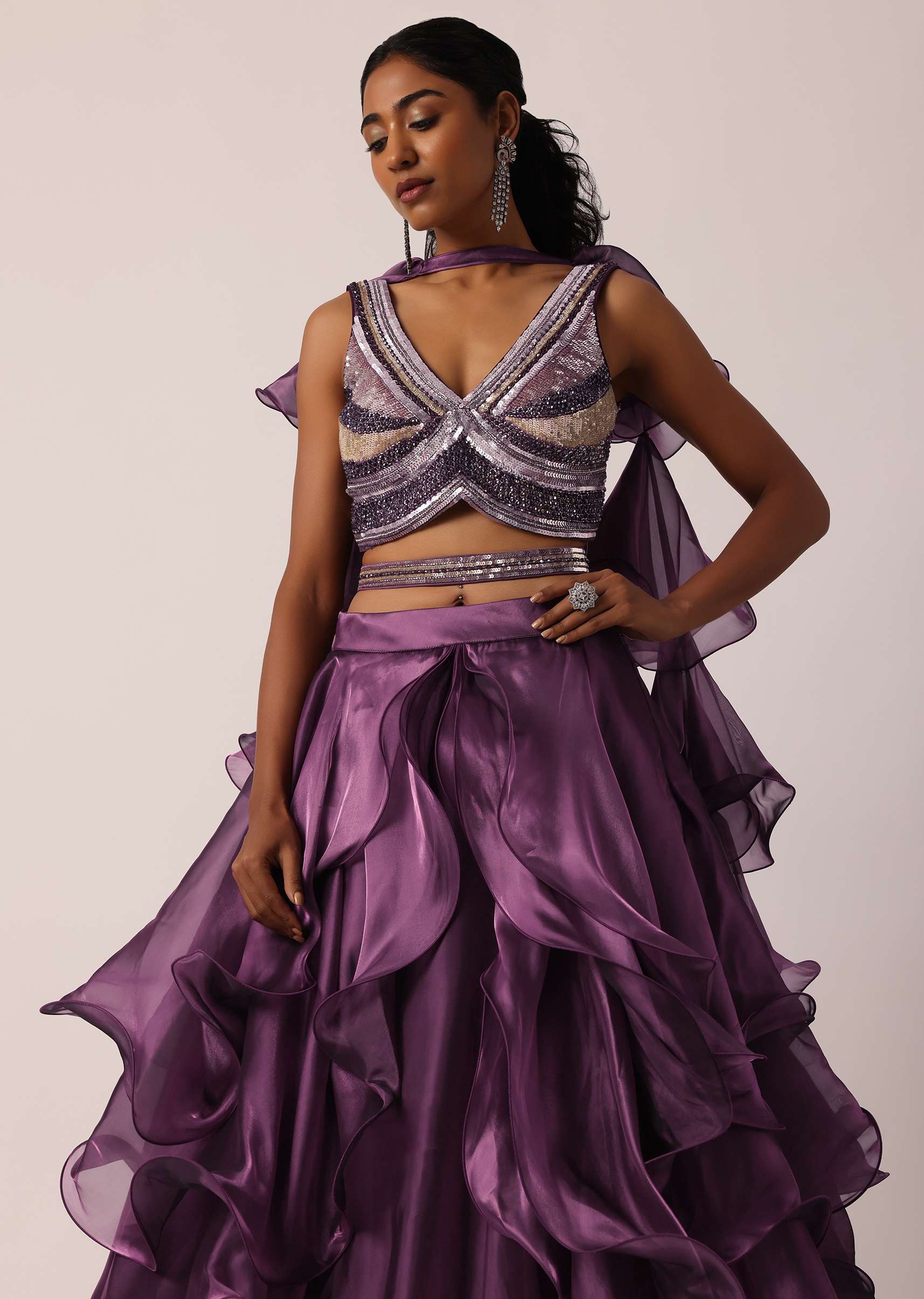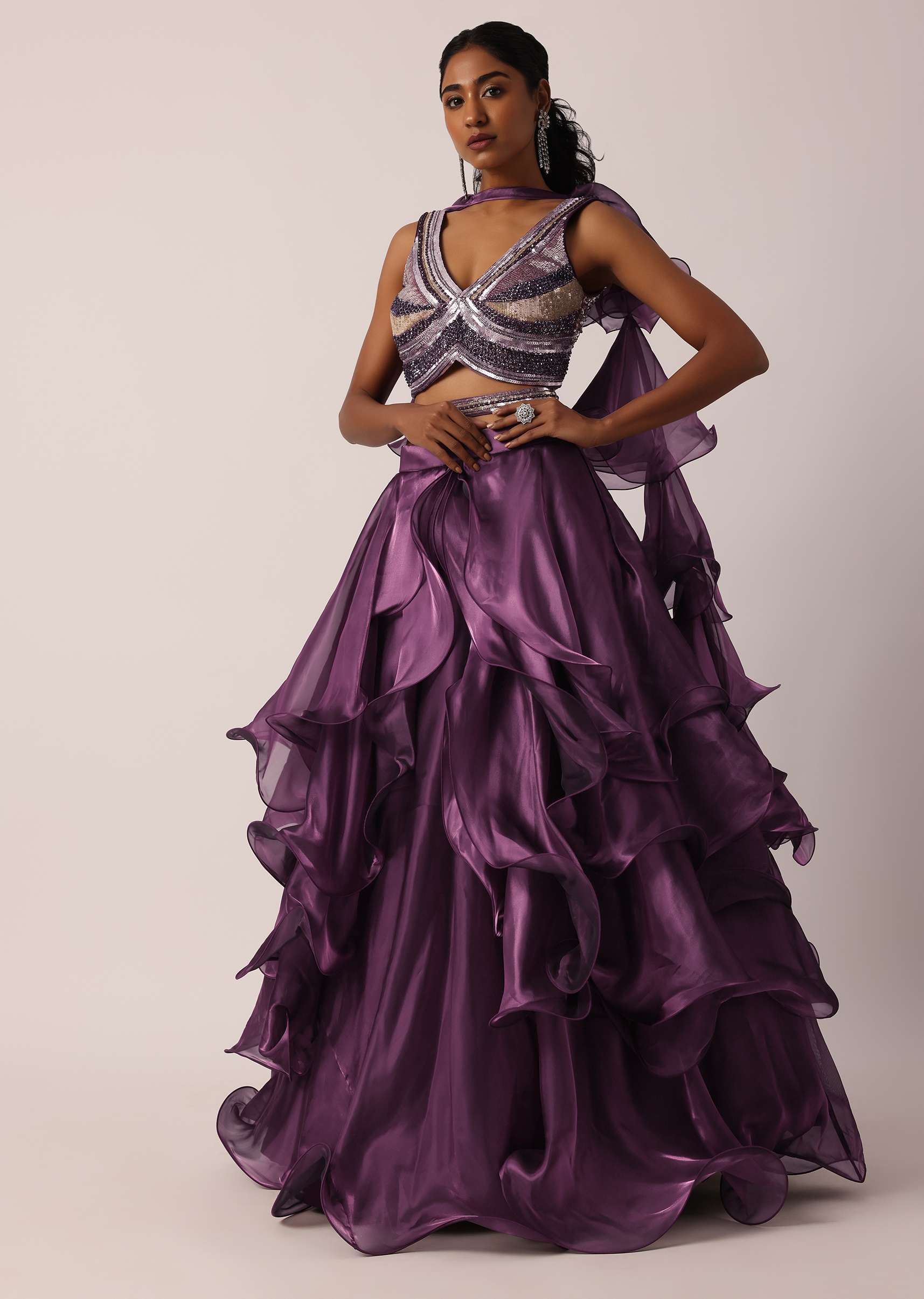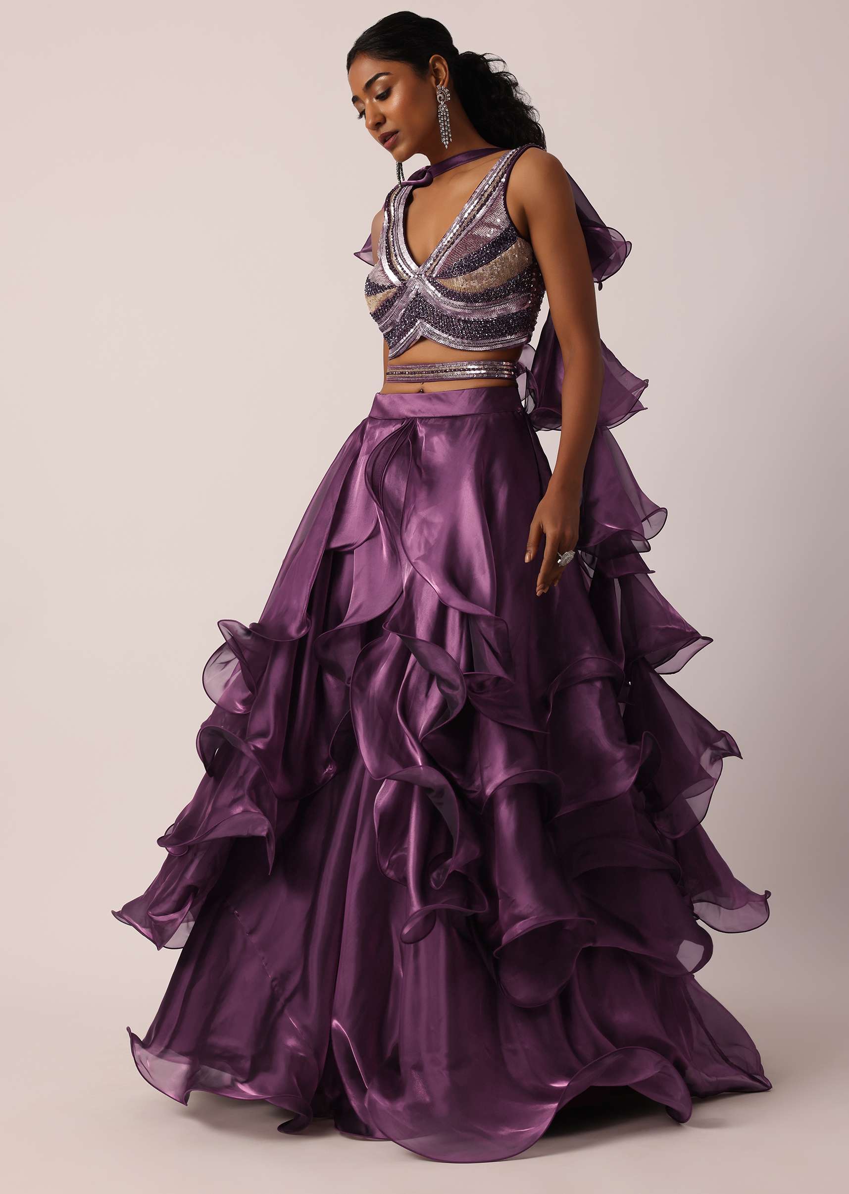Purple Layered Ruffle Lehenga Set With Sequin Work