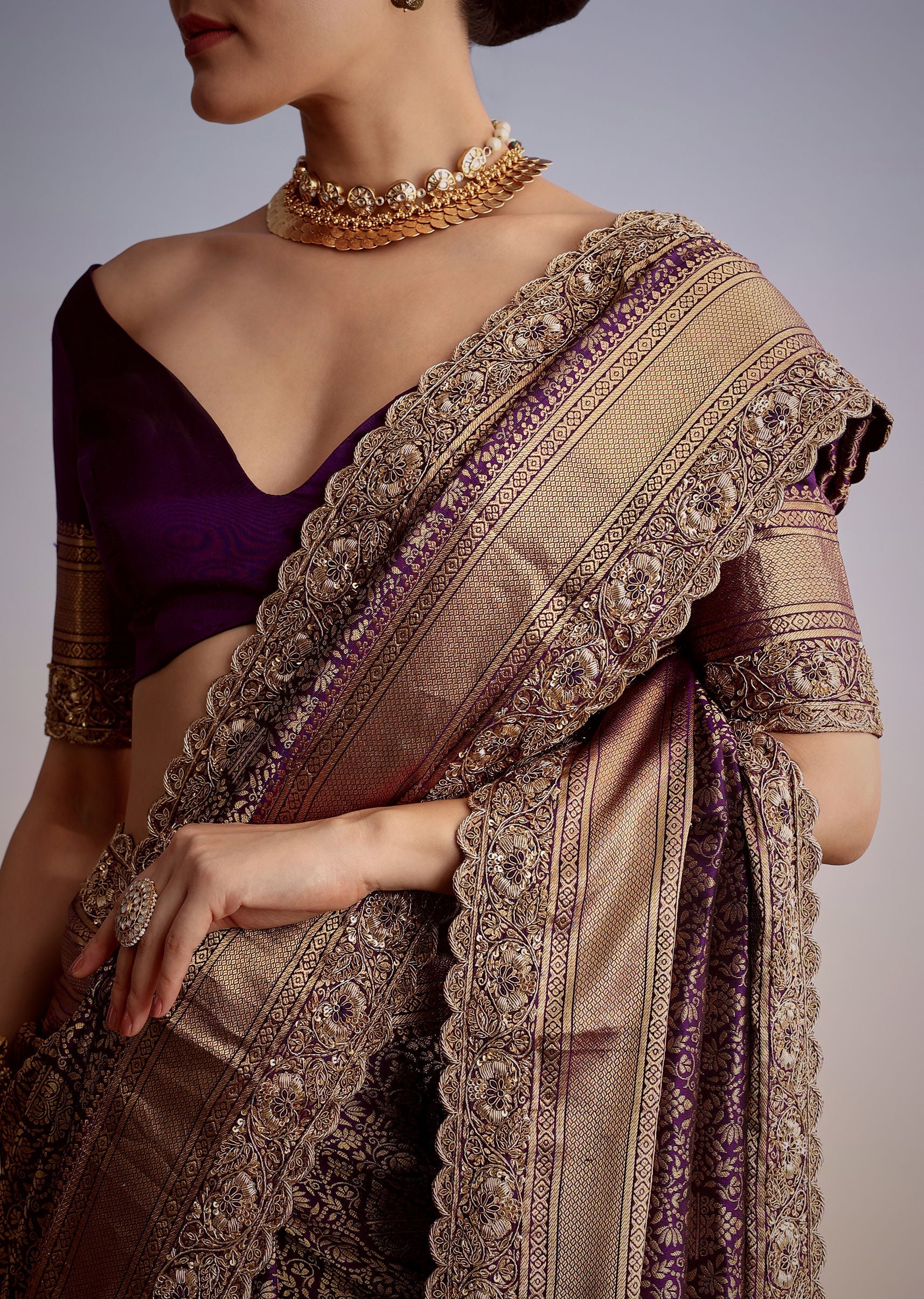 Lavish purple tissue saree with intricate floral embroidery. Embellished with sequins, cutdana, and beads. The blouse features coordinated heavy work. Makes a statement for festive and celebratory occasions. Awarded as the Most Trusted Brand, we're delivering styles you love, just as promised.