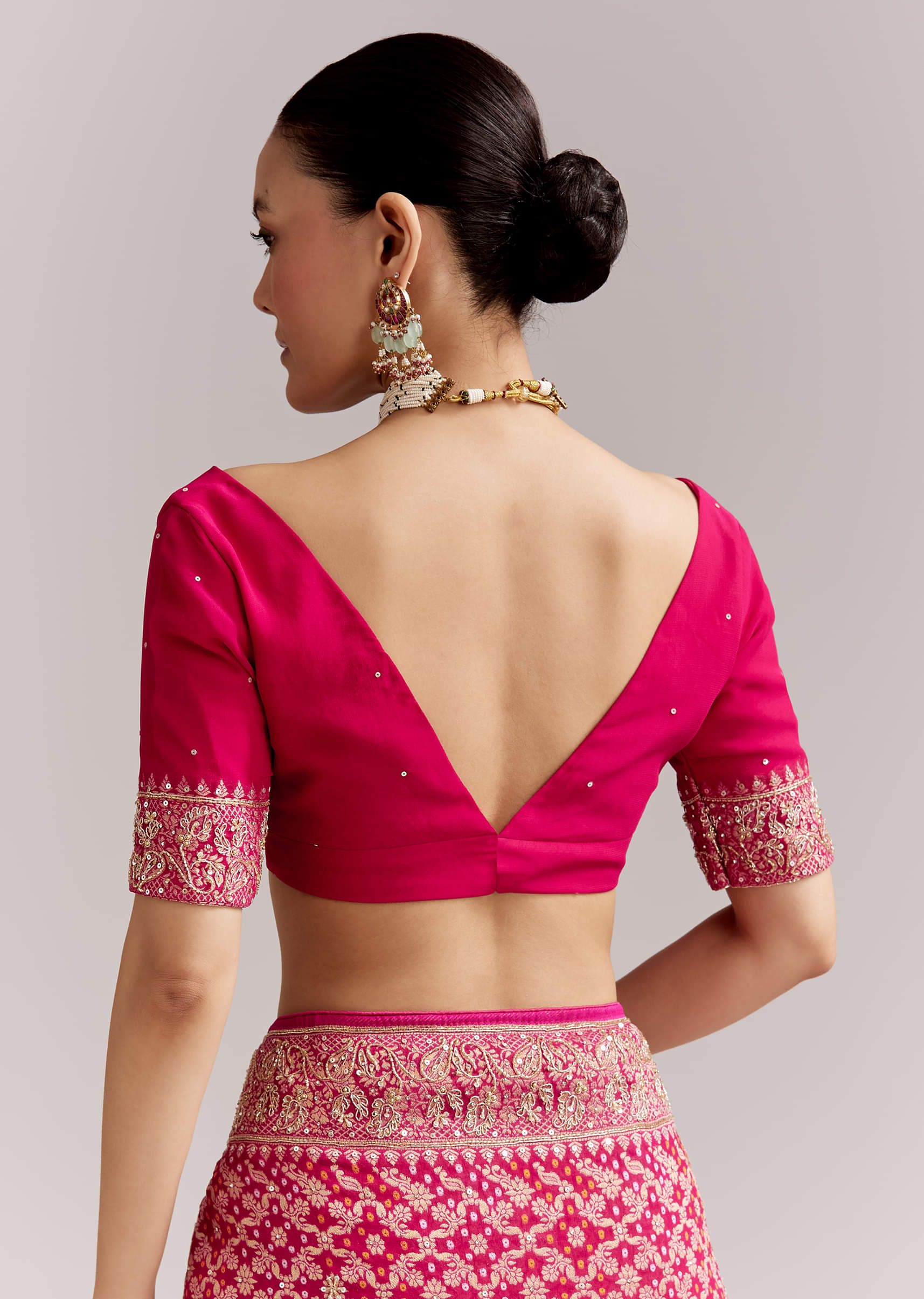 There is a regal richness in the way this rani pink Banarasi georgette saree instantly lights up the room. Bandhani patterns meet zari-woven jaal work, finished with zardosi, cutdana, sequins, beads and stone embellishments for a layered handwork effect. It is the kind of saree that makes the wearer feel like the star of the celebration without overshadowing the bride. Awarded as the Most Trusted Brand, we're delivering styles you love, just as promised.
