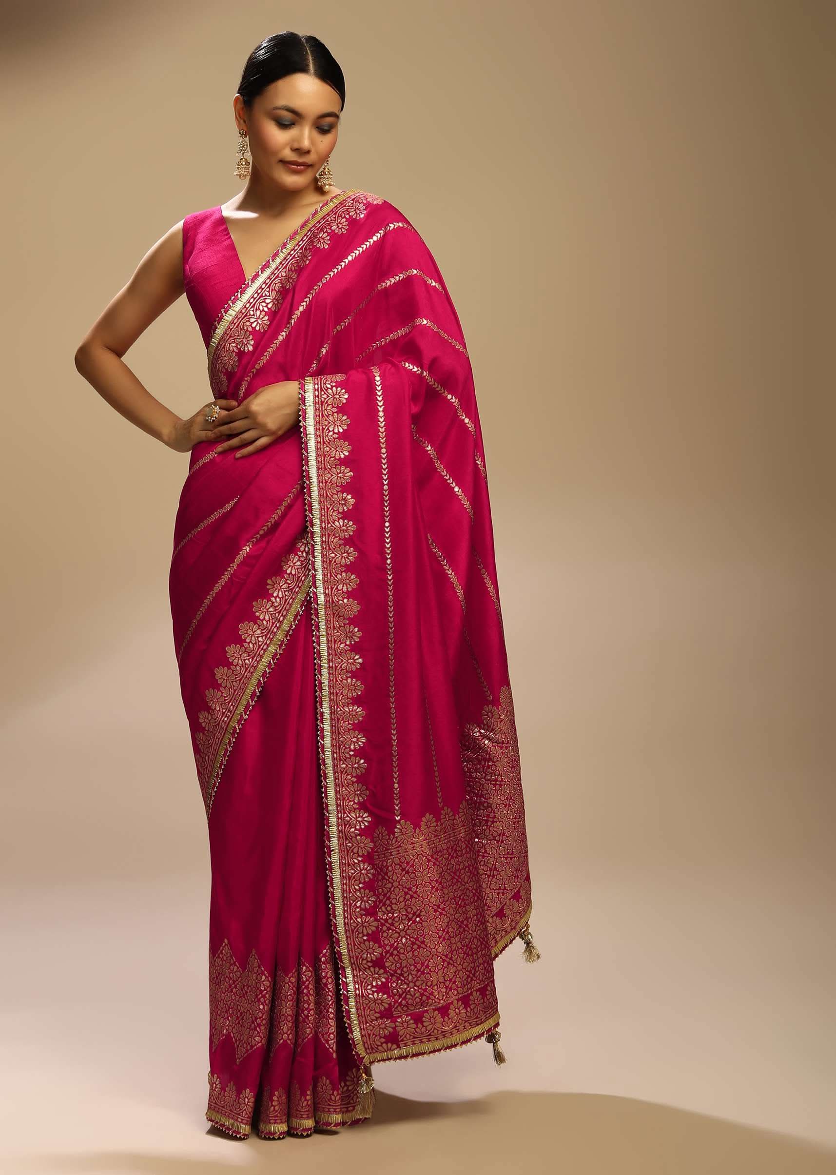 - Rani pink saree in silk with ethnic motifs woven in striped design.