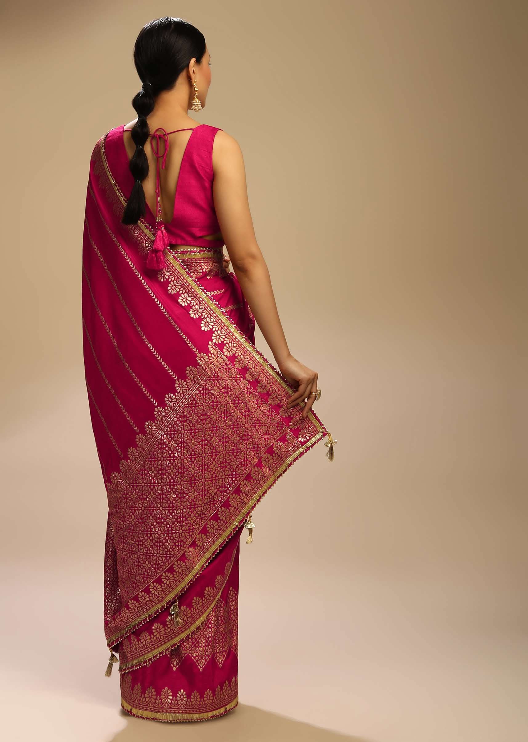 Rani Pink Saree In Silk With Woven Stripes Floral Motifs On The Border