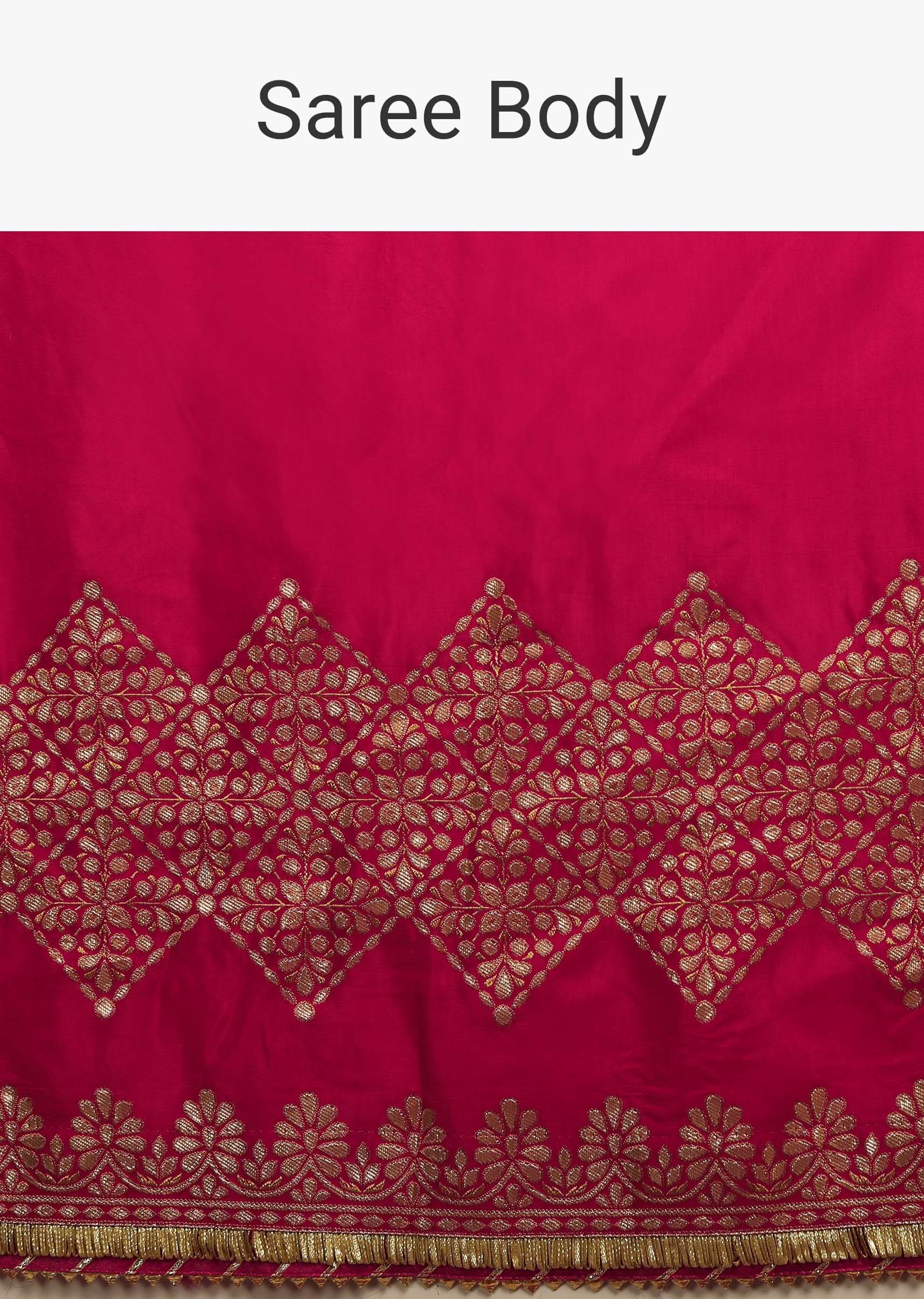 - The border and pallu are adorned with woven geometric and floral motifs along with gotta lace trims.
